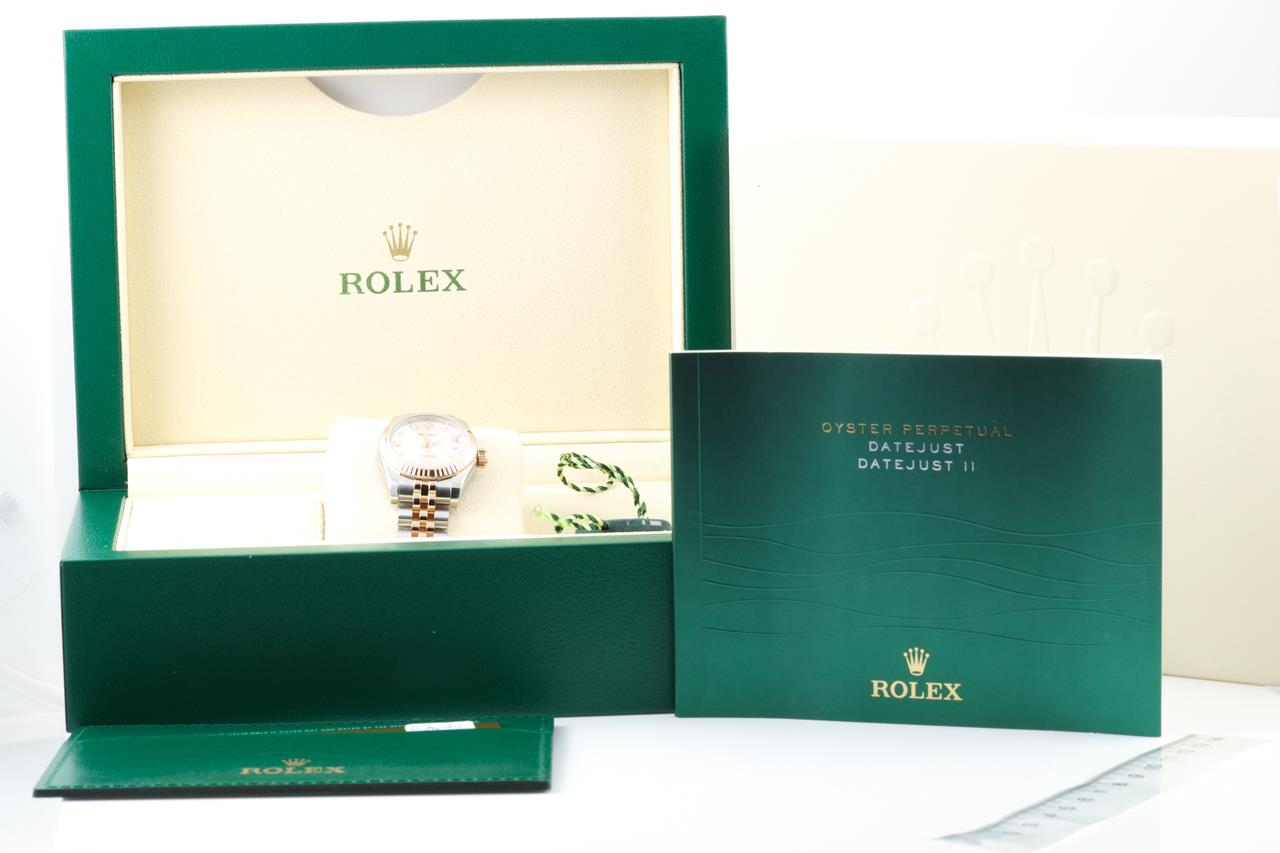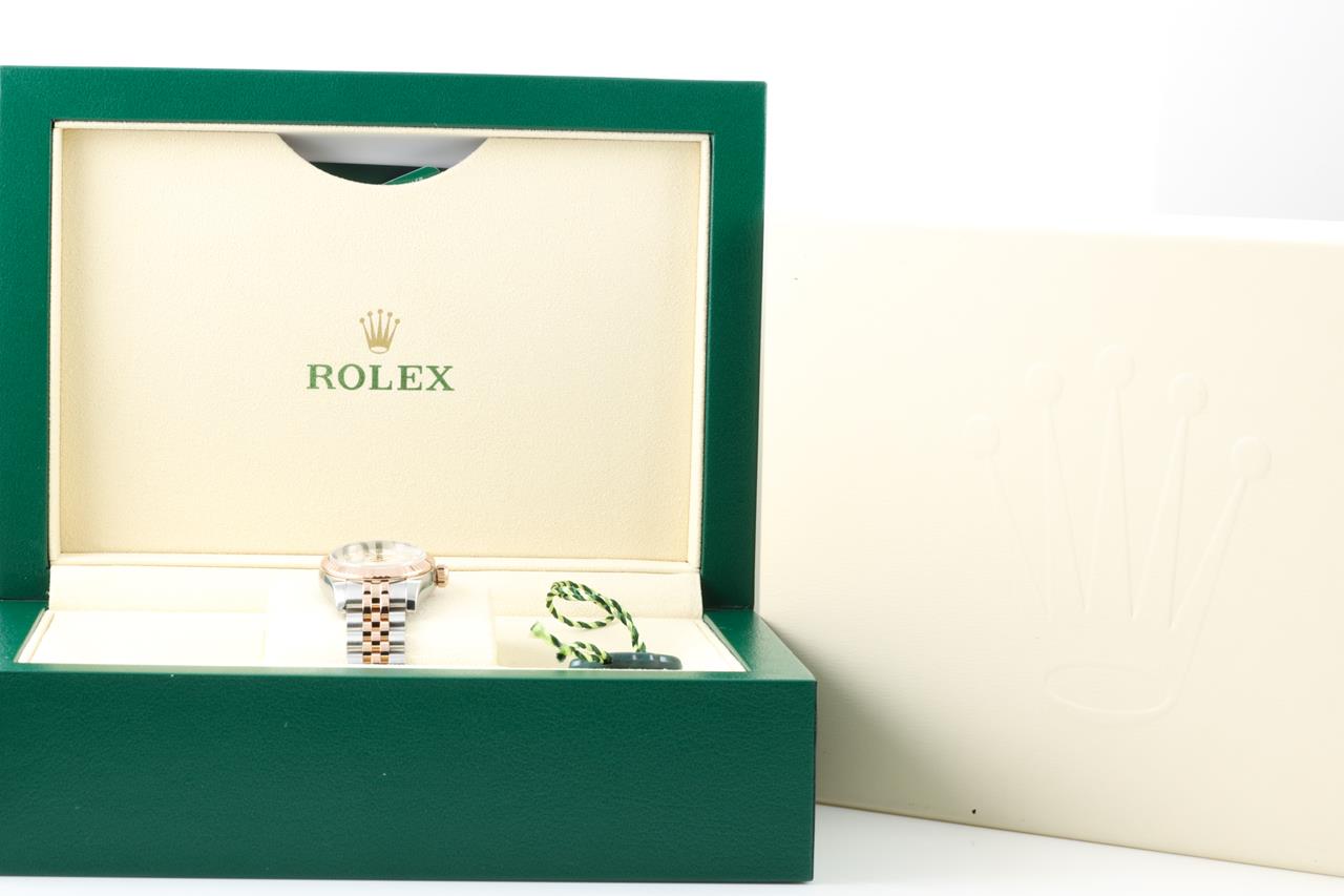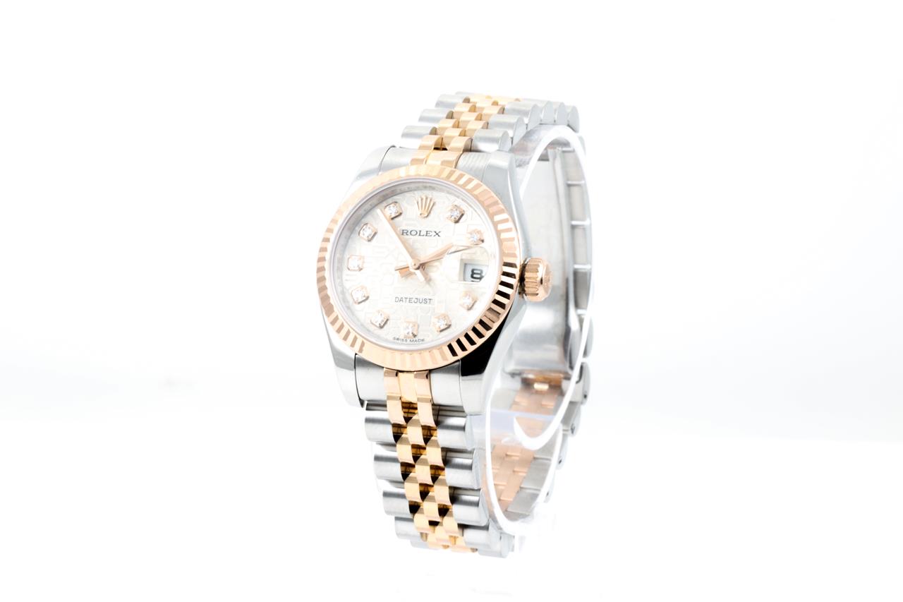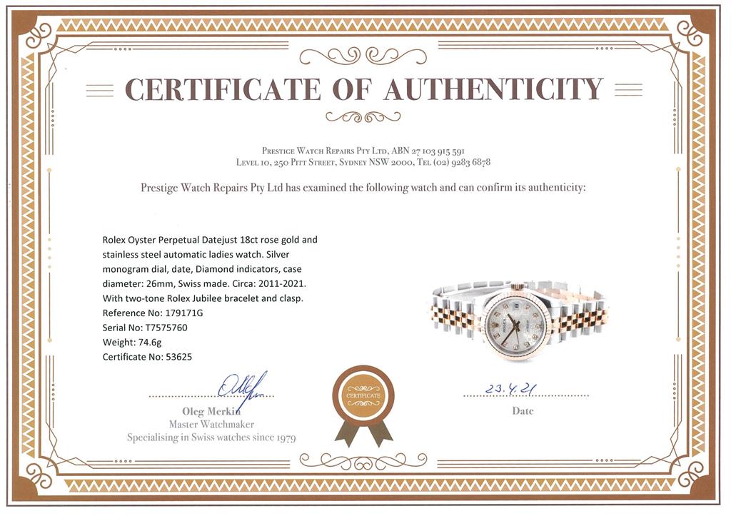 Rolex Oyster Perpetual Datejust 18ct rose gold and stainless steel automatic ladies watch. Silver monogram dial, date, Diamond indicators, case diameter: 26mm, wrist size: 15.5cm, Swiss made. Ref# 179171G, Circa: 1996. With two-tone Rolex Jubilee bracelet and clasp. Ref# 179171G, Circa: 2011-2021. With certificate of authenticity. With Rolex Guarantee card dated 17 Dec 2016 inside Rolex box. 3 month FSA warranty. (Pre-owned)