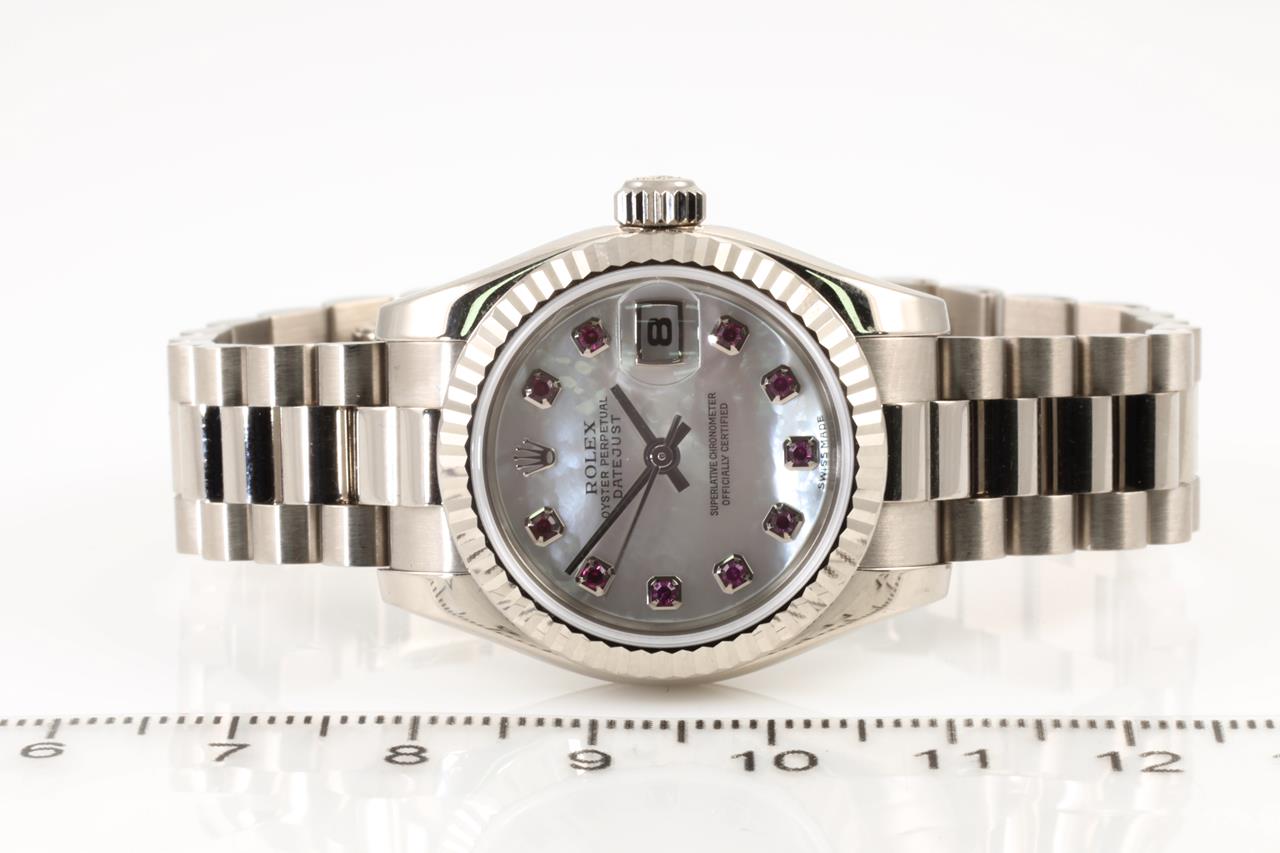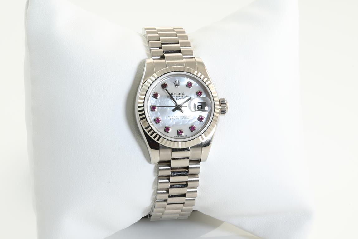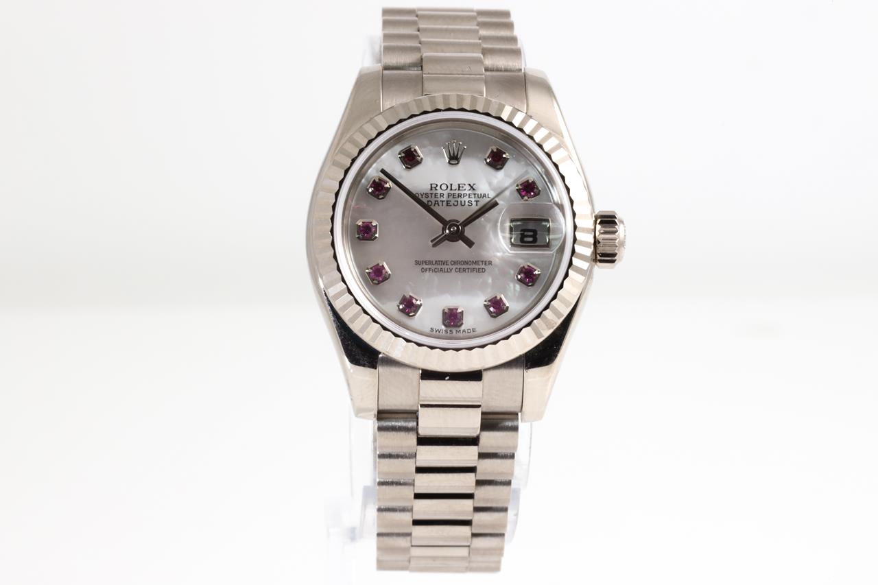 Rolex Oyster Perpetual Datejust 18ct white gold automatic watch. Mother of Pearl dial, Ruby indicators, case diameter: 26mm, wrist size: 15cm, Swiss made. Ref# 179179NGR, Circa: 2002. With 18ct white Gold Rolex Presidential bracelet and clasp. With Certificate of Authenticity, Rolex guarantee certificate dated 1/7/2004 and Rolex box. 3 month FSA warranty (Pre-owned).