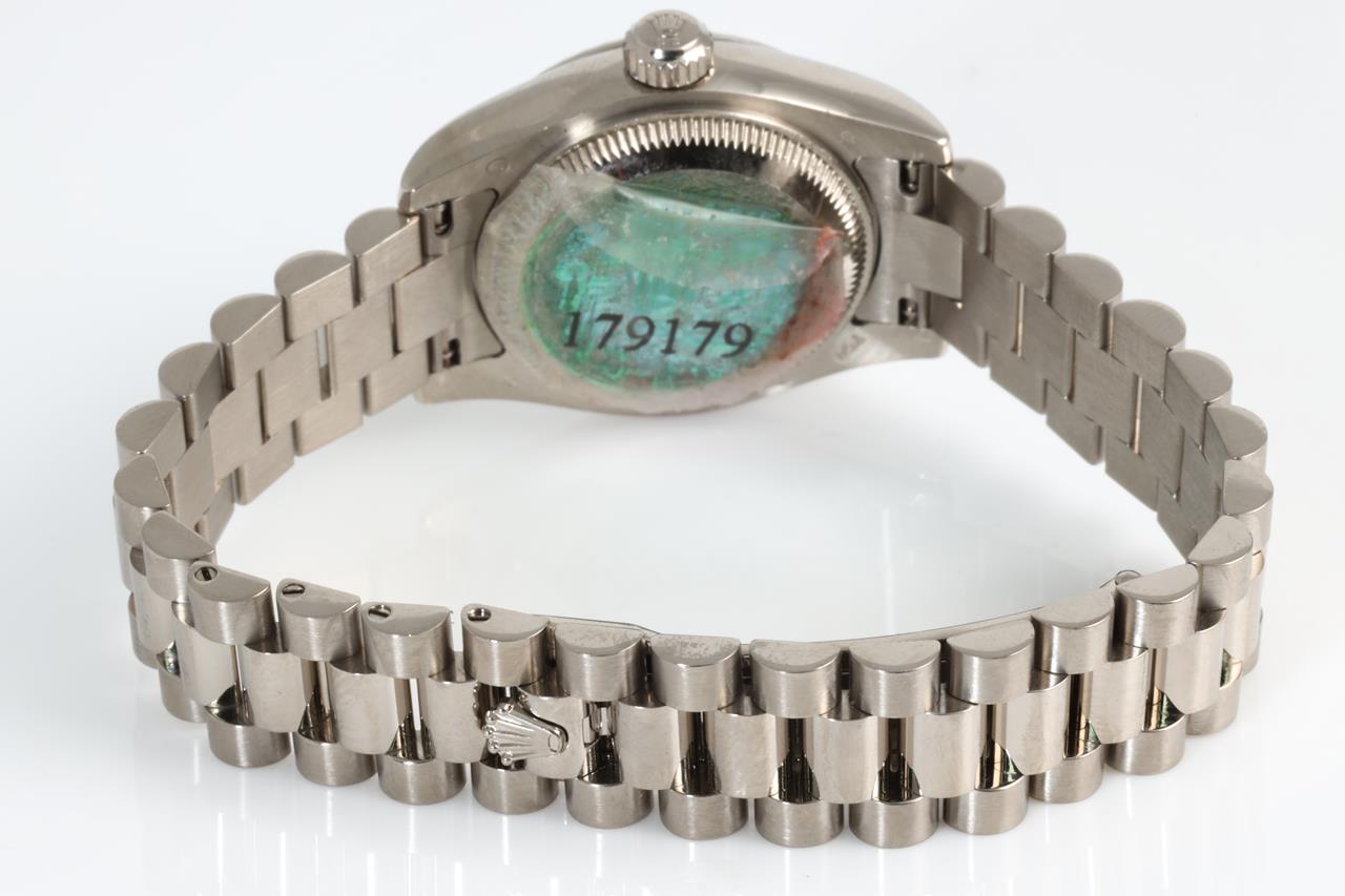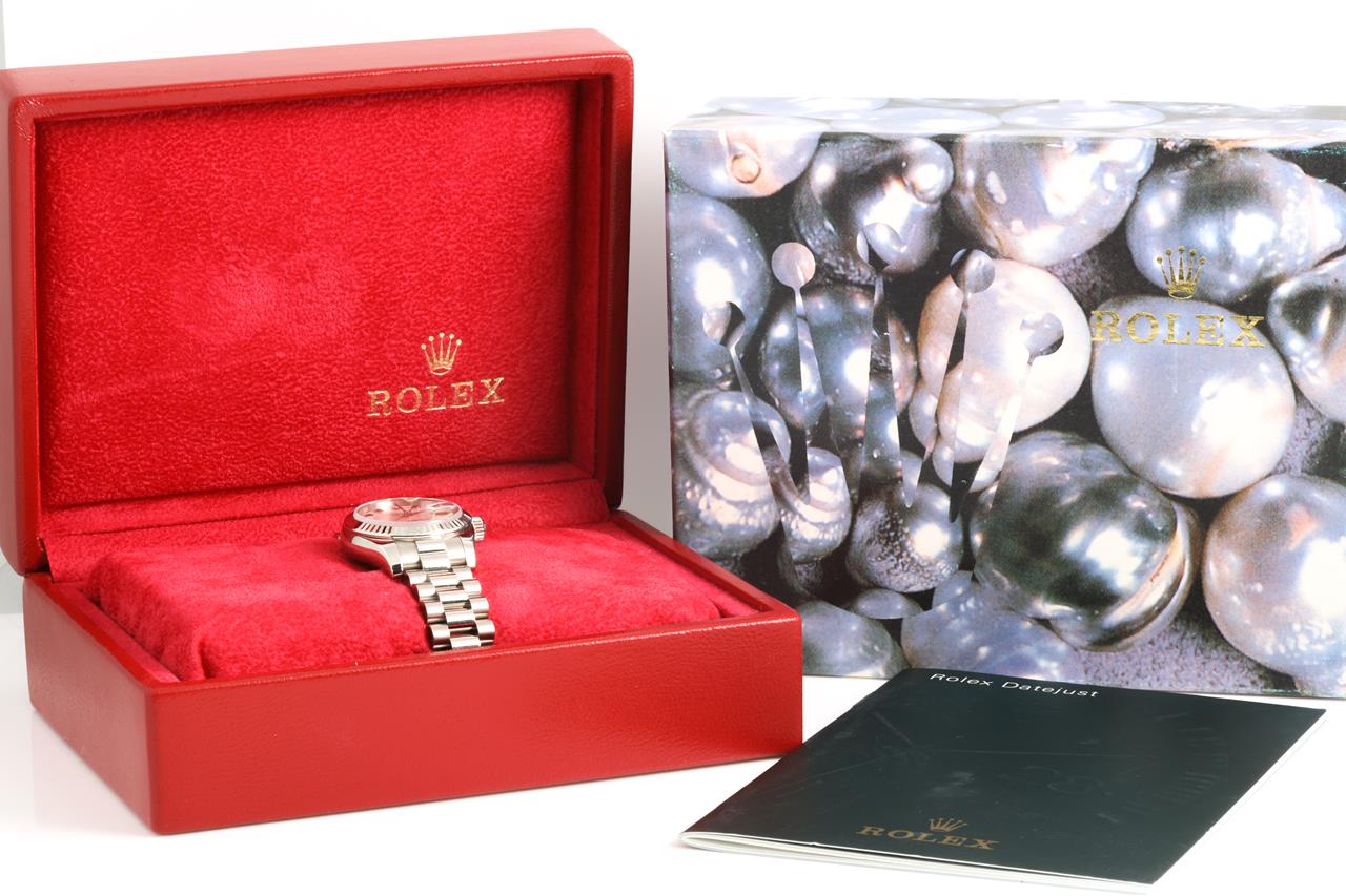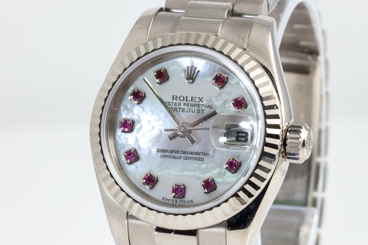Rolex Oyster Perpetual Datejust 18ct white gold automatic watch. Mother of Pearl dial, Ruby indicators, case diameter: 26mm, wrist size: 15cm, Swiss made. Ref# 179179NGR, Circa: 2002. With 18ct white Gold Rolex Presidential bracelet and clasp. With Certificate of Authenticity, Rolex guarantee certificate dated 1/7/2004 and Rolex box. 3 month FSA warranty (Pre-owned).