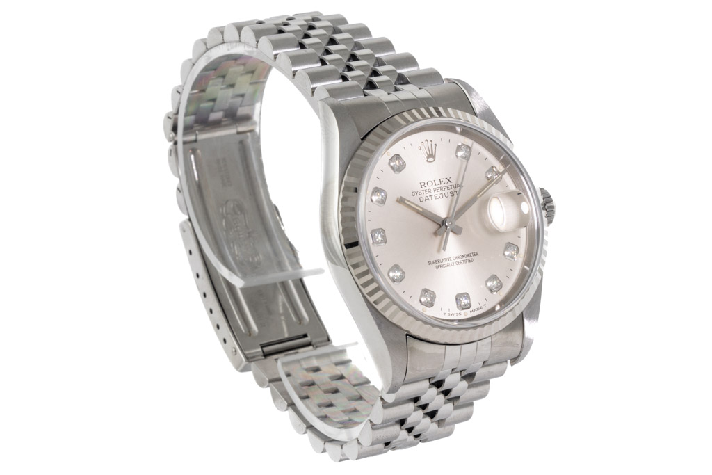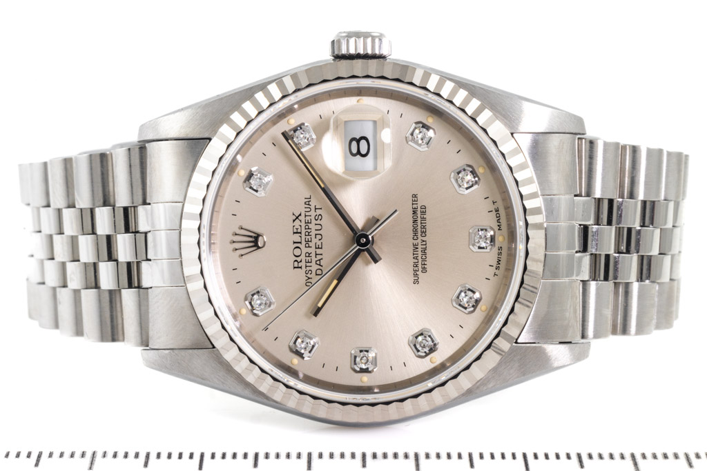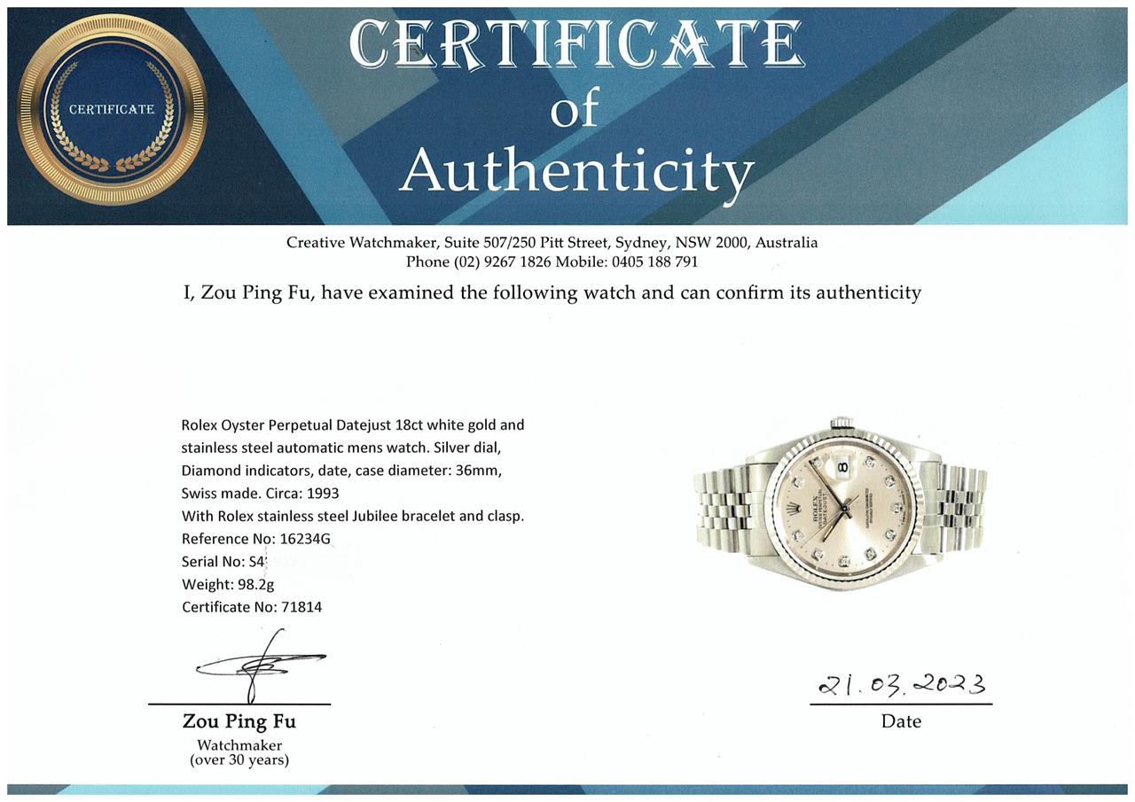 Rolex Oyster Perpetual Datejust 18ct white gold and stainless steel automatic mens watch. Silver dial, Diamond indicators, date, case diameter: 36mm, wrist size: 19.5cm, Swiss made. Ref# 16234G, Circa 1993. With Rolex stainless steel Jubilee bracelet and clasp. With Certificate of Authenticity and Rolex box. 3 month FSA warranty. (Pre-owned)