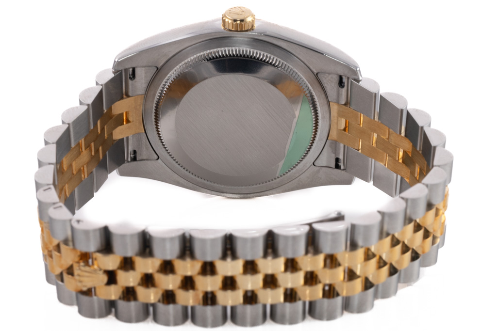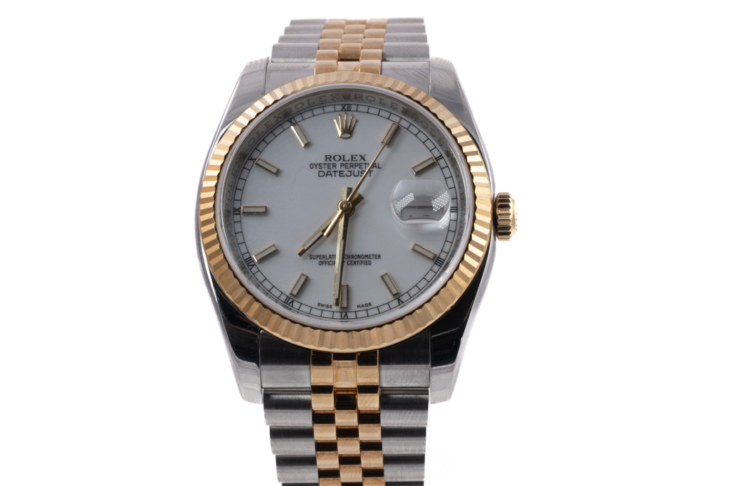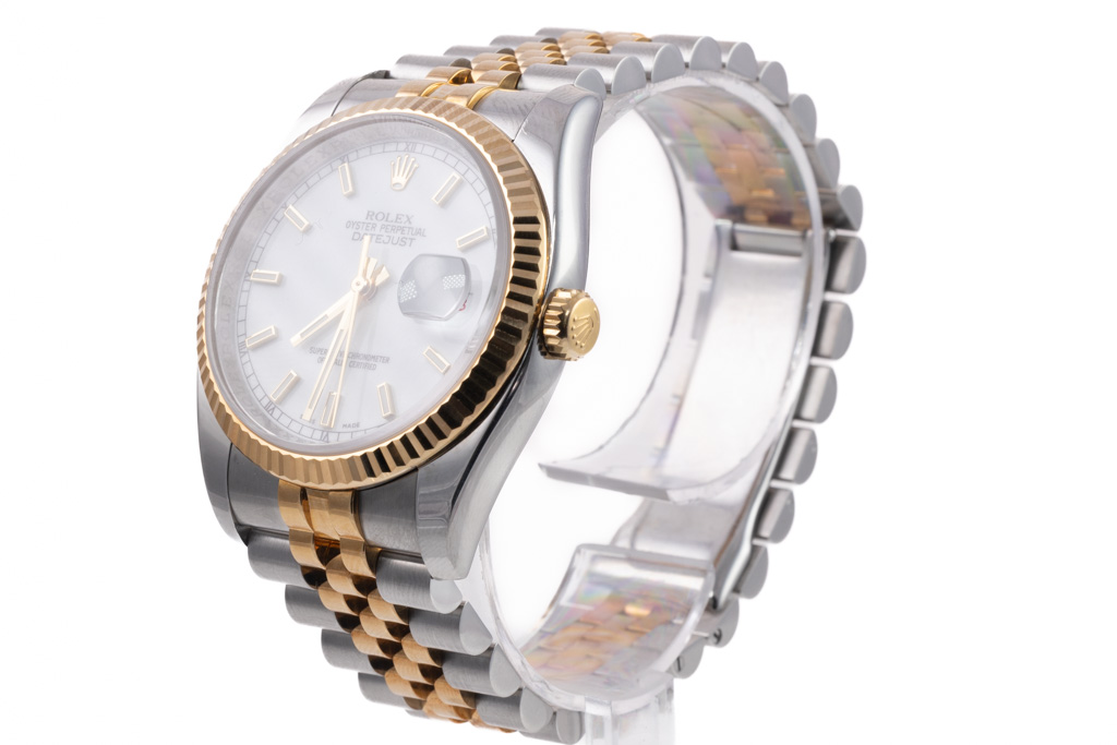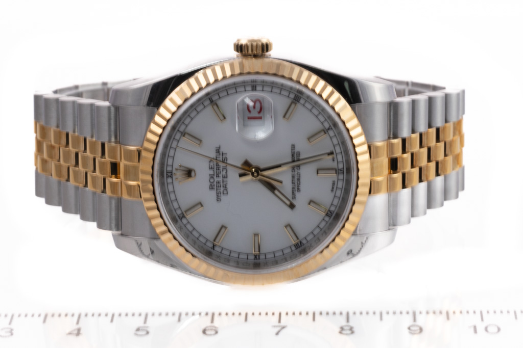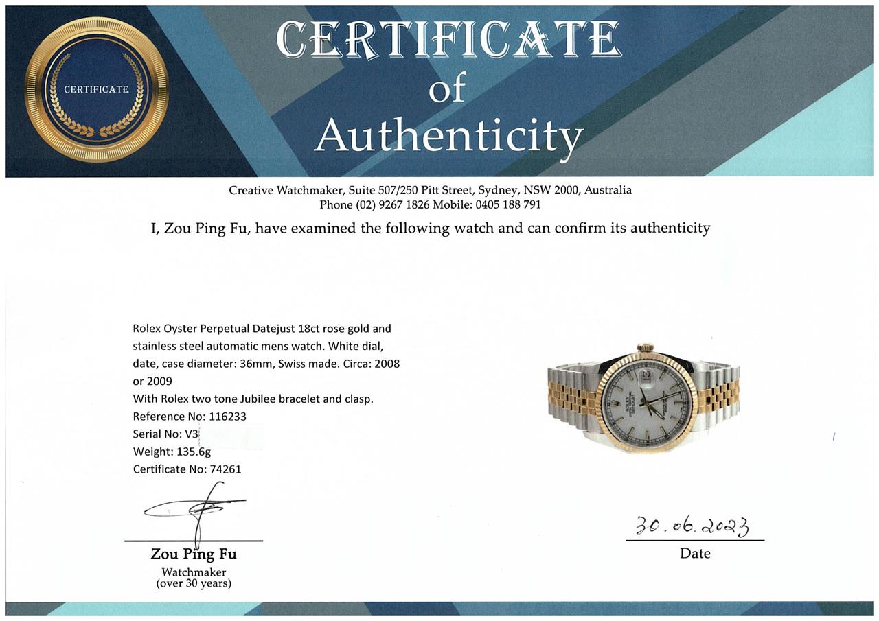 Rolex Oyster Perpetual Datejust 18ct rose gold and stainless steel automatic mens watch. White dial, date, case diameter: 36mm, wrist size: 18cm, Swiss made. Ref# 116233. Circa: 2008 or 2009. With Rolex two tone Jubilee bracelet and clasp. With Certificate of Authenticity, Rolex International Guarantee card dated 09/11/2009 and Rolex box. 3 month FSA warranty. (Pre-owned)