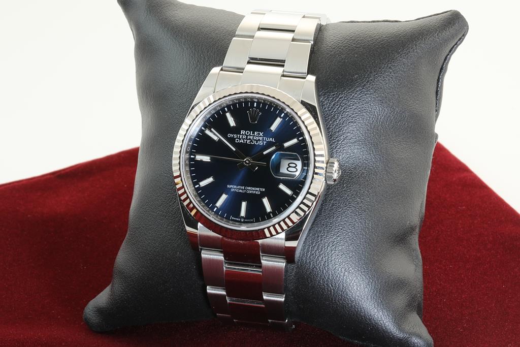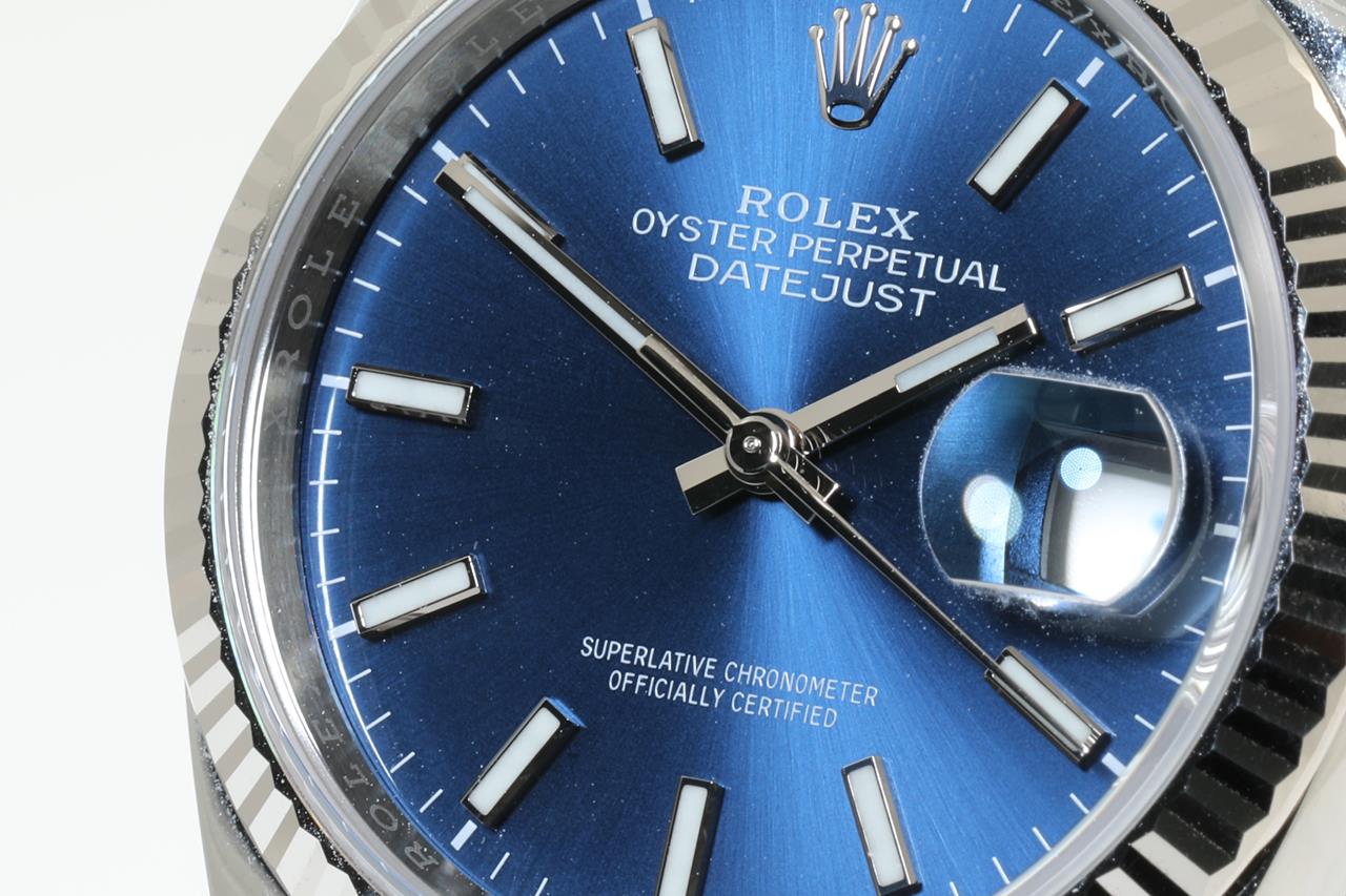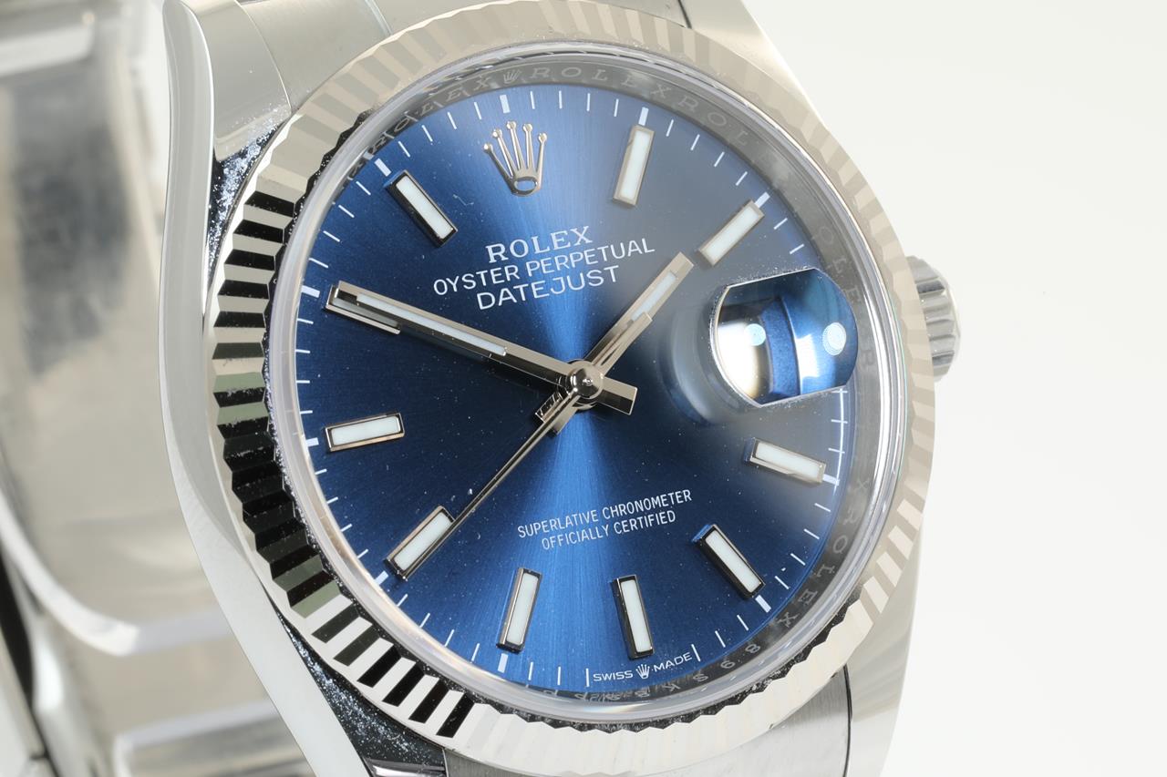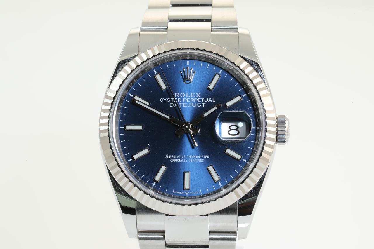 Rolex oyster perpetual datejust 18ct white gold and stainless steel automatic mens watch. Blue dial, date, 18ct white gold fluted bezel, case diameter: 36mm, wrist size: 18cm, circa:2011-2021, Ref #126234, Swiss made. With Rolex Oyster stainless steel bracelet and clasp. With Certificate of Authenticity and Rolex guarantee card dated 29/03/2020 inside Rolex box. 3 month FSA warranty. (Pre-owned)