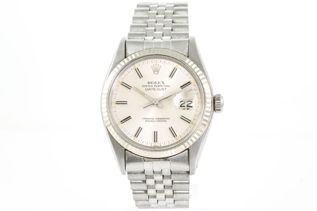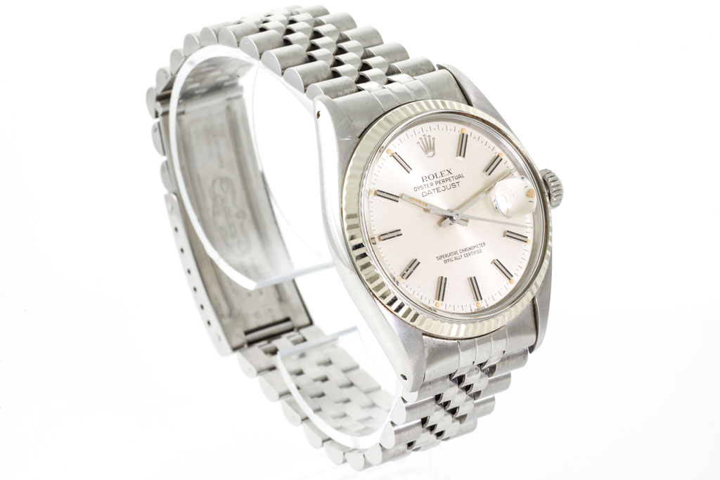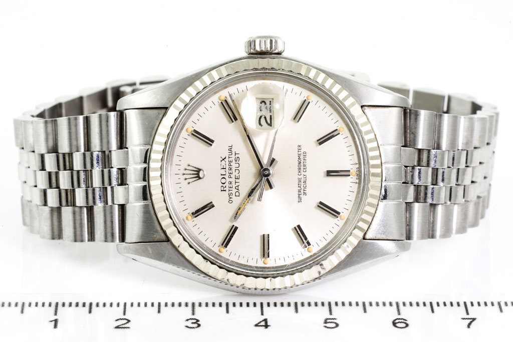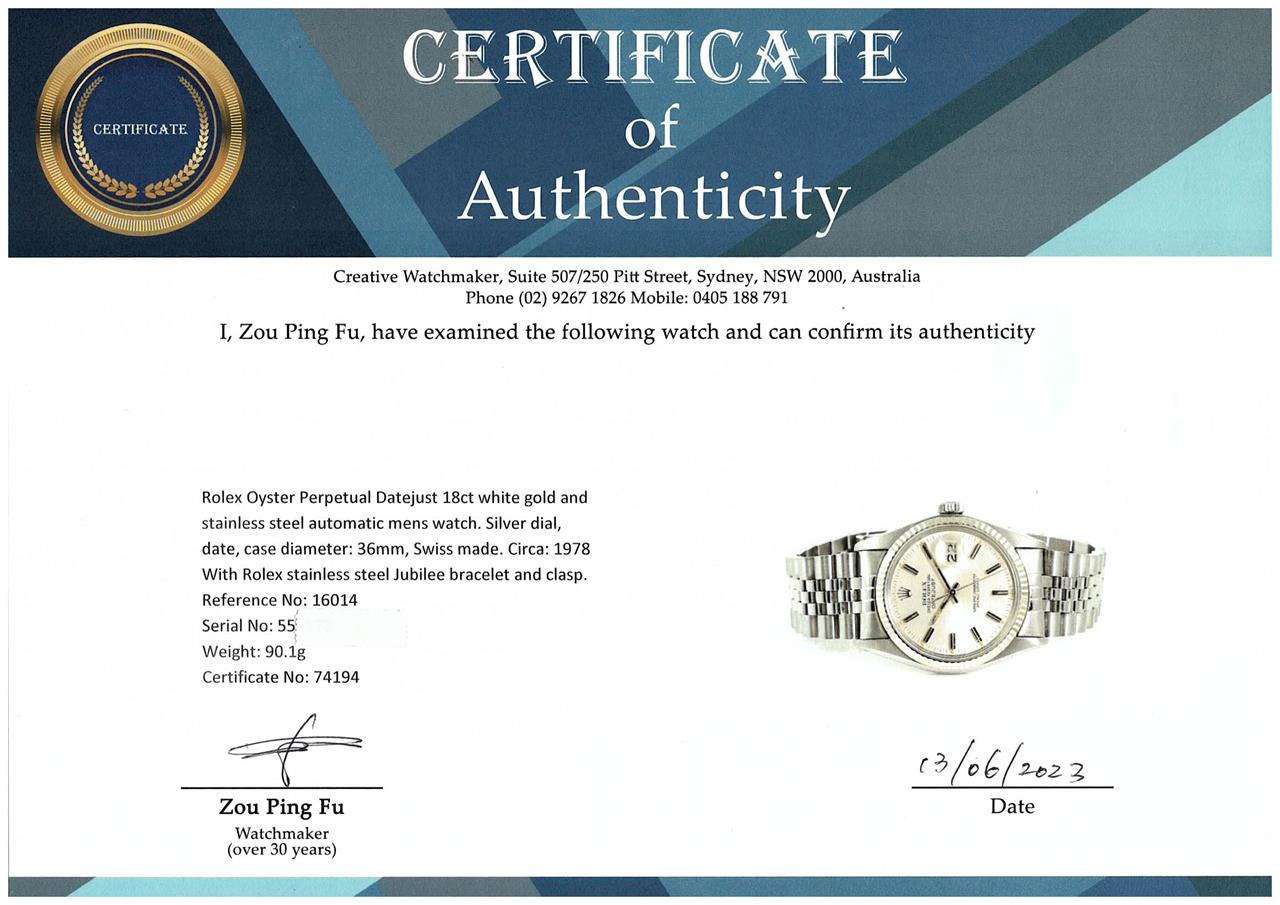 Rolex Oyster Perpetual Datejust 18ct white gold and stainless steel automatic mens watch. Silver dial, date, case diameter: 36mm, wrist size: 19cm, Swiss made. Weight: 90.1g. Ref# 16014. Circa: 1978. With Rolex stainless steel Jubilee bracelet and clasp. With Certificate of Authenticity. 3 month FSA warranty (Pre-owned)