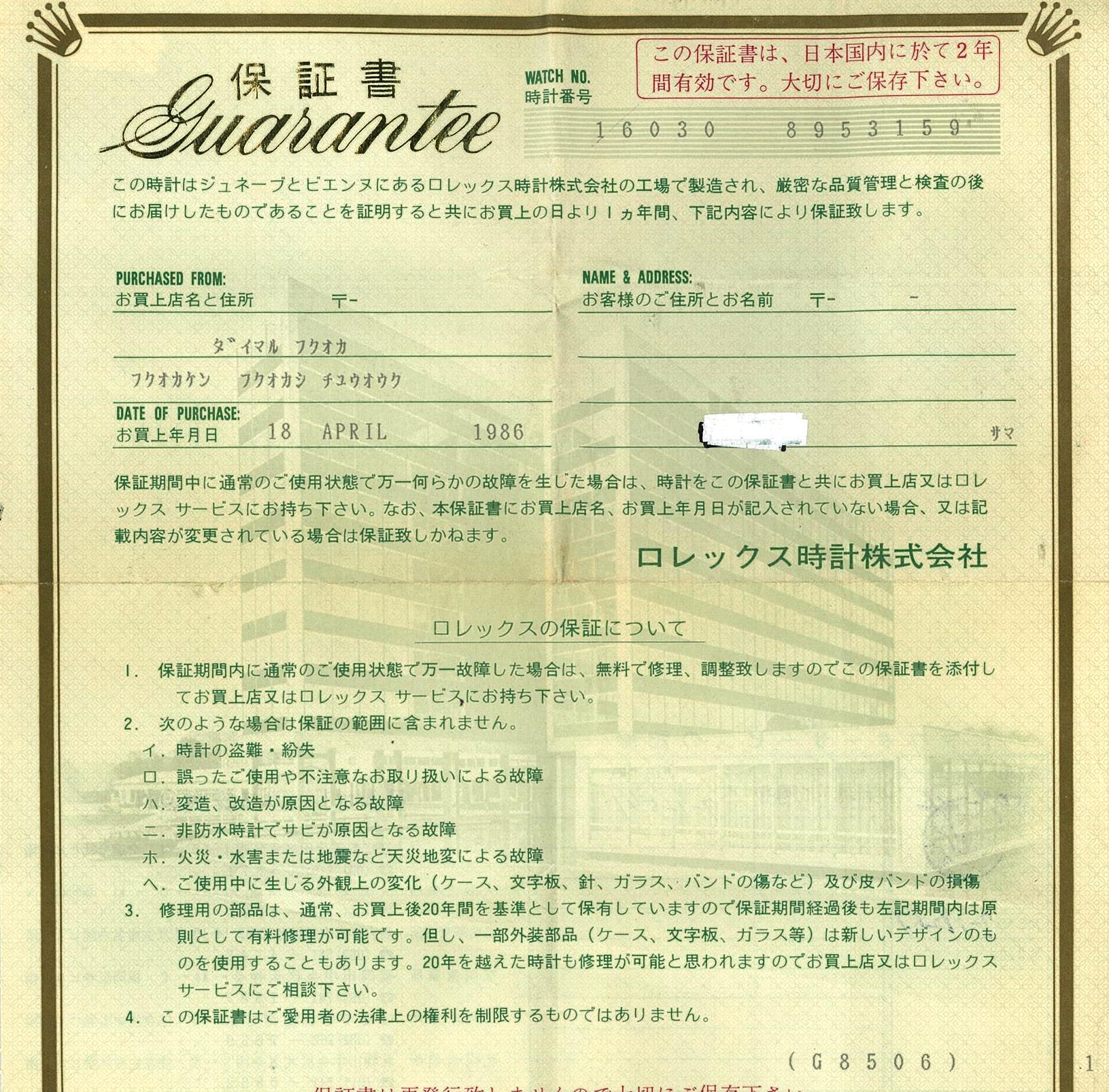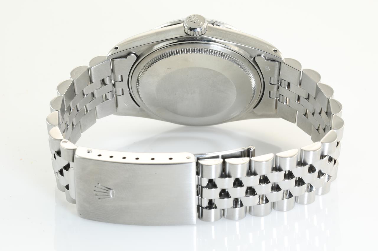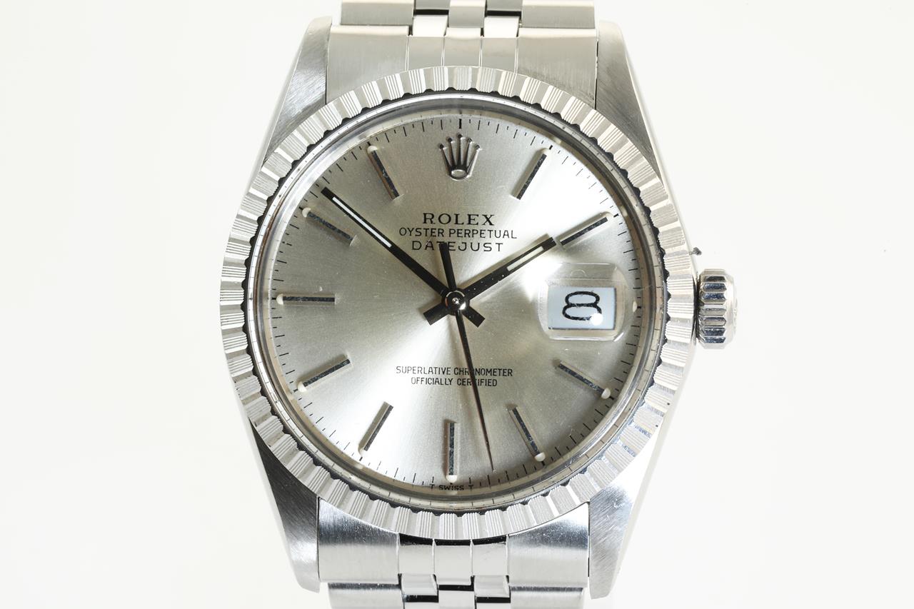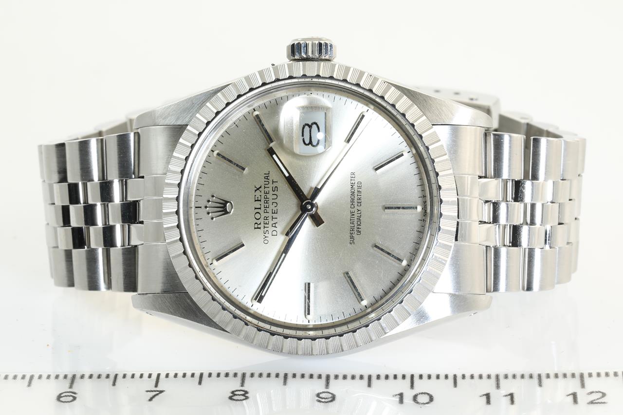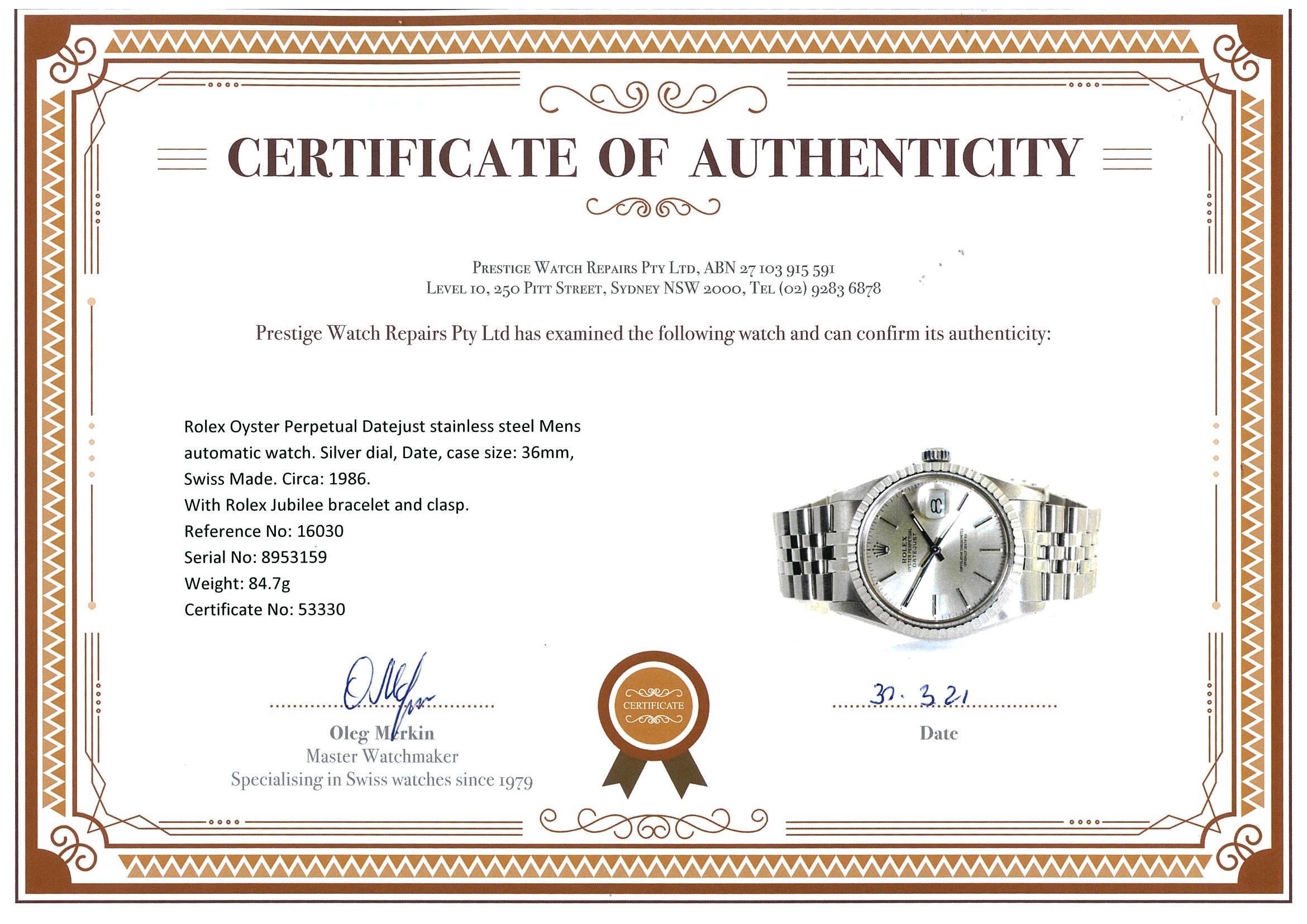 Rolex Oyster Perpetual Datejust stainless steel Mens automatic watch. Silver dial, Date, case size: 36mm, wrist size: 17cm, Swiss Made. Circa: 1986. Ref: #16030. With Rolex Jubilee bracelet and clasp. With Certificate of authenticity, Rolex guarantee certificate dated 18/4/1986 and Rolex Box. 3 months FSA warranty. (Pre-owned)