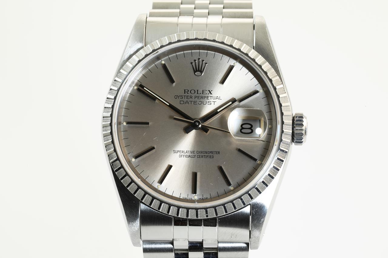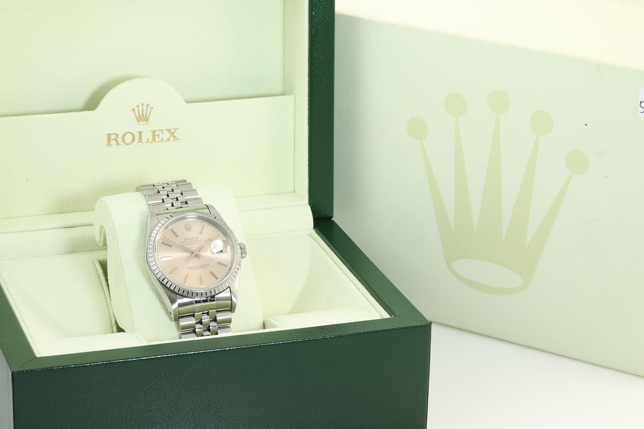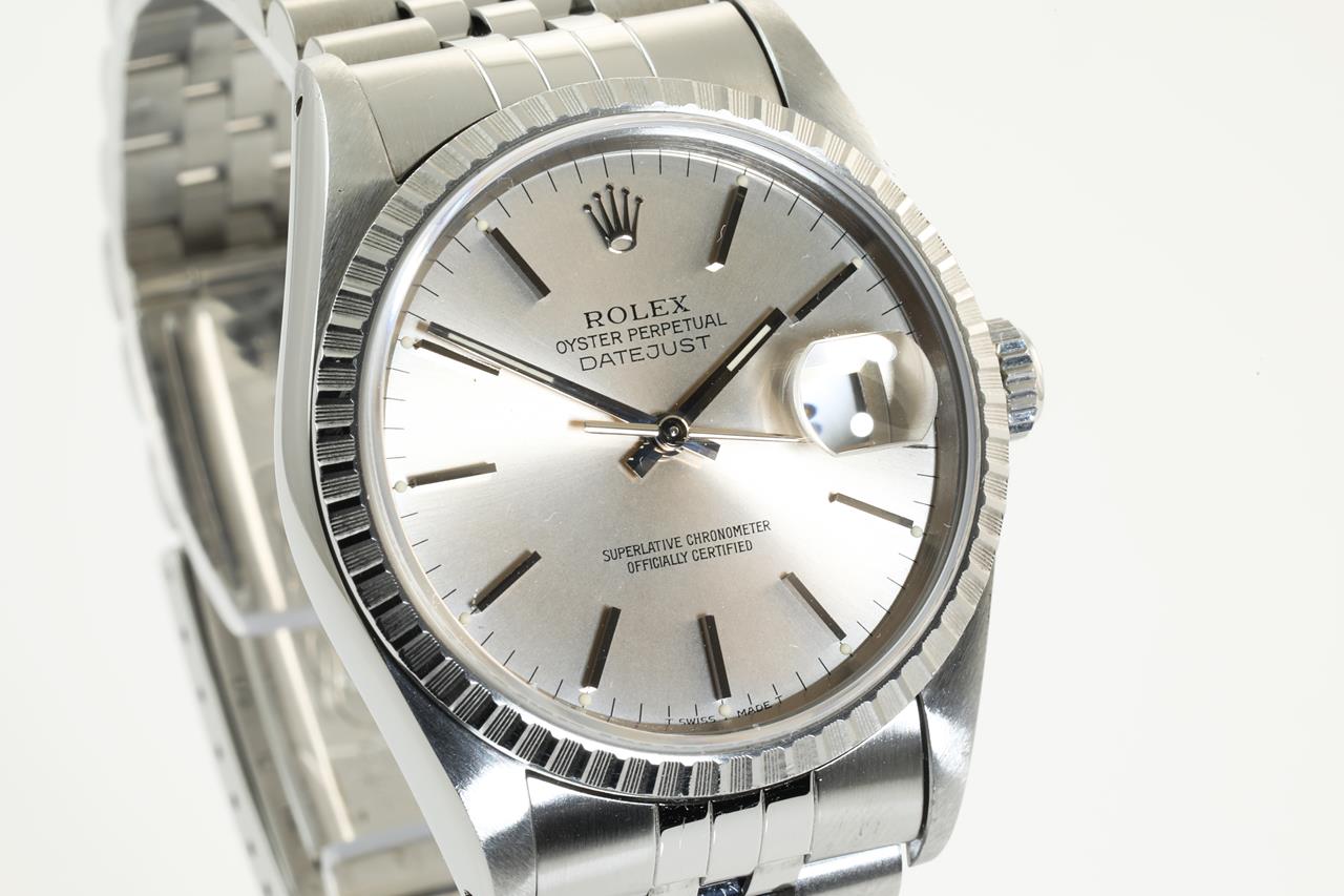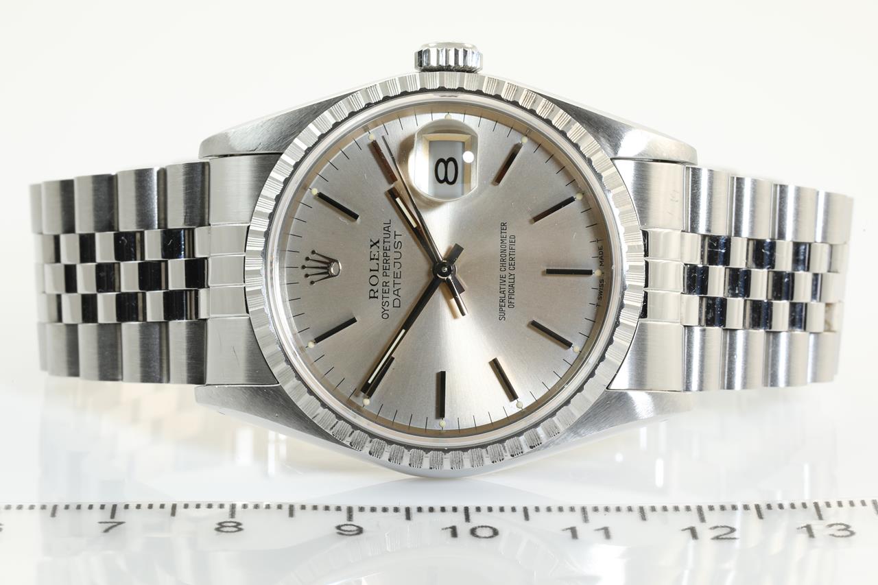 Rolex oyster Perpetual Datejust automatic mens watch. Silver dial, date, case size: 36mm, wrist size: 19cm, Swiss made. Circa: 1991. Ref #16220. With Rolex Jubilee stainless steel bracelet and clasp. With certificate of authenticity and Rolex box. 3 Months FSA Warranty. (pre-owned)