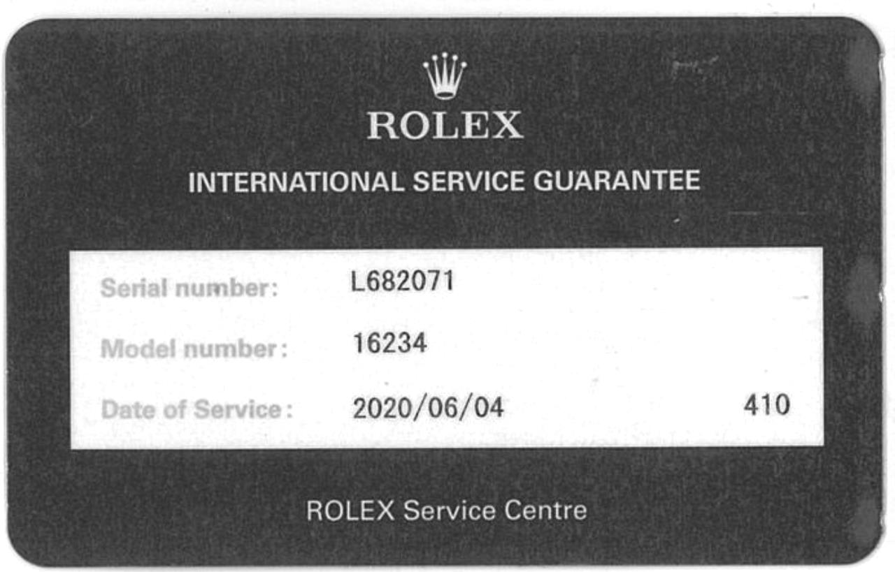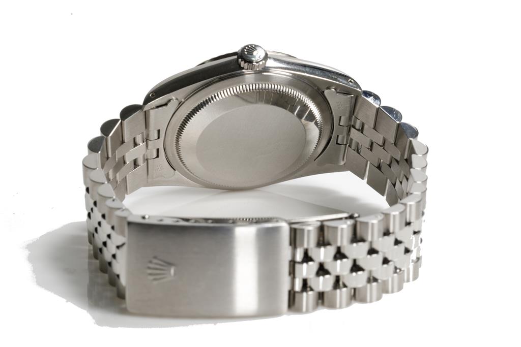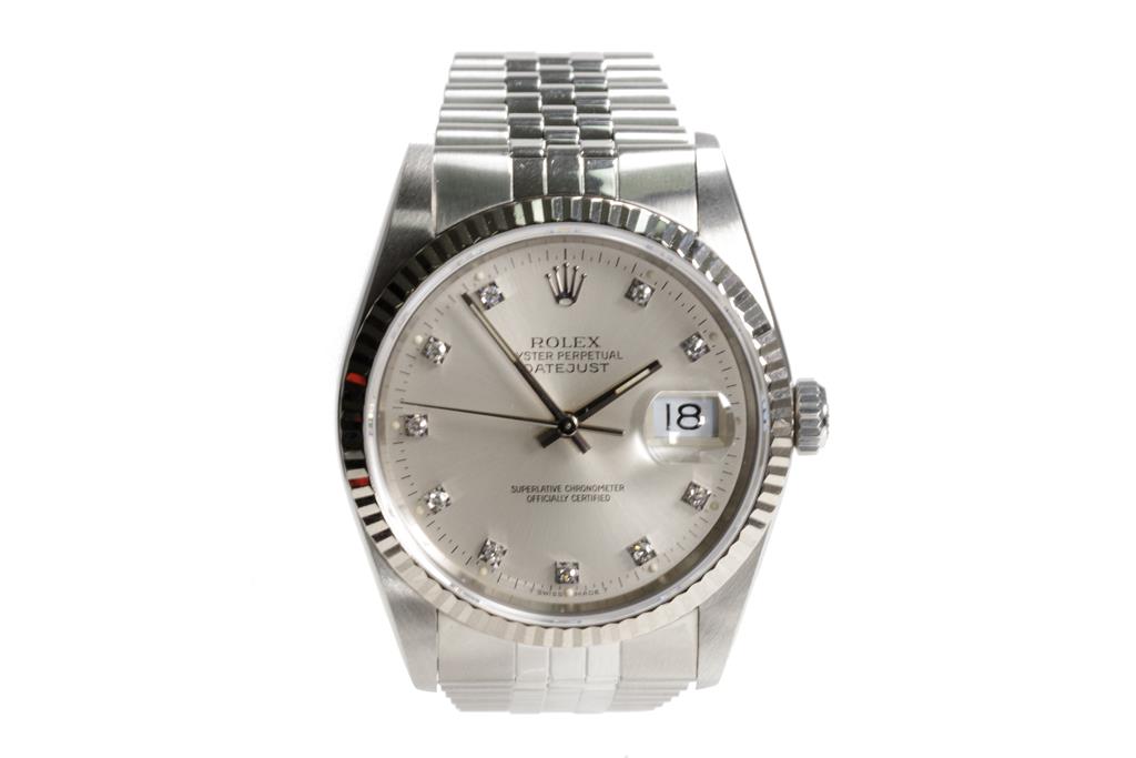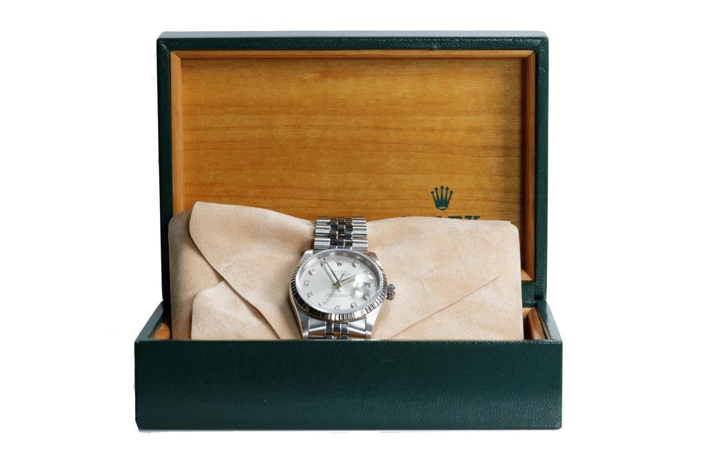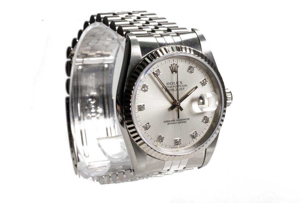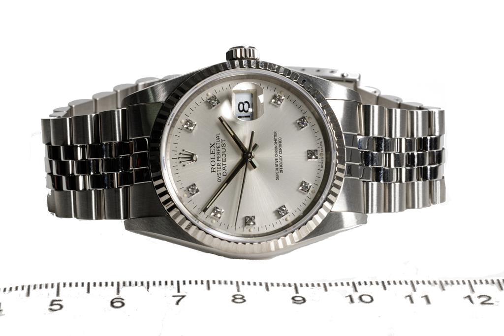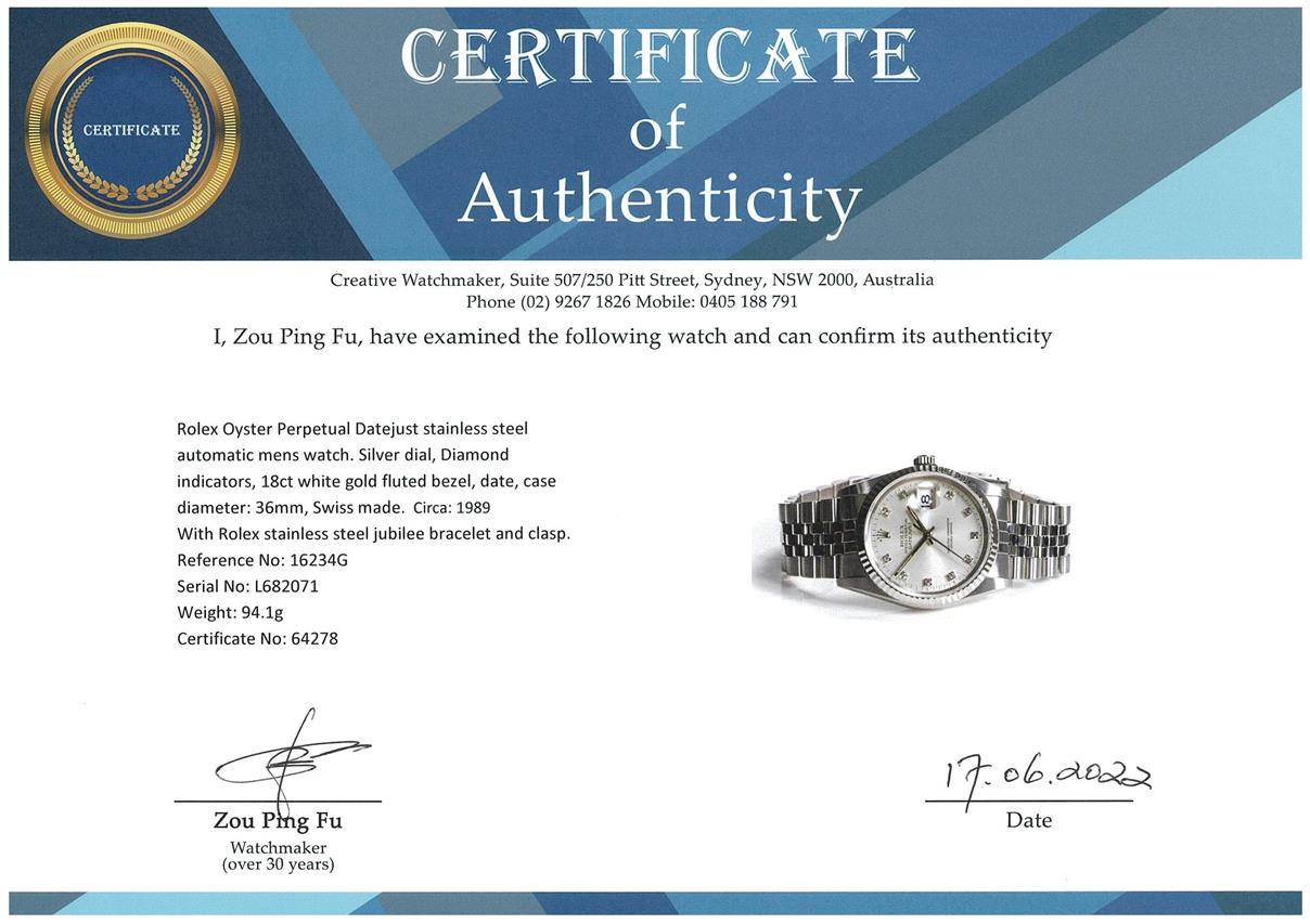 Rolex Oyster Perpetual Datejust stainless steel automatic mens watch. Silver dial, Diamond indicators, 18ct white gold fluted bezel, date, case diameter: 36mm, wrist size: 17.5cm, Swiss made. Ref# 16234G, Circa: 1989. With Rolex stainless steel jubilee bracelet and clasp. With Certificate of Authenticity, Rolex International Service Guarantee Card dated 04/06/2020 and Rolex box. 3 month FSA Warranty (Pre-owned)