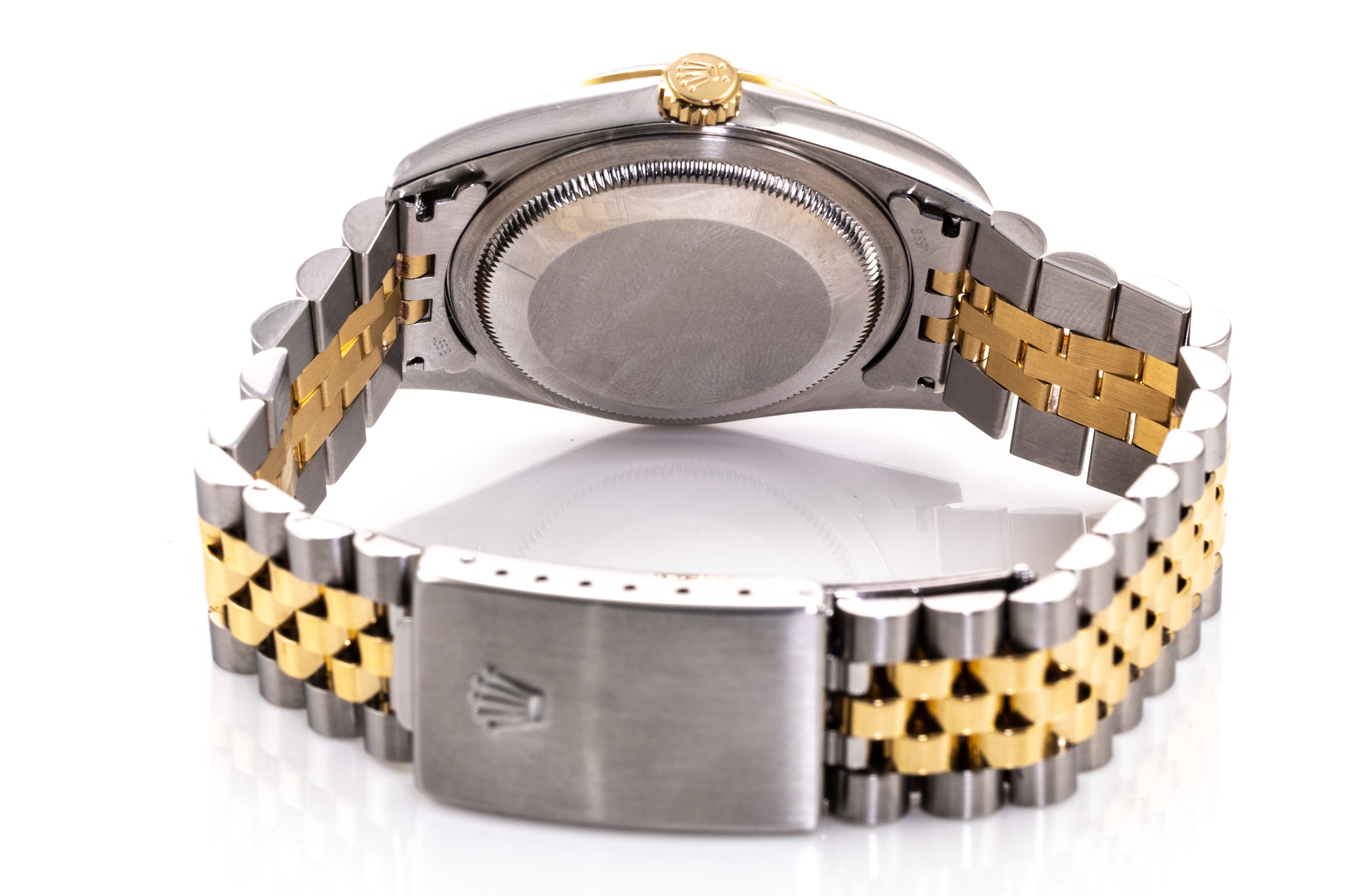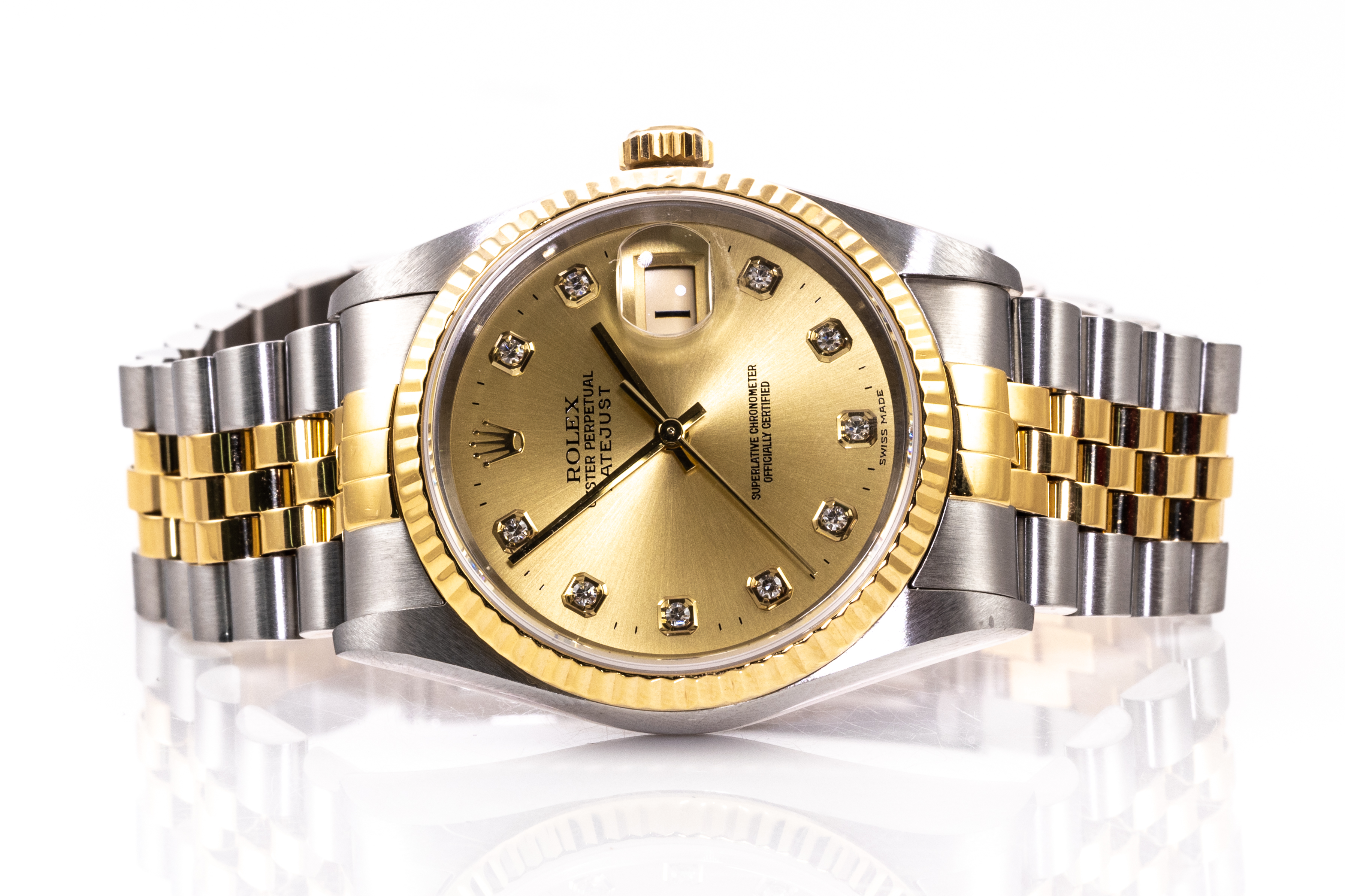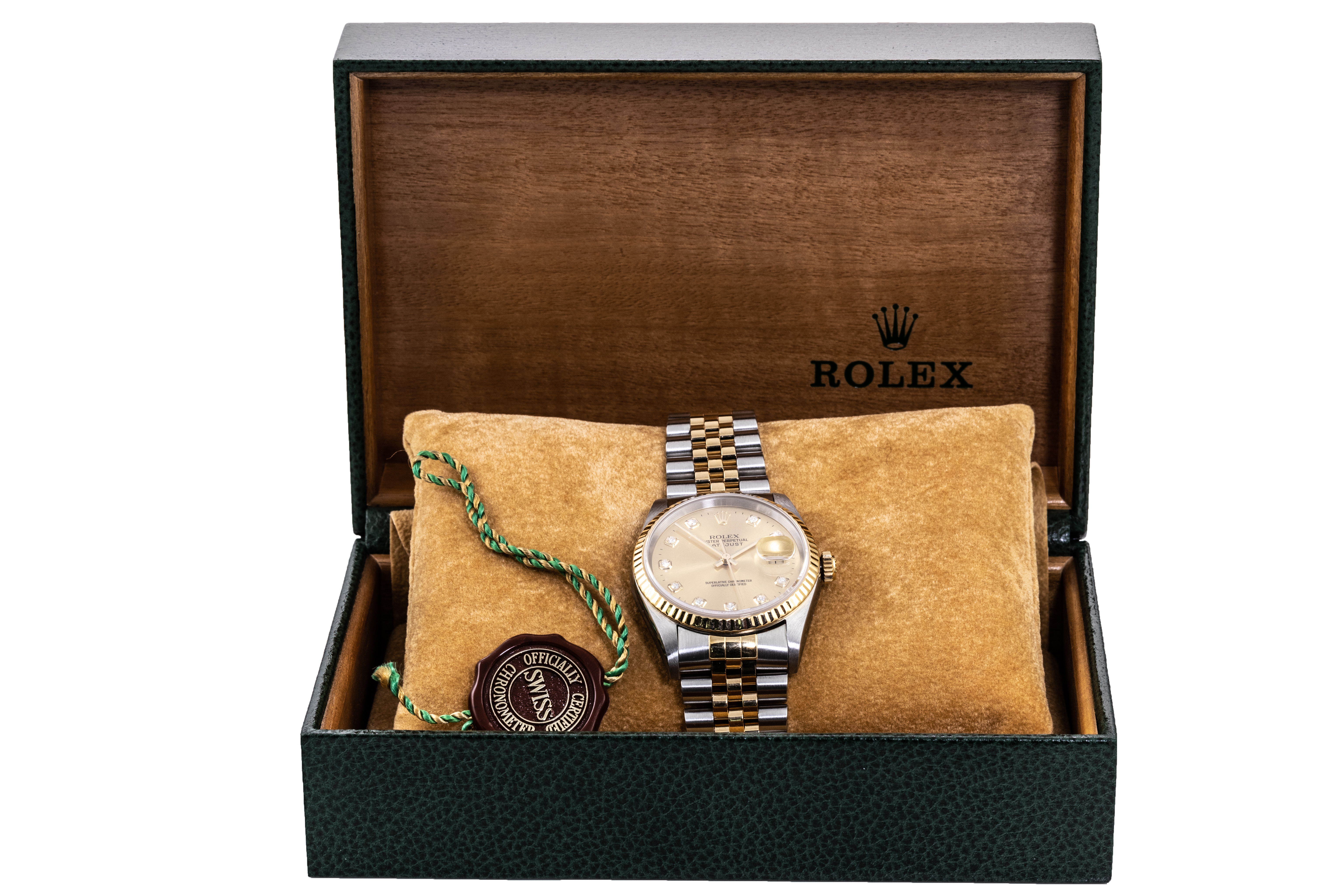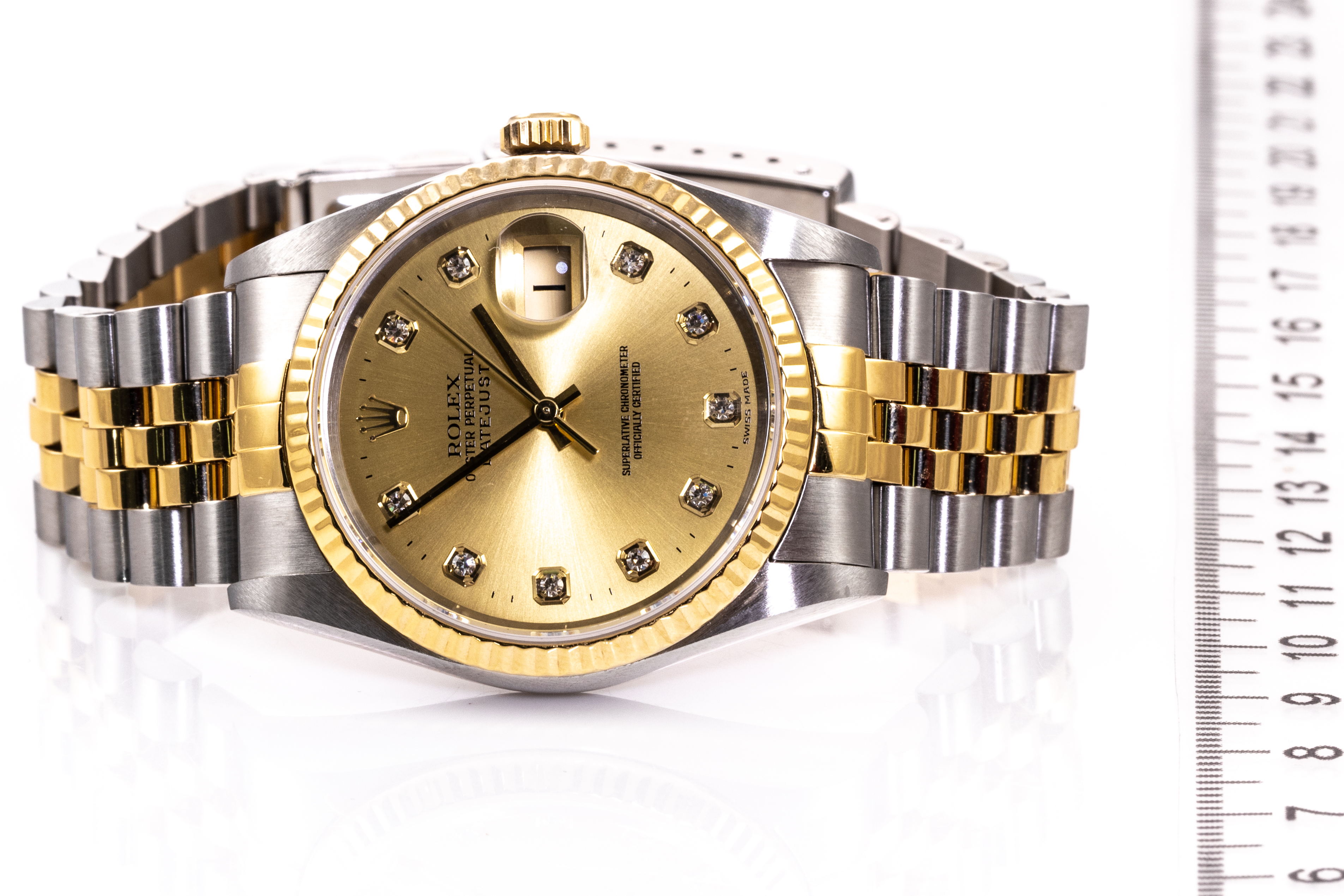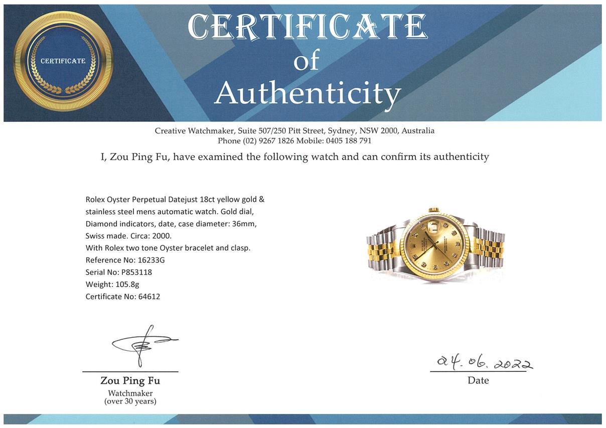 Rolex Oyster Perpetual Datejust 18ct yellow gold & stainless steel mens automatic watch. Gold dial, Diamond indicators, date, case diameter: 36mm, wrist size: 19.5cm, Swiss made. Ref# 16233G, Circa: 2000. With Rolex two-tone Jubilee bracelet and clasp. With Certificate of Authenticity, Rolex Guarantee Certificate dated 07/2001 and Rolex International Service Guarantee dated 21/10/2020 - 2 years Rolex service warranty still valid. With Rolex box. (Pre-owned)