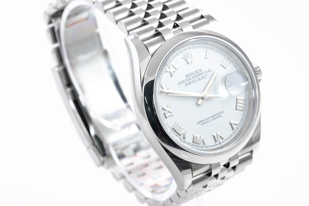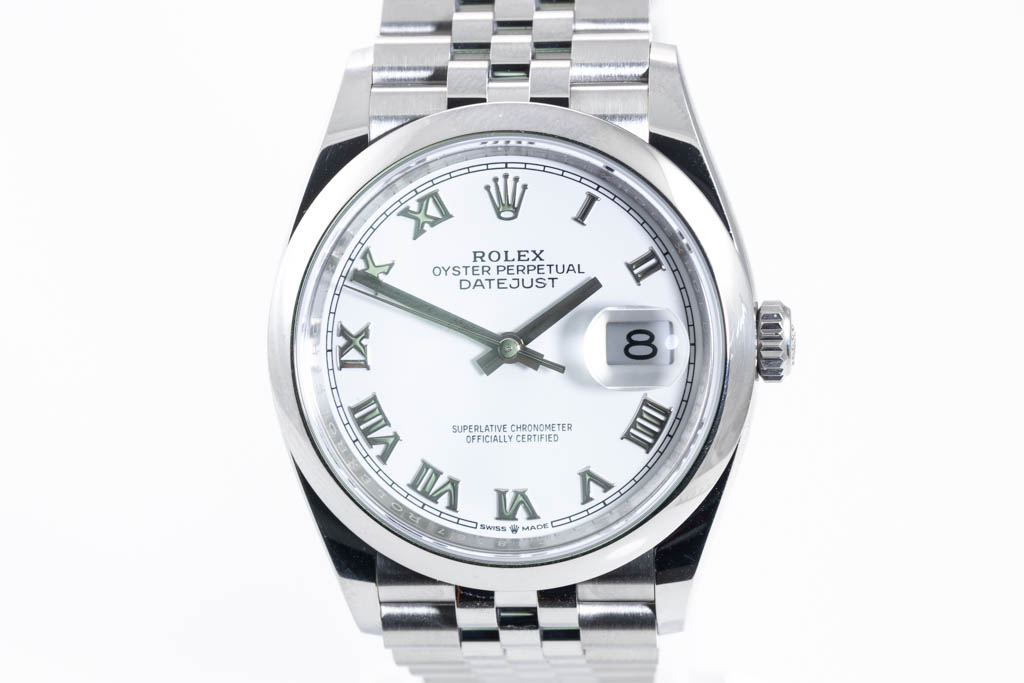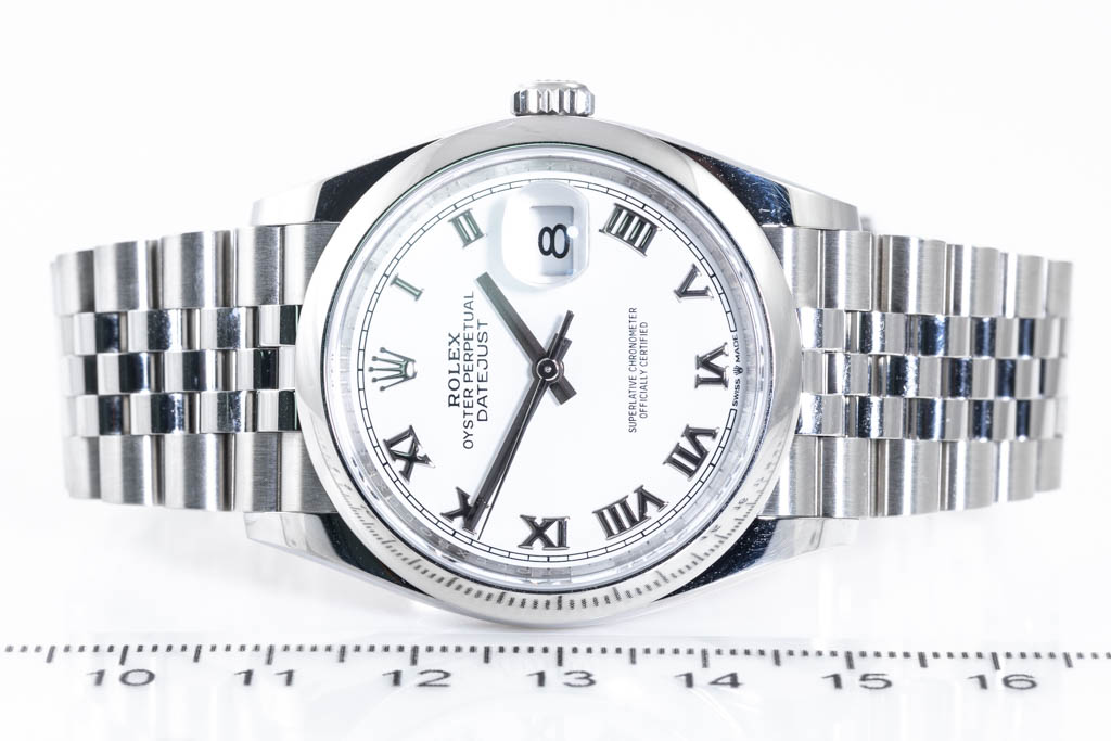 Rolex Oyster Perpetual Datejust stainless steel automatic men's watch. White dial, date, case diameter: 36mm, wrist size: 18cm, Swiss made. Ref# 126200, Circa: 2011-2023. With Rolex stainless steel Jubilee bracelet and clasp. With Certificate of Authenticity, Rolex International Guarantee card dated02/06/2020 and Rolex Box. Balance of 5 years Rolex manufactory warranty applies. (Pre-owned)