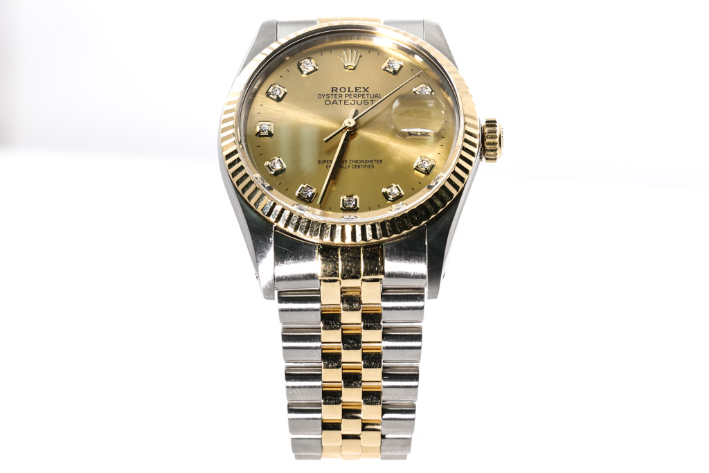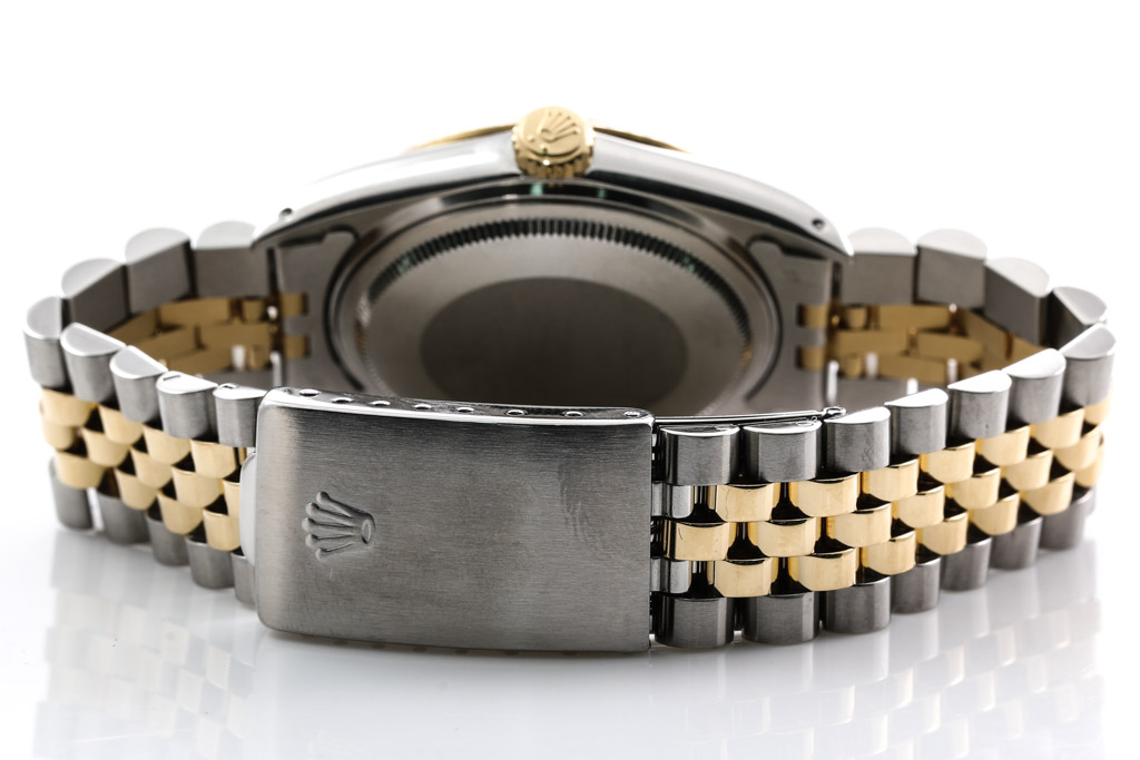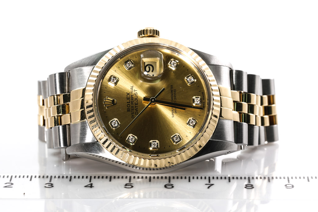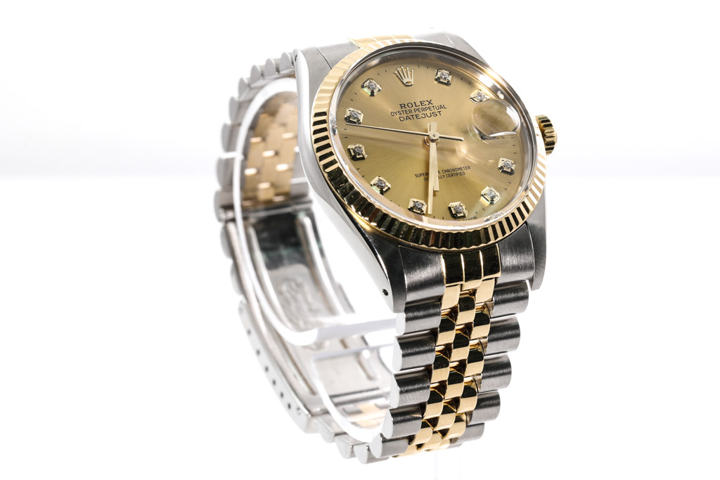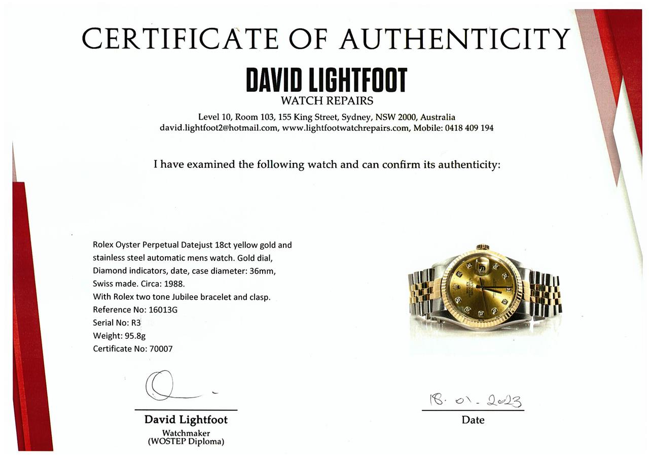 Rolex Oyster Perpetual Datejust 18ct yellow gold and stainless steel automatic men's watch. Gold dial, Diamond indicators, date, case diameter: 36mm, wrist size: 17cm, Swiss made. Ref# 16013G. Circa: 1988. With Rolex two tone Jubilee bracelet and clasp. With Certificate of Authenticity, Rolex International Service Guarantee Card dated 21/09/2022 and Rolex box. Balance of 2 year Rolex Service warranty applies. (Pre-owned)