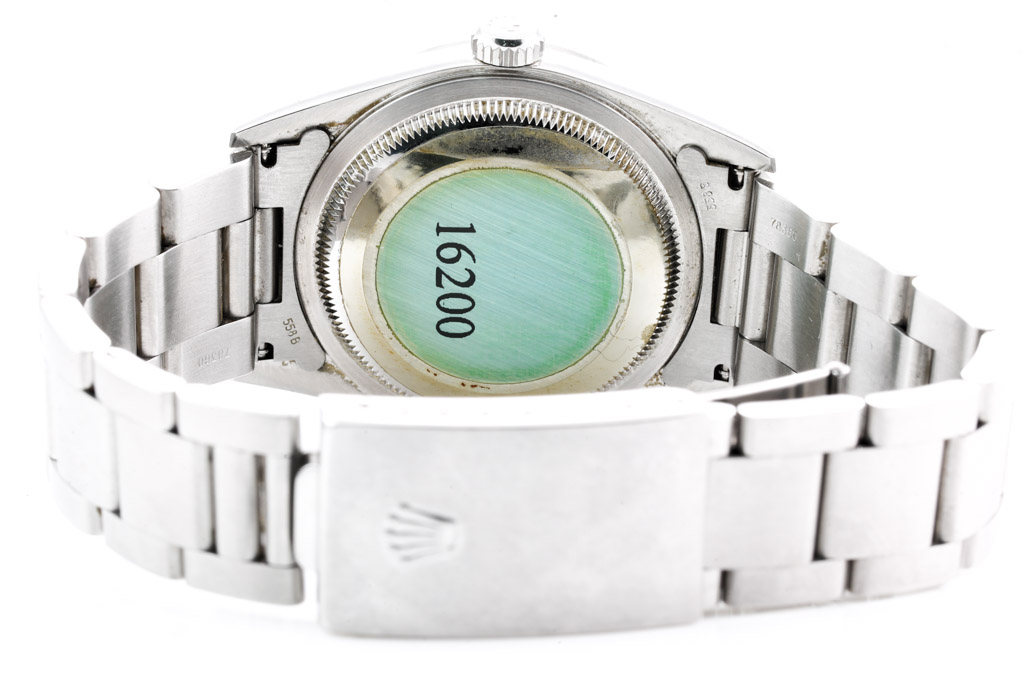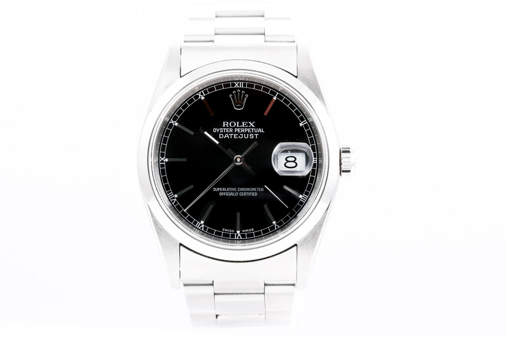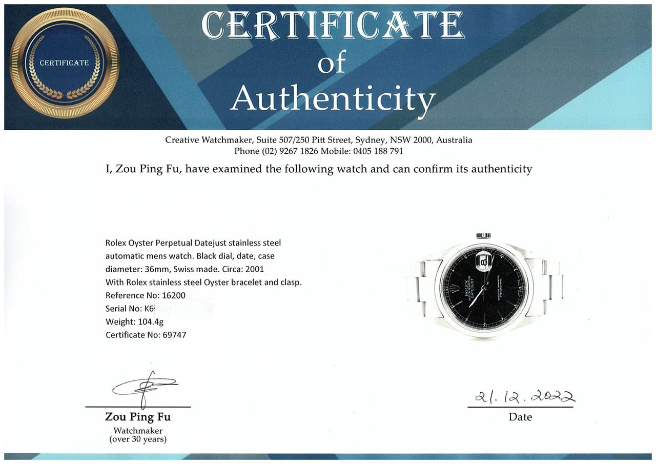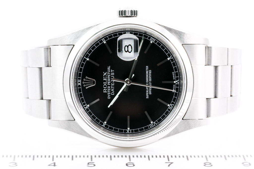 Rolex Oyster Perpetual Datejust stainless steel automatic mens watch. Black dial, date, case diameter: 36mm, wrist size: 17.5cm, Swiss made. Ref# 16200, Circa: 2001. With Rolex stainless steel oyster bracelet and clasp. With Certificate of Authenticity, Rolex Guarantee Certificate 06/2002 and Rolex box. 3 month FSA warranty. (Pre-owned)