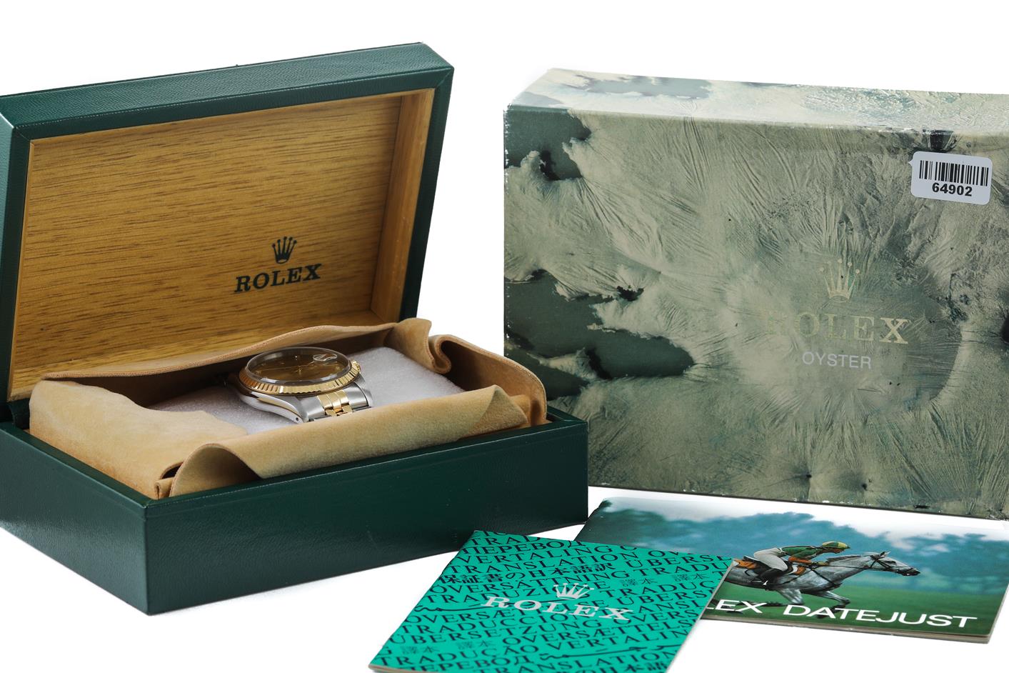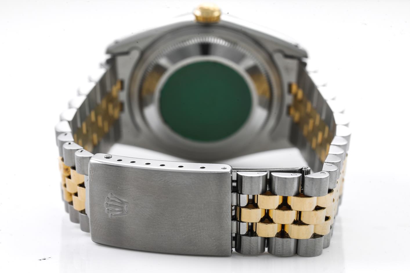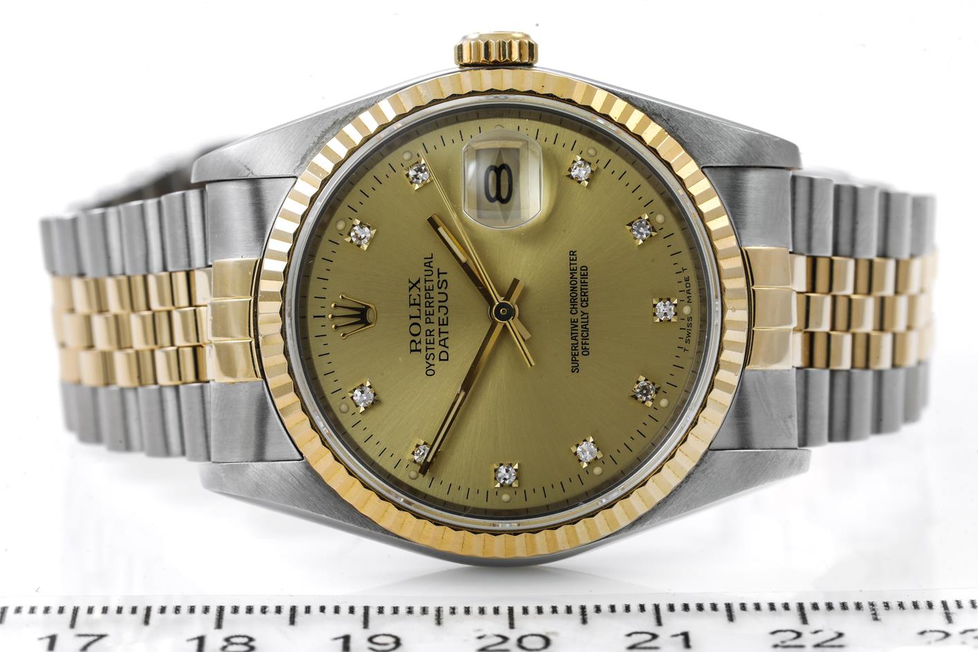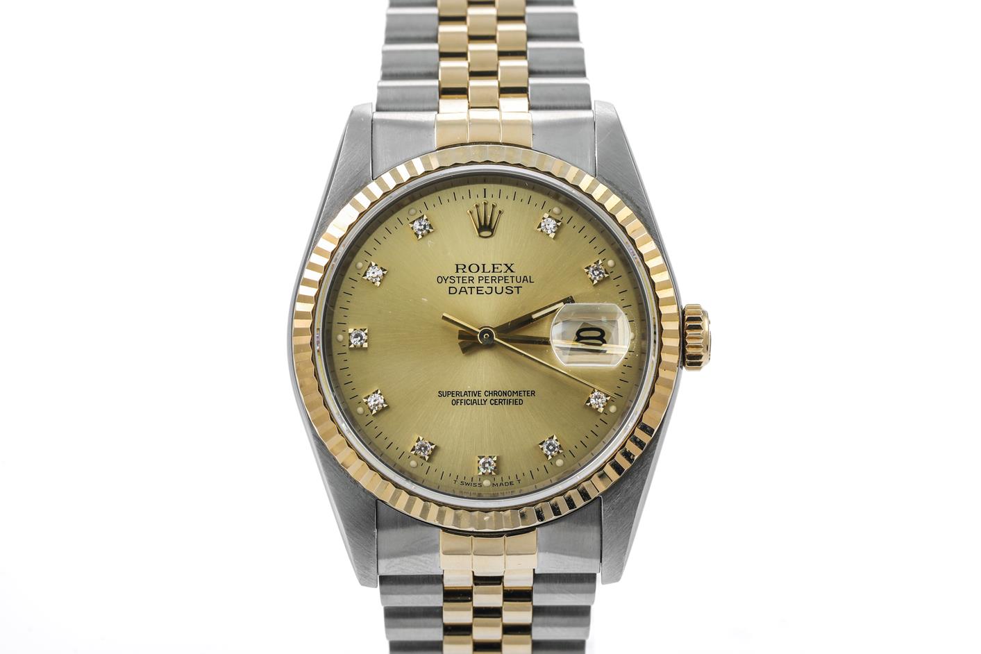 Rolex Oyster Perpetual Datejust 18ct yellow gold & stainless steel mens automatic watch. Gold dial, Diamond indicators, date, case diameter: 36mm, wrist size: 19cm, Swiss made. Ref# 16233G, Circa: 1989. With Rolex two-tone Jubilee bracelet and clasp. With Certificate of Authenticity, Rolex Guarantee Certificate dated 08/10/1989 and Rolex box. 3 month FSA warranty. (Pre-owned)