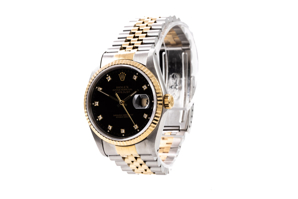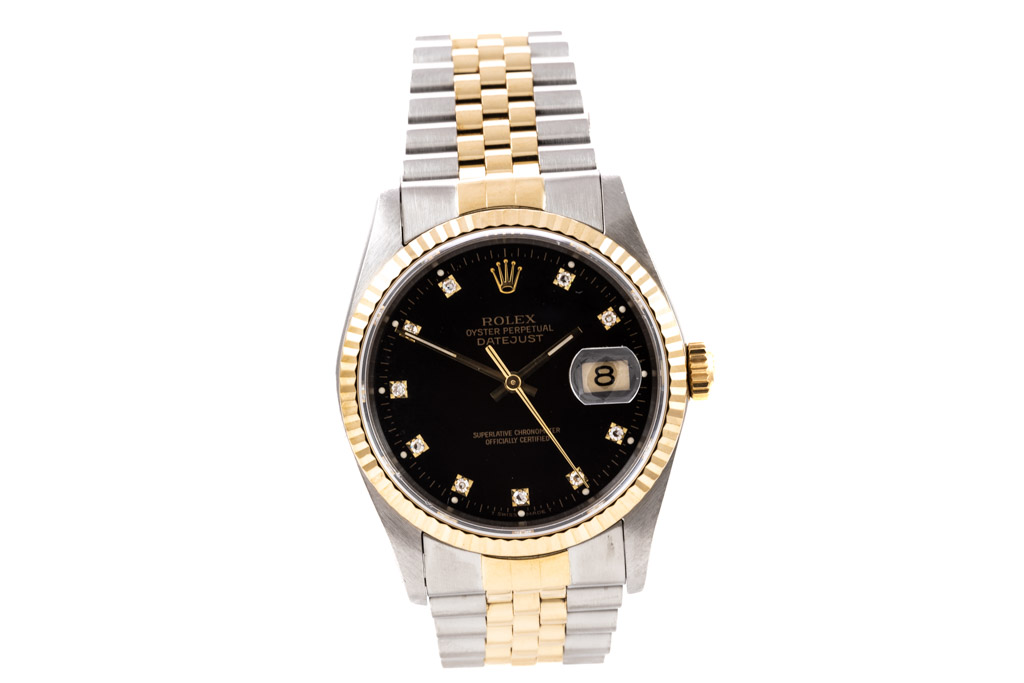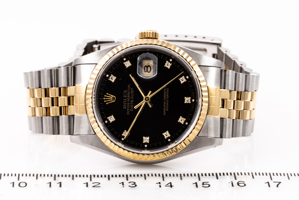 Rolex Oyster Perpetual Datejust 18ct yellow gold and stainless steel automatic men's watch. Black dial, Diamond indicators, date, case diameter: 36mm wrist size: 19cm, Swiss made. Ref# 16233G, Circa: 1991. With Rolex two tone jubilee bracelet and clasp. With Certificate of Authenticity and Rolex box. 3 month FSA warranty. (Pre-owned)
