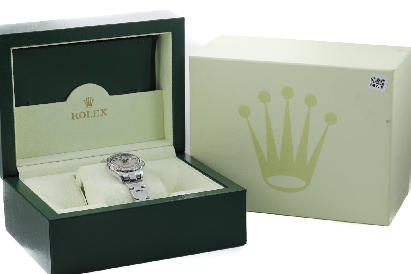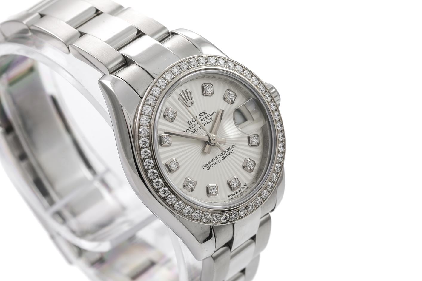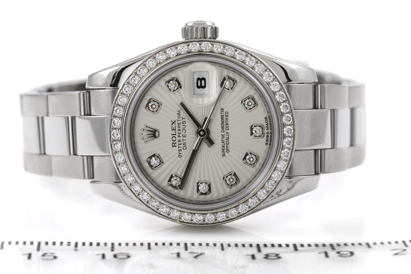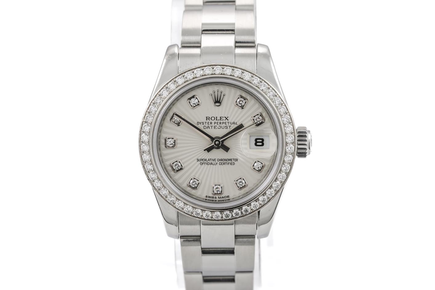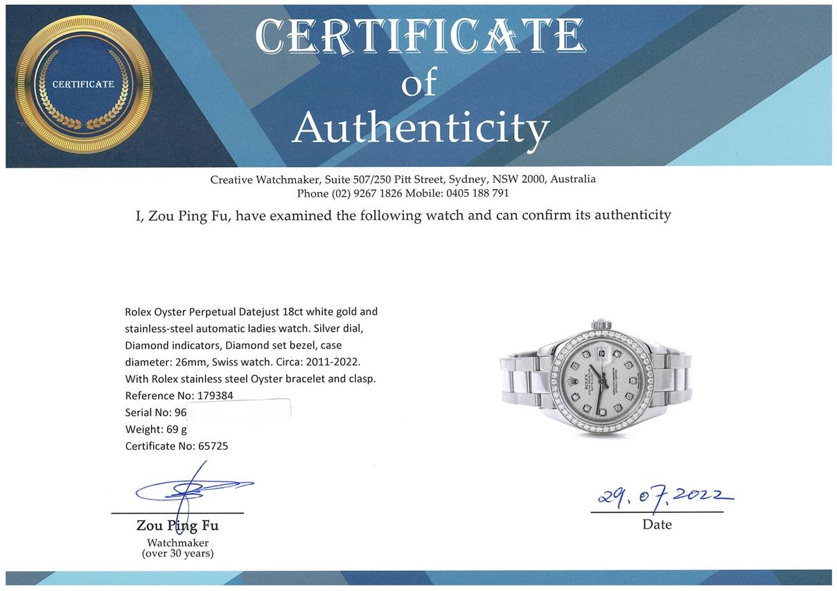 Rolex Oyster Perpetual Datejust 18ct white gold and stainless steel automatic ladies watch. Silver dial, Diamond indicators, Diamond set bezel, case diameter: 26mm, wrist size: 15.5cm, Swiss watch. Ref# 179384, Circa: 2011-2022. With Rolex stainless steel Oyster bracelet and clasp. With Certificate of Authenticity, Rolex International Guarantee card dated 31/08/2012, Rolex International Service Guarantee Card dated 17/12/2020 and Rolex Box. 3 month FSA warranty. (Pre-owned)