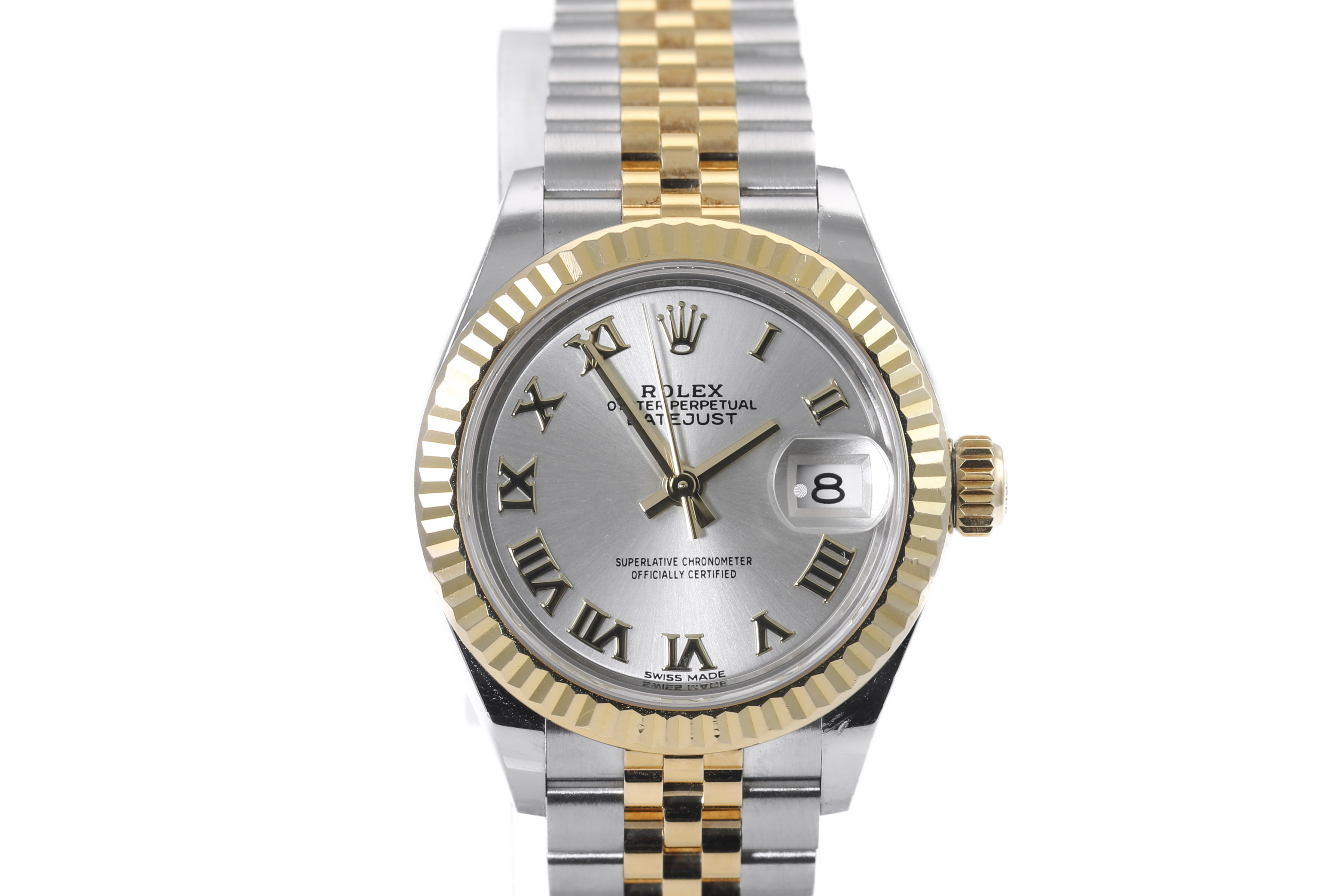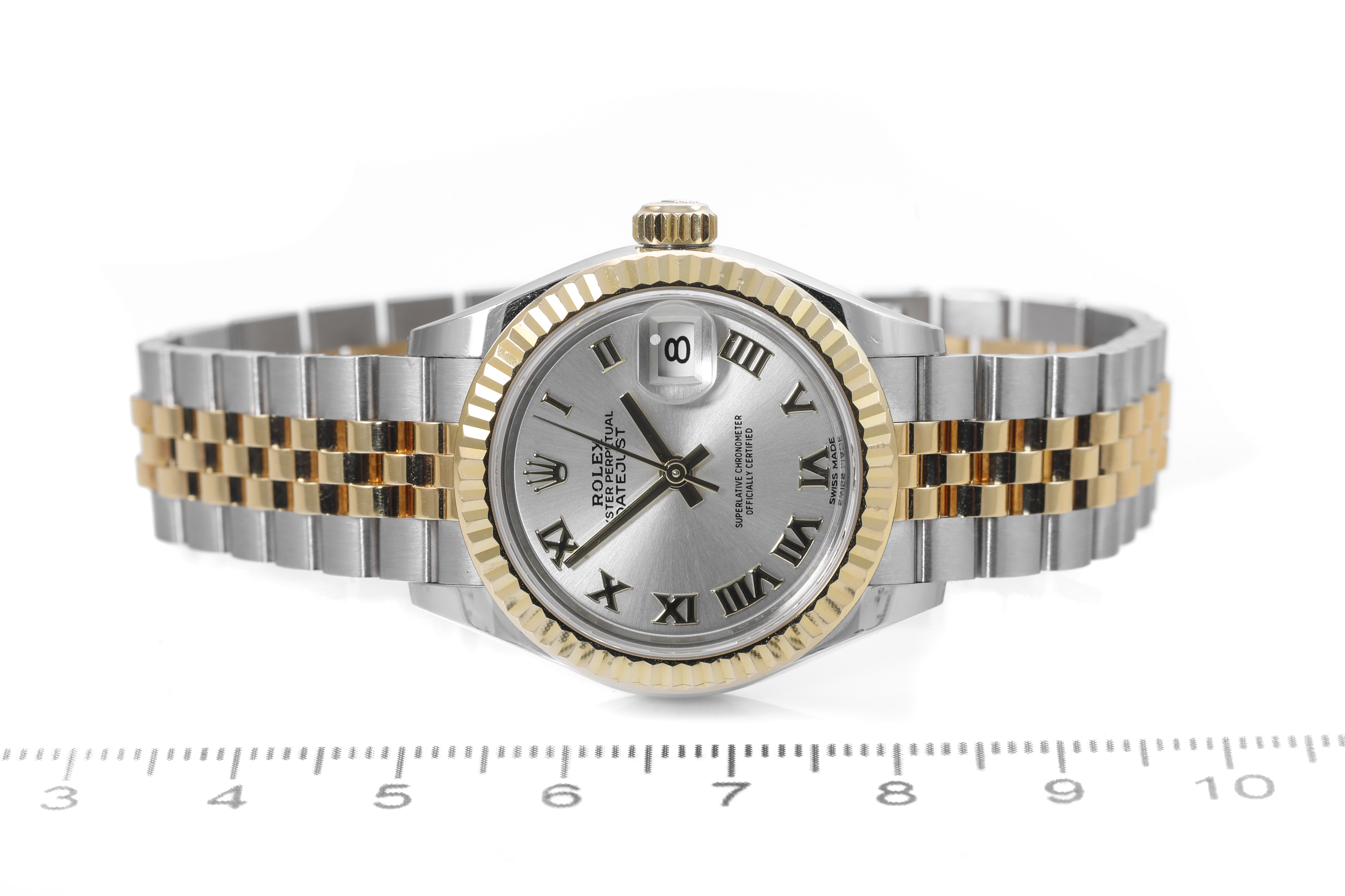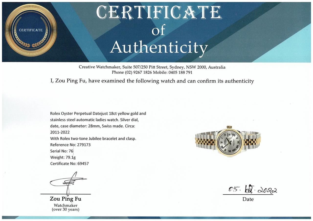 Rolex Oyster Perpetual Datejust 18ct yellow gold and stainless steel automatic ladies watch. Silver dial, date, case diameter: 28mm, wrist size: 15.5cm, Swiss made. Ref# 279173. Circa: 2011-2022. With Rolex two-tone Jubilee bracelet and clasp. With Certificate of Authenticity, Rolex International Warranty Card dated 26/12/2017 and Rolex box. 3 month FSA warranty. (Pre-owned)