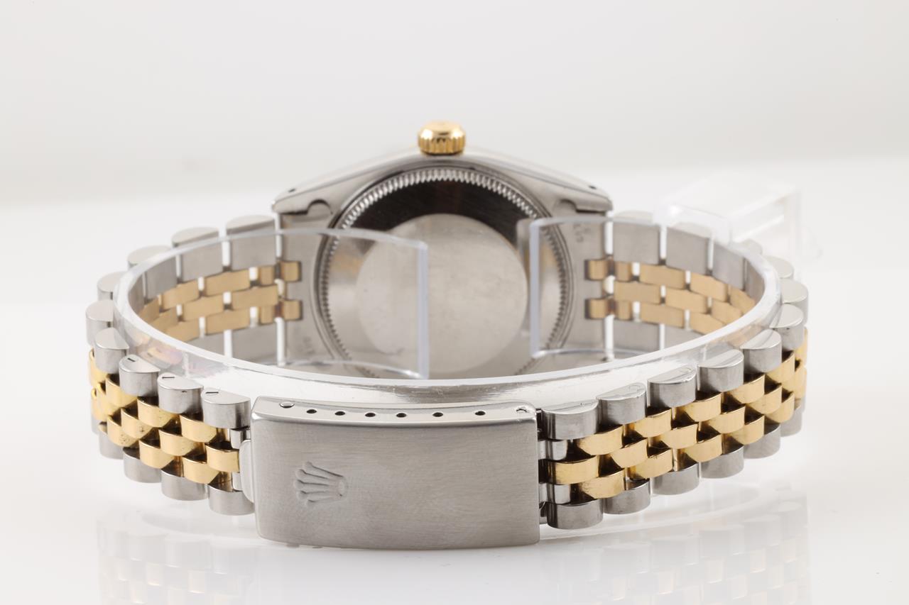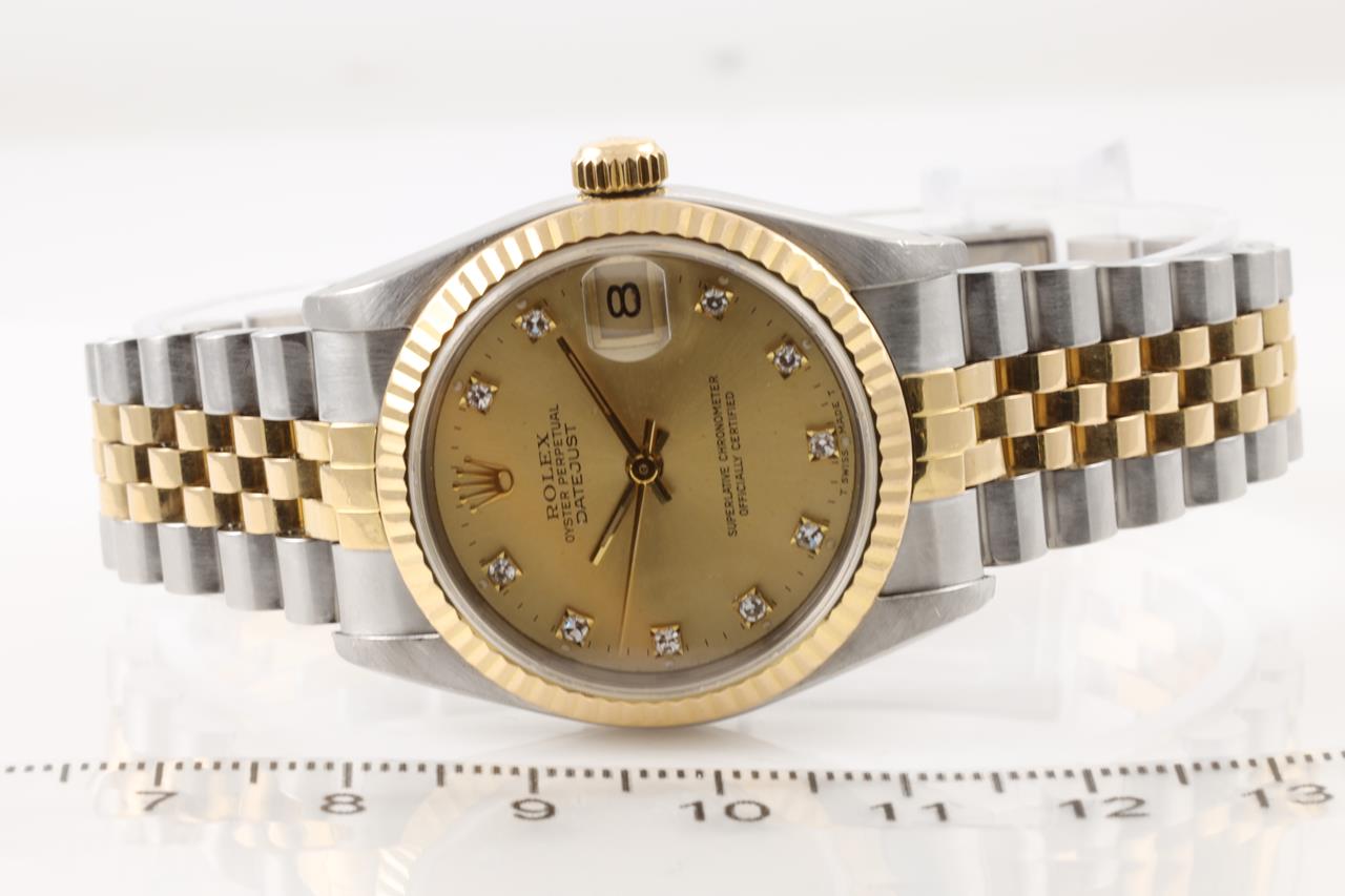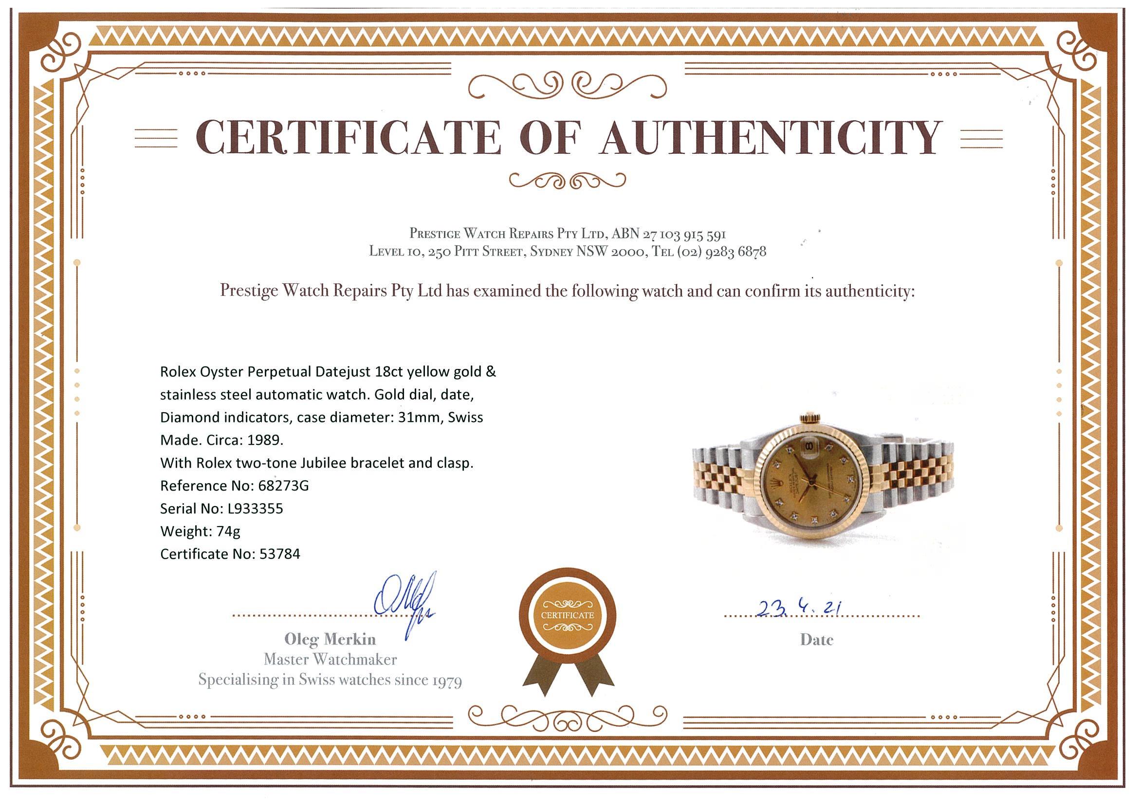 Rolex Oyster Perpetual Datejust 18ct yellow gold & stainless steel automatic watch. Gold dial, date, Diamond indicators, case diameter: 31mm, wrist size: 18cm, Swiss Made. Ref# 68273G, Circa: 1989. With Rolex two-tone Jubilee bracelet and clasp. With certificate of authenticity. 3 month FSA warranty. (Pre-owned)