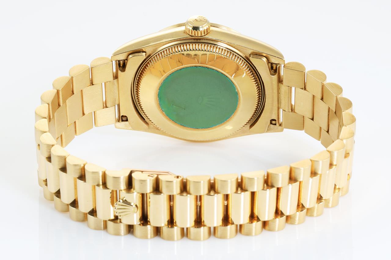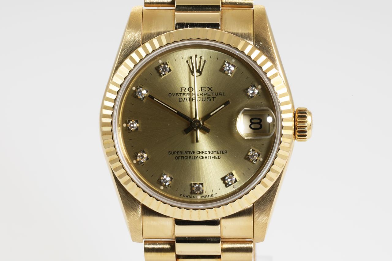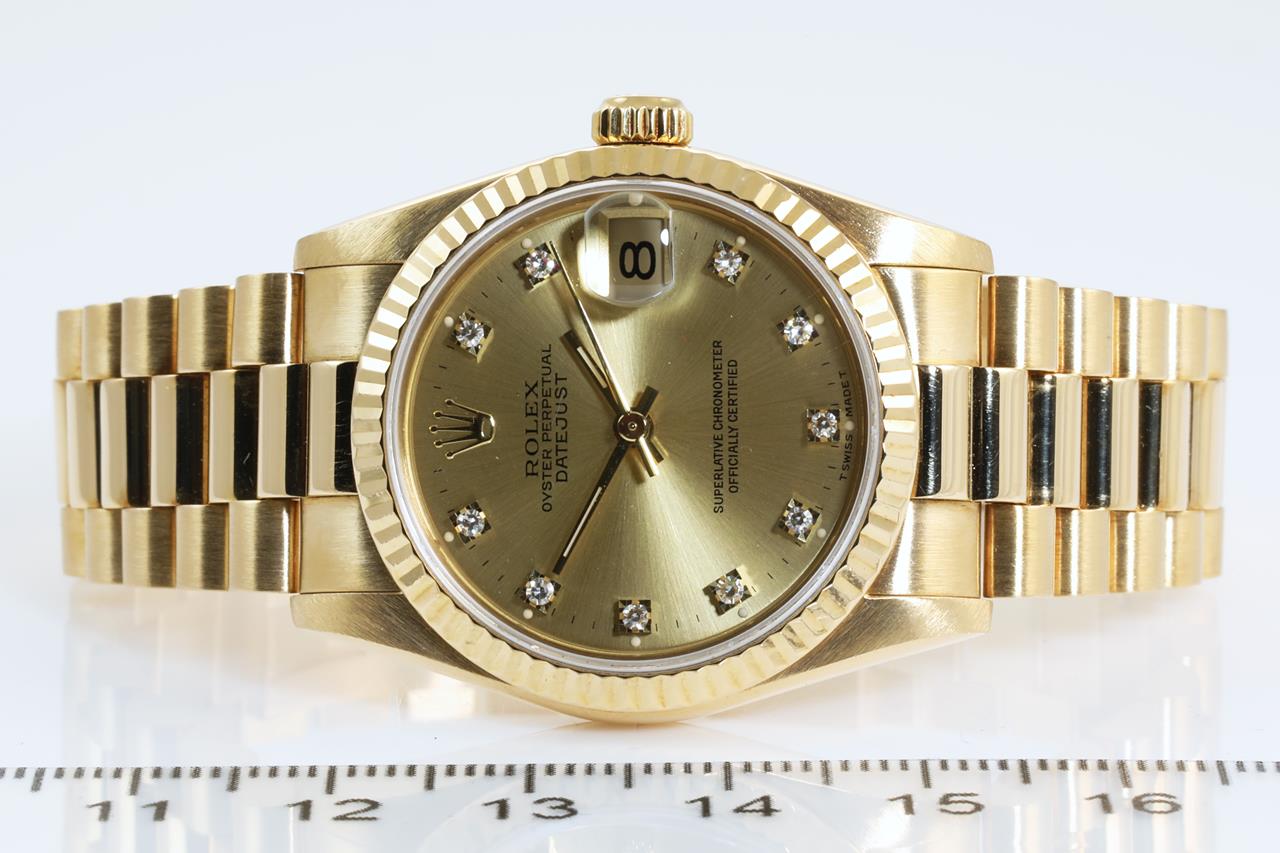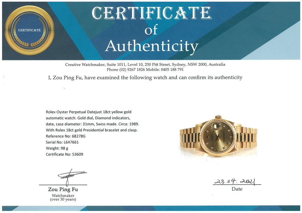 Rolex Oyster Perpetual Datejust 18ct yellow gold automatic watch. Gold dial, Diamond indicators, date, case diameter: 31mm, wrist size: 16cm, Swiss made. Ref# 68278G, Circa: 1989. With Rolex 18ct gold Presidential bracelet and clasp. With certificate of authenticity and Rolex box. 3 month FSA warranty. (Pre-owned)