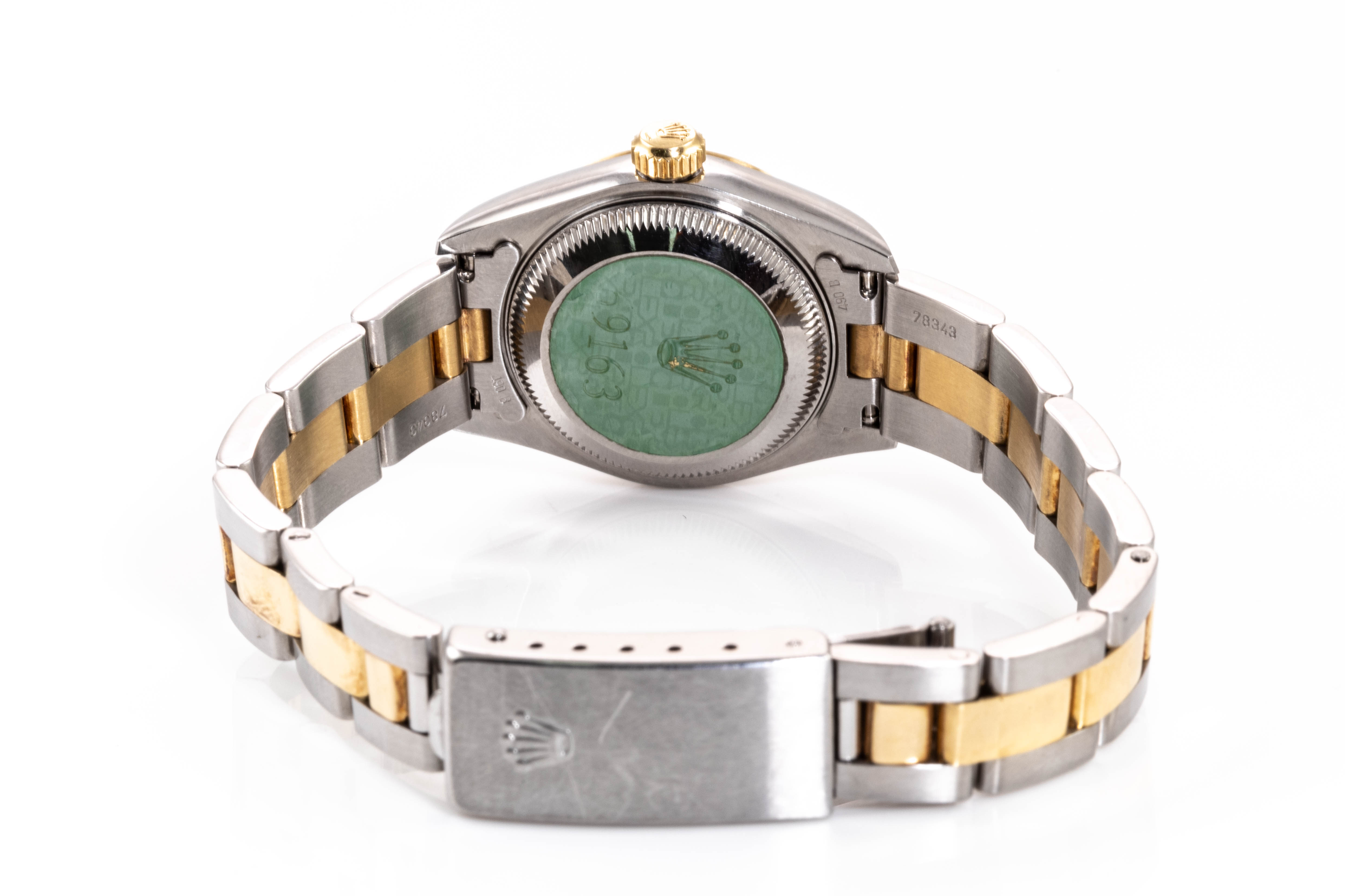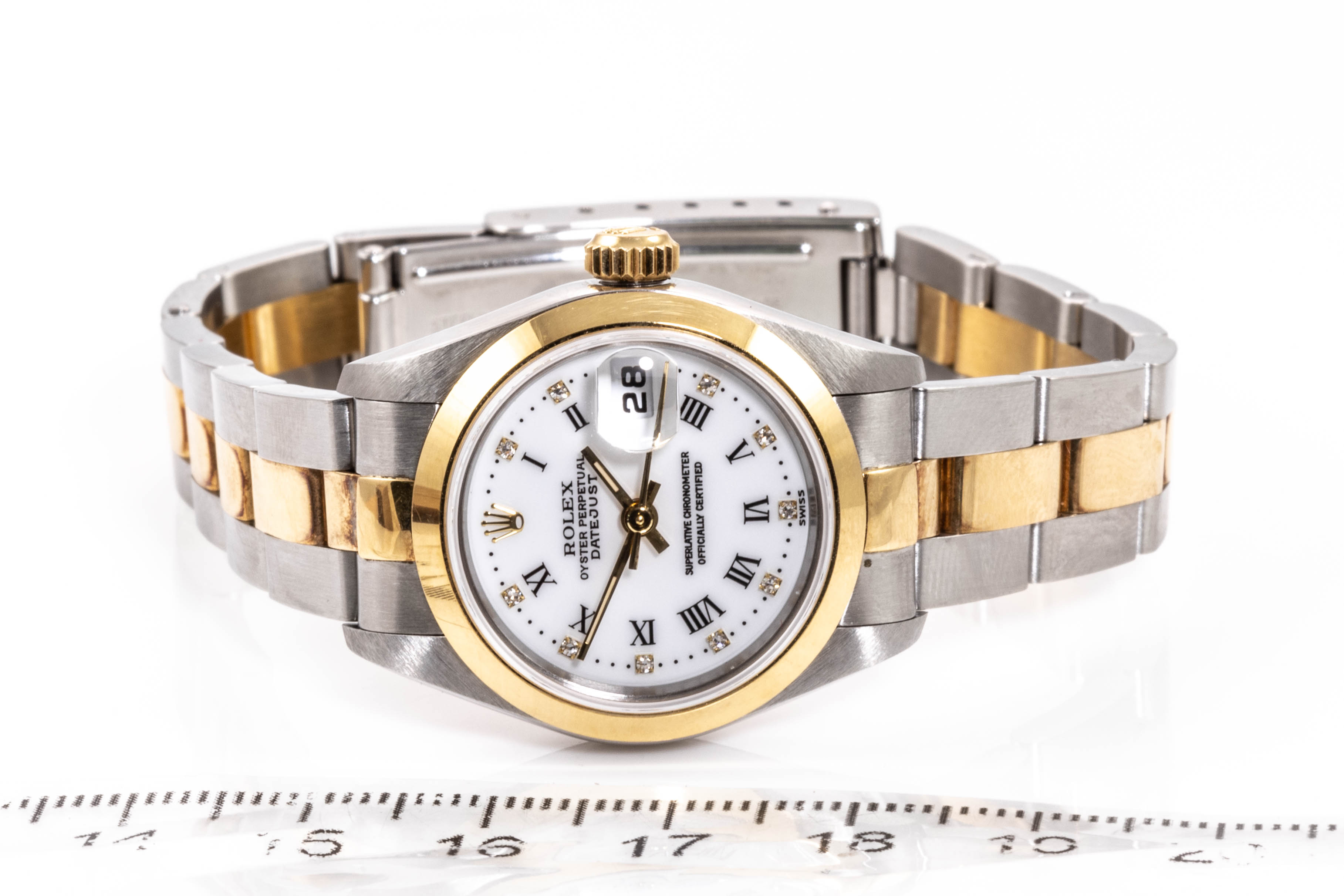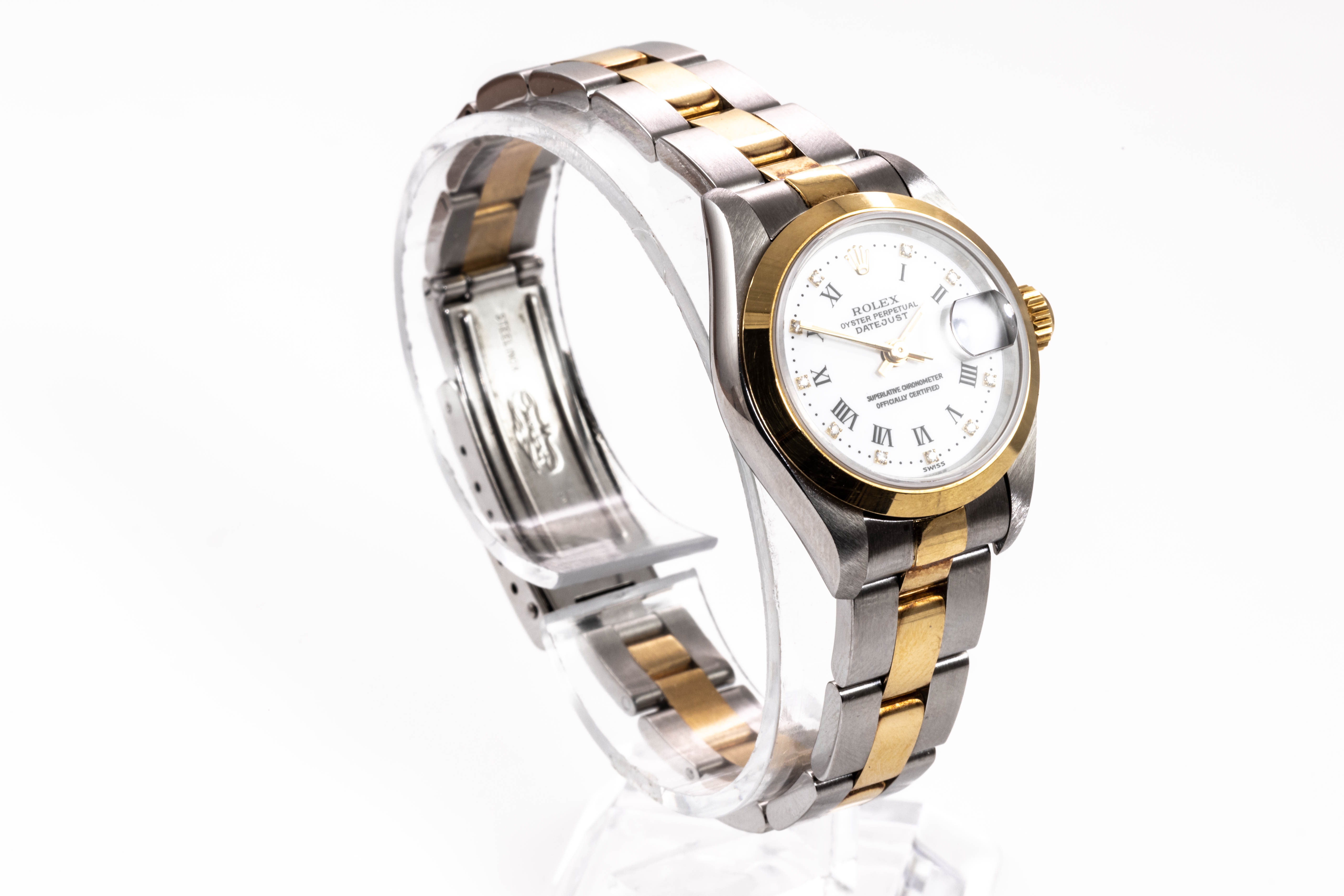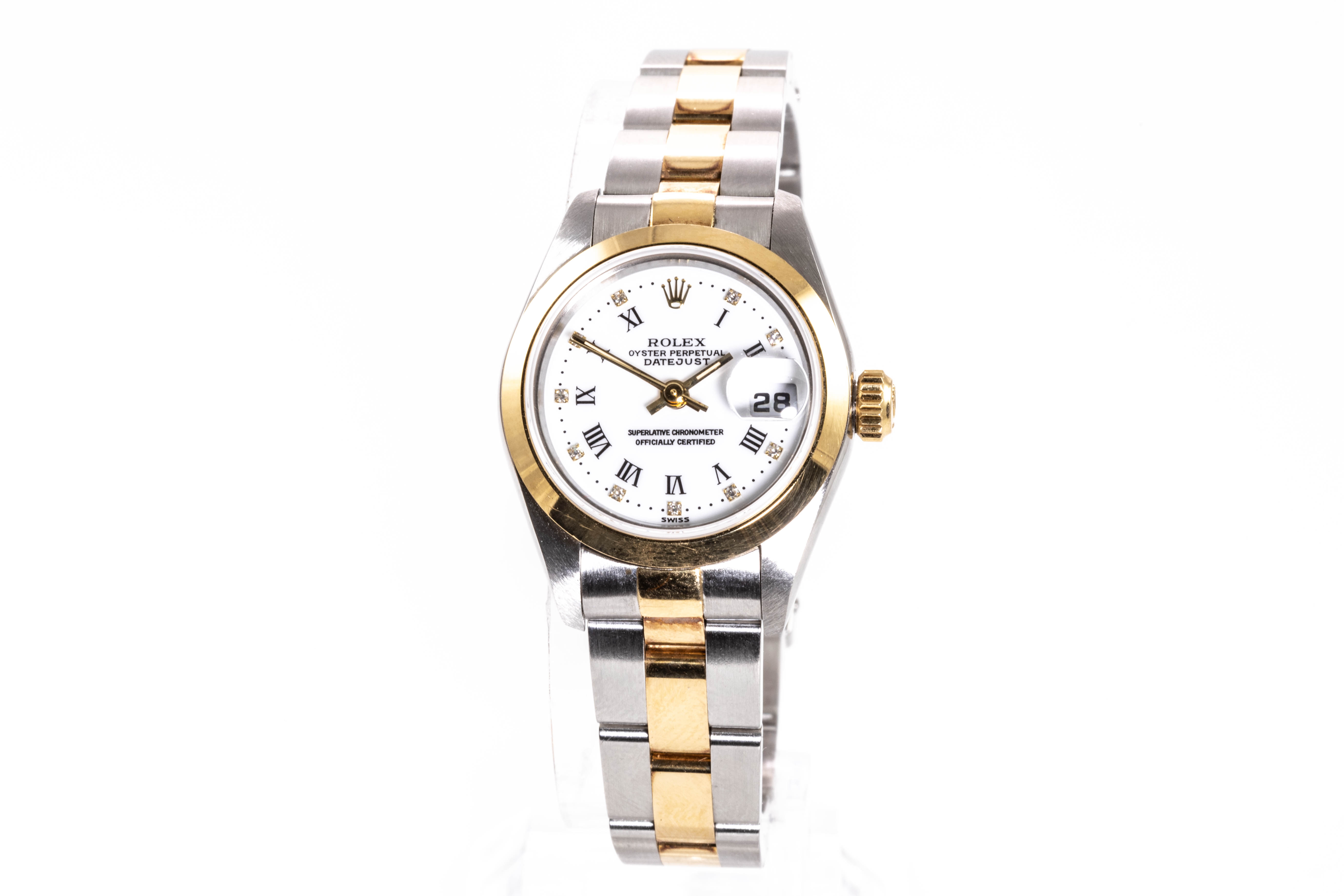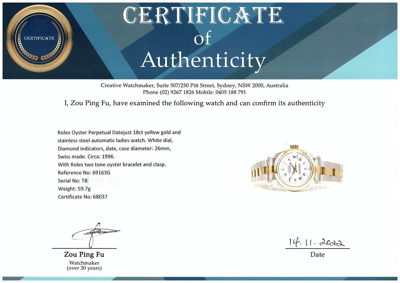 Rolex Oyster Perpetual Datejust 18ct yellow gold and stainless steel automatic ladies watch. White dial, date, Diamond indicators, case diameter: 26mm, wrist size: 18cm, Swiss made. Ref# 69163G. Circa: 1996. With Rolex two tone oyster bracelet and clasp. With Certificate of Authenticity, Rolex Guarantee Certificate dated 10/1997 and Rolex box. 3 month FSA warranty. (Pre-owned)