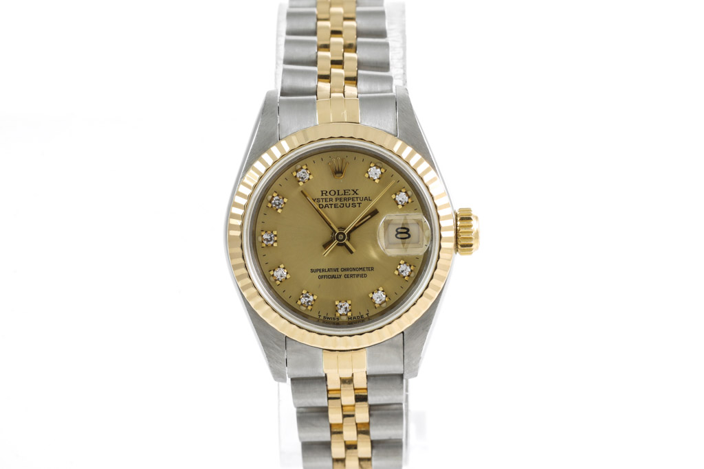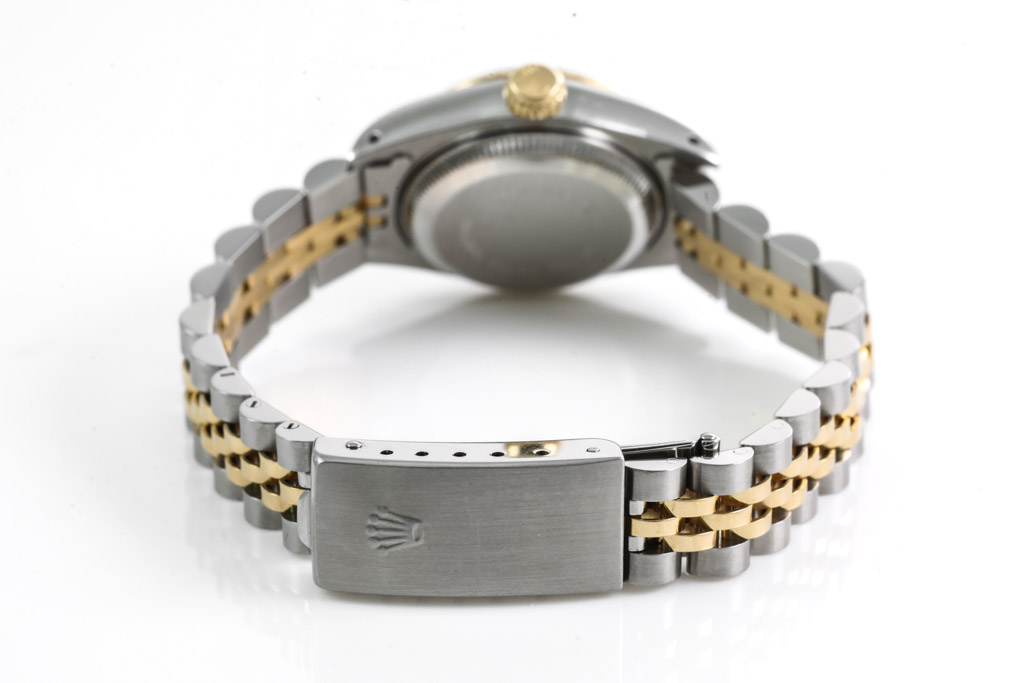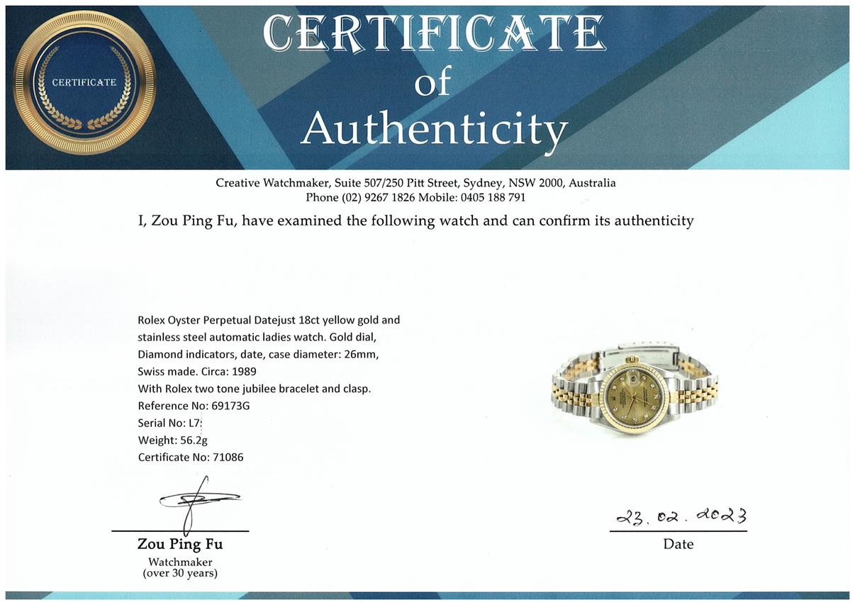 Rolex Oyster Perpetual Datejust 18ct yellow gold and stainless steel automatic ladies watch. Gold dial, Diamond indicators, date, case diameter: 26mm, wrist size: 16cm, Swiss made. Ref# 69173G. Circa: 1989. With Rolex two tone jubilee bracelet and clasp. With Certificate of Authenticity and Rolex box. 3 month FSA warranty (Pre-owned)