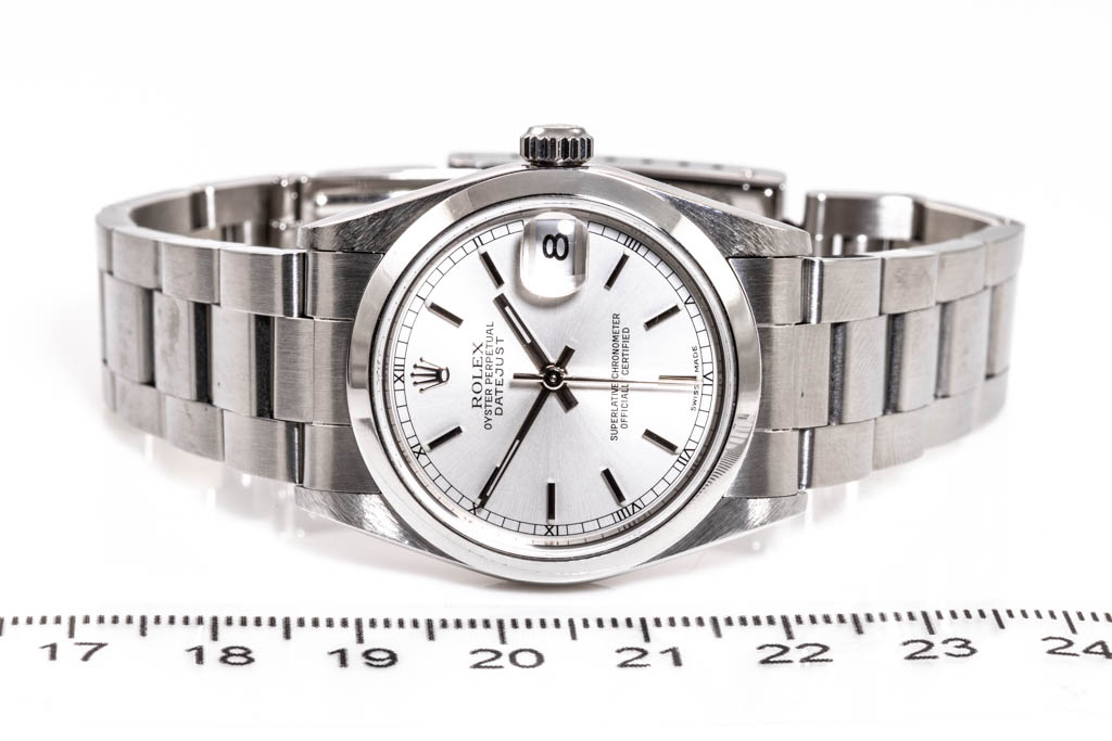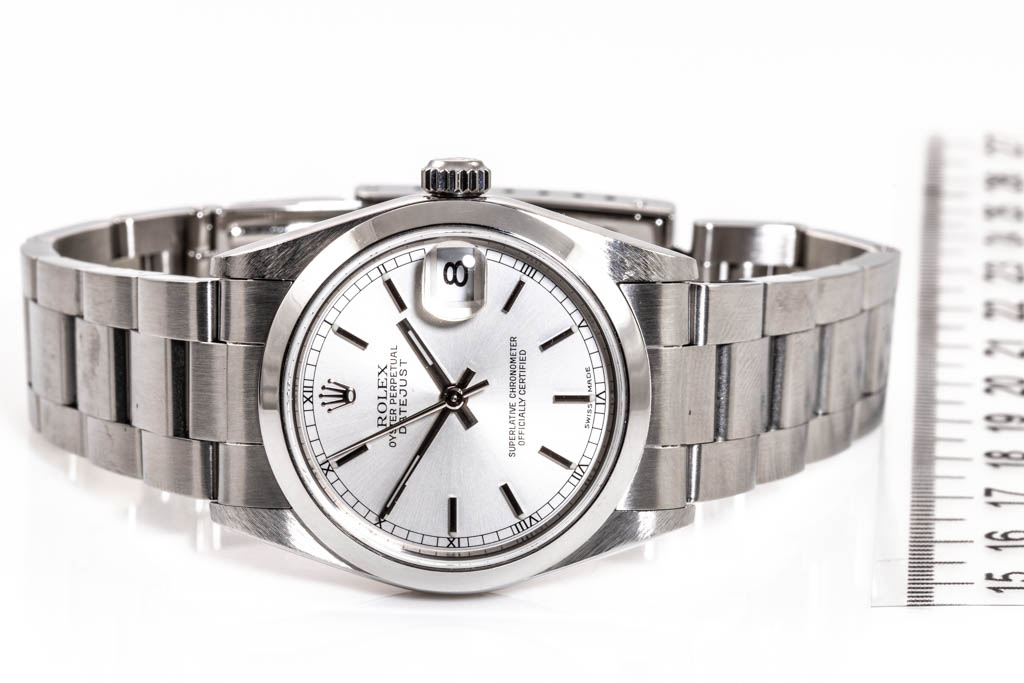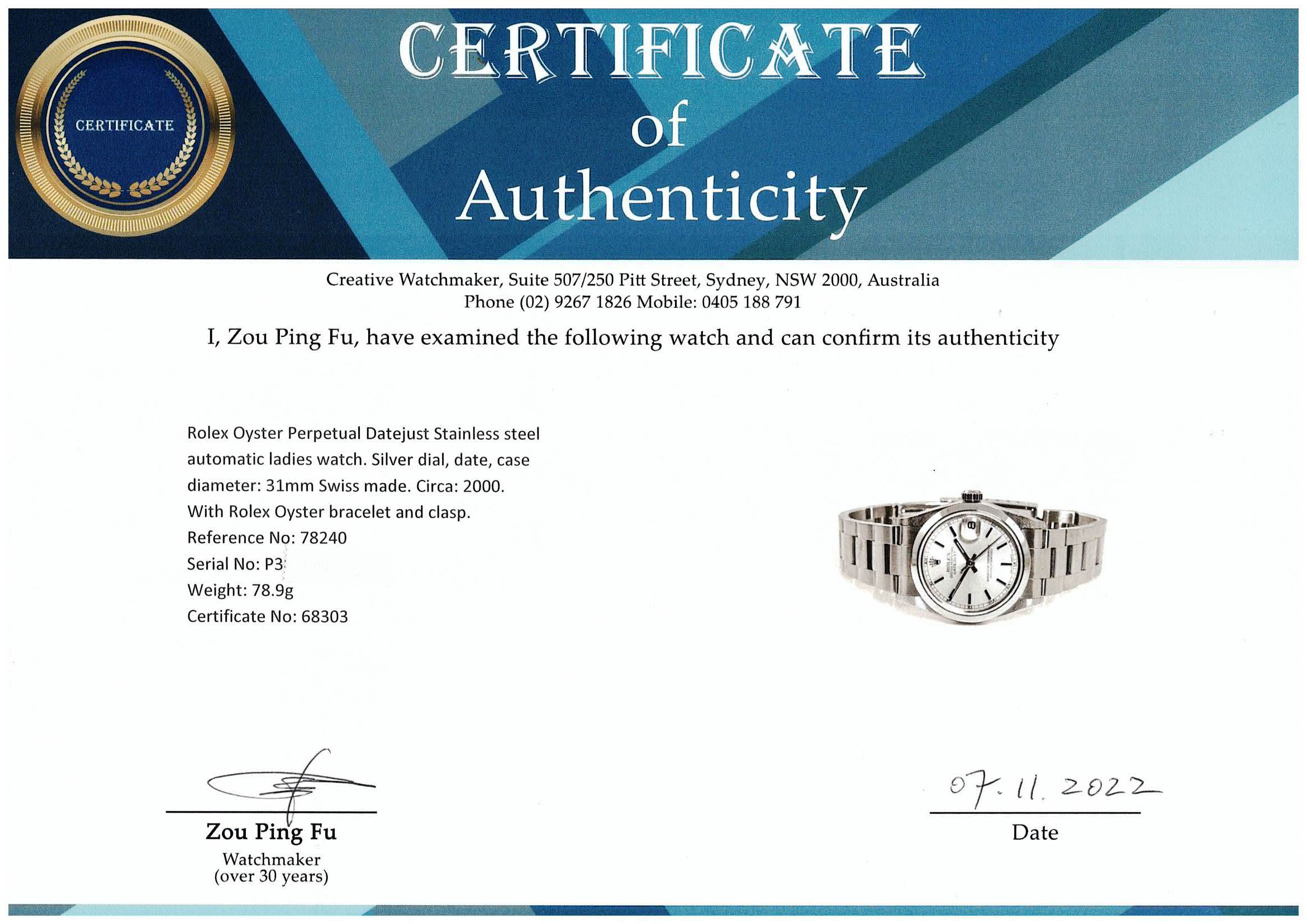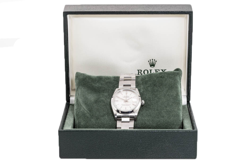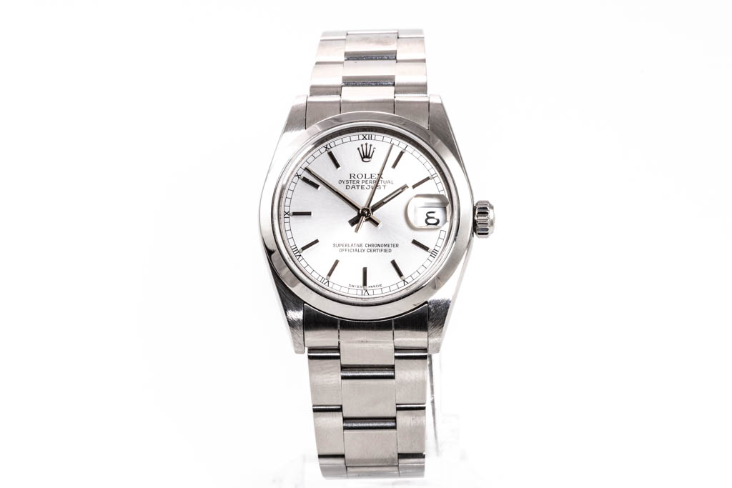 Rolex Oyster Perpetual Datejust Stainless steel automatic ladies watch. Silver dial, date, case diameter: 31mm wrist size: 18cm, Swiss made. Ref# 78240, Circa: 2000. With Rolex Oyster bracelet and clasp. With Certificate of Authenticity & Rolex box. 3 month FSA warranty. (Pre-owned)