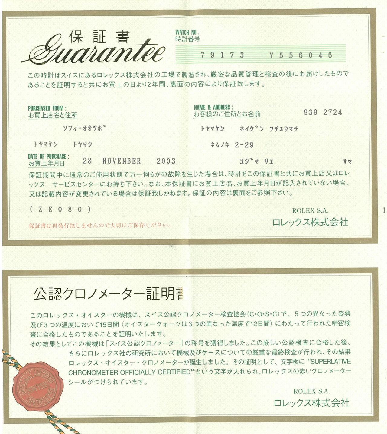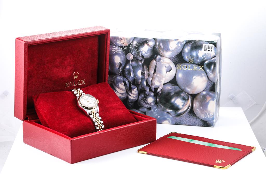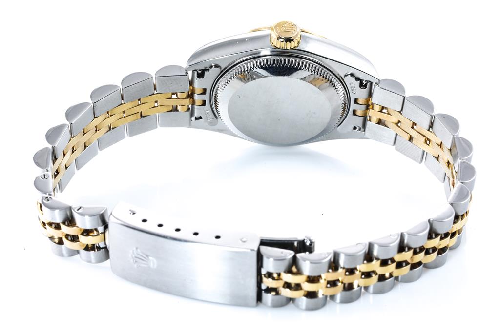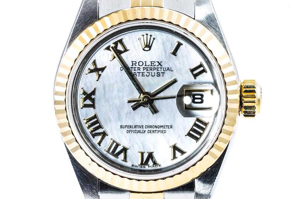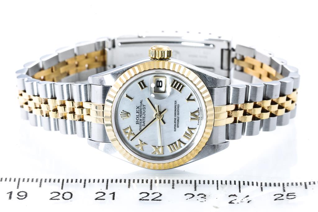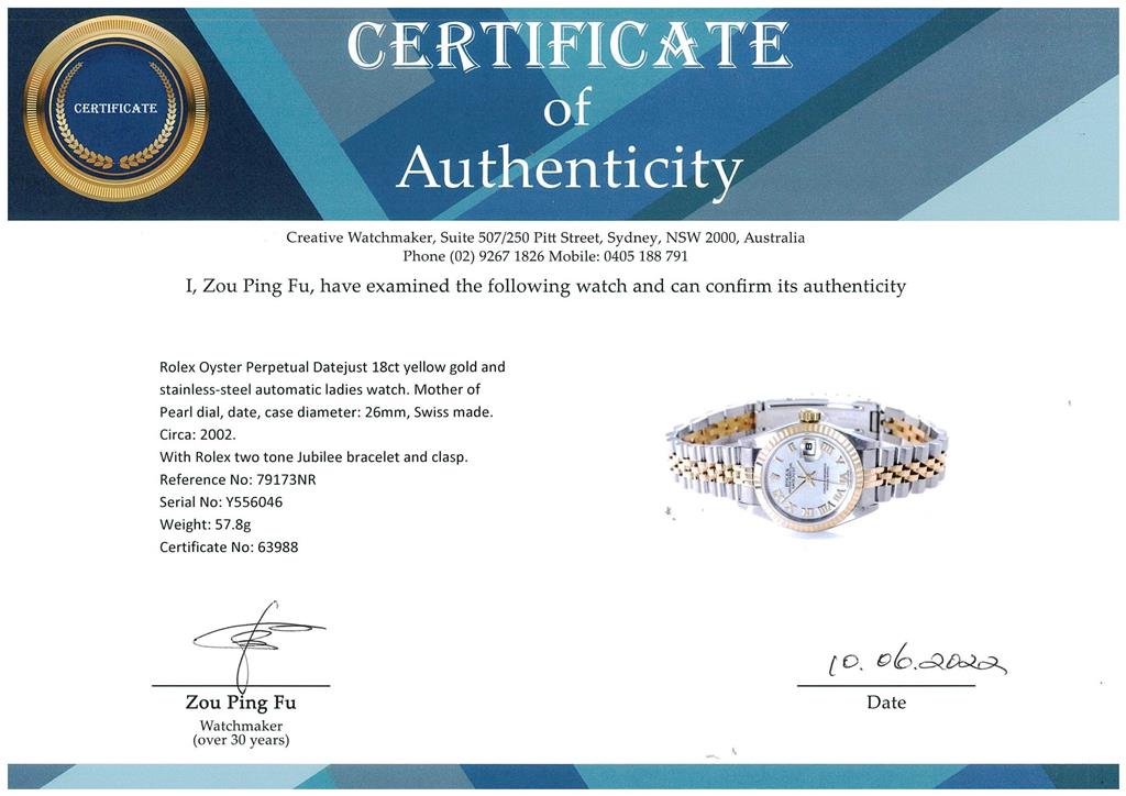 Rolex Oyster Perpetual Datejust 18ct yellow gold and stainless steel automatic ladies watch. Mother of Pearl dial, date, case diameter: 26mm, wrist size: 17cm, Swiss made. Ref# 79173NR, Circa: 2002. With Rolex two tone Jubilee bracelet and clasp. With Certificate of Authenticity, Rolex Guarantee Certificate dated 28/11/2003 and Rolex box. 3 month FSA warranty. (Pre-owned)