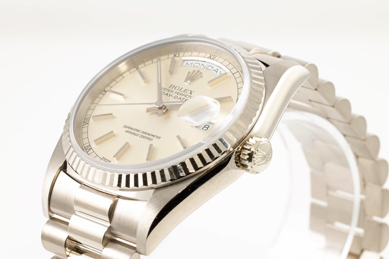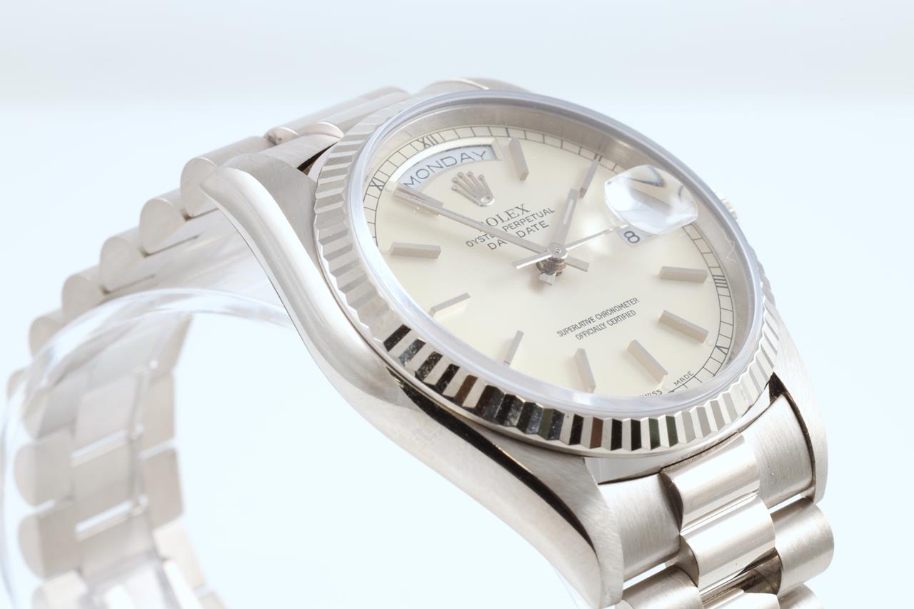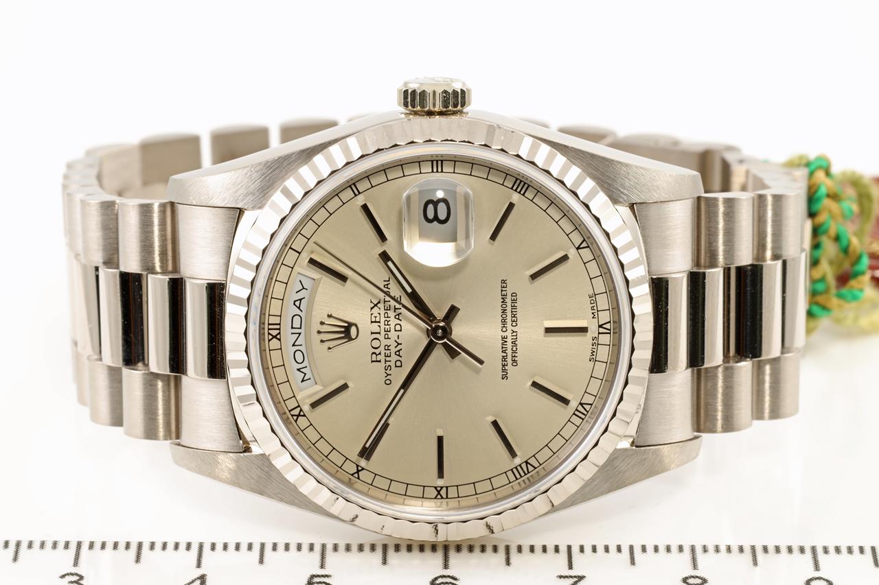 Rolex Oyster Perpetual Day-Date 18ct white gold automatic mens watch. Silver colour dial, day & date, case diameter: 36mm, wrist size: 17cm, Swiss made. Ref# 18239, Circa: 1995. With Rolex 18ct gold Presidential bracelet & clasp. With certificate of authenticity and Rolex box. 3 month FSA warranty. (Pre-owned)