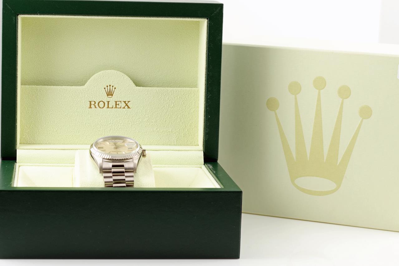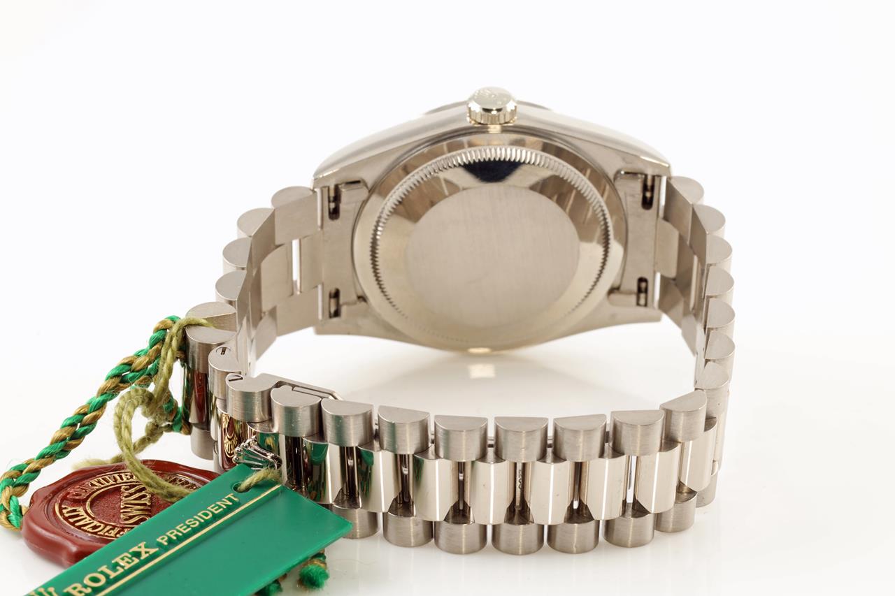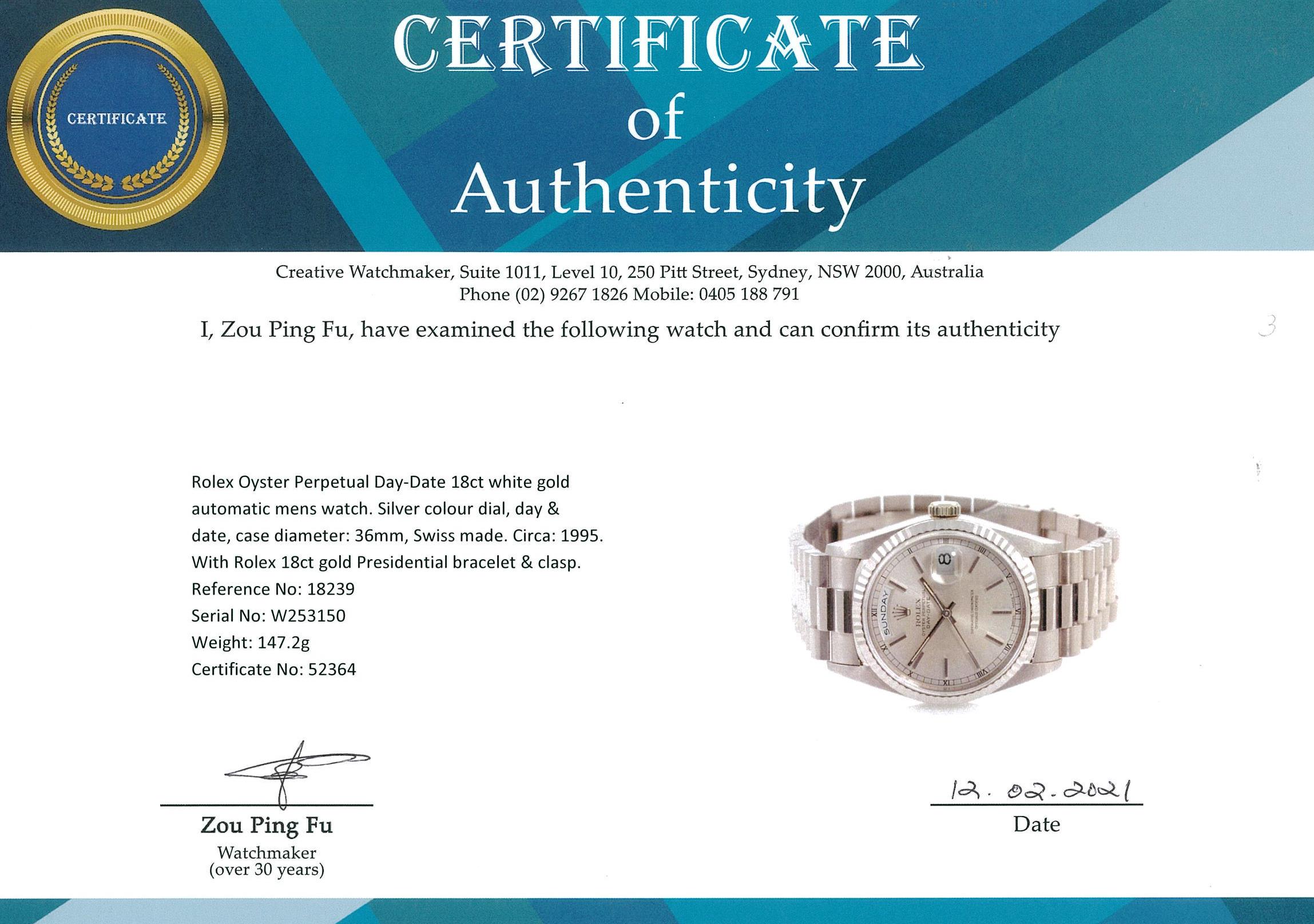 Rolex Oyster Perpetual Day-Date 18ct white gold automatic mens watch. Silver colour dial, day & date, case diameter: 36mm, wrist size: 17cm, Swiss made. Ref# 18239, Circa: 1995. With Rolex 18ct gold Presidential bracelet & clasp. With certificate of authenticity and Rolex box. 3 month FSA warranty. (Pre-owned)