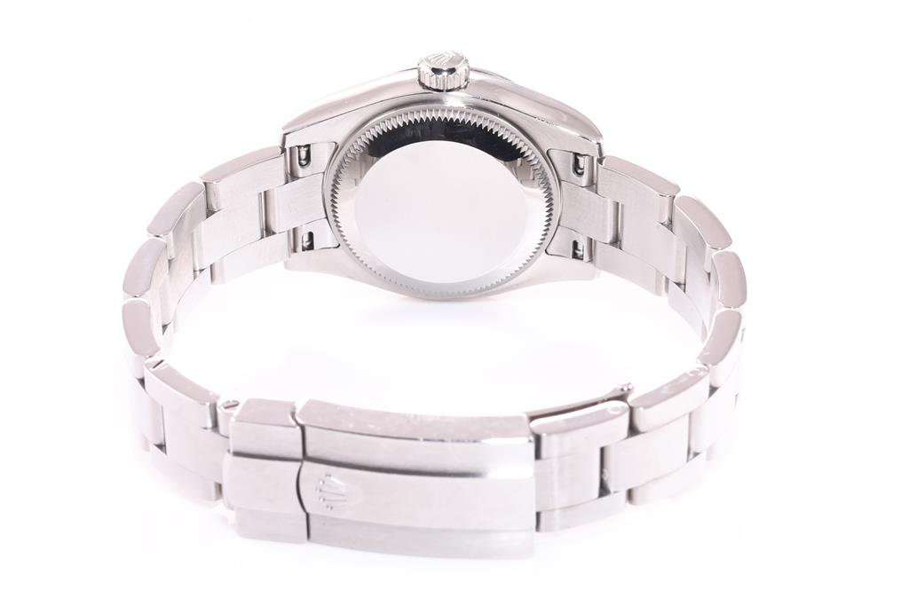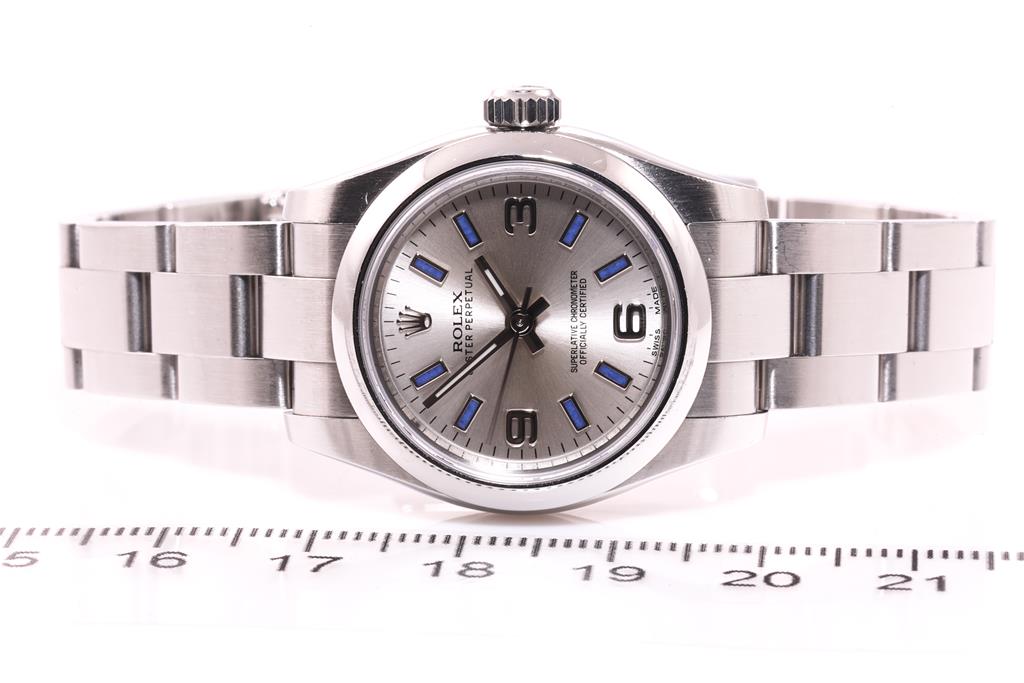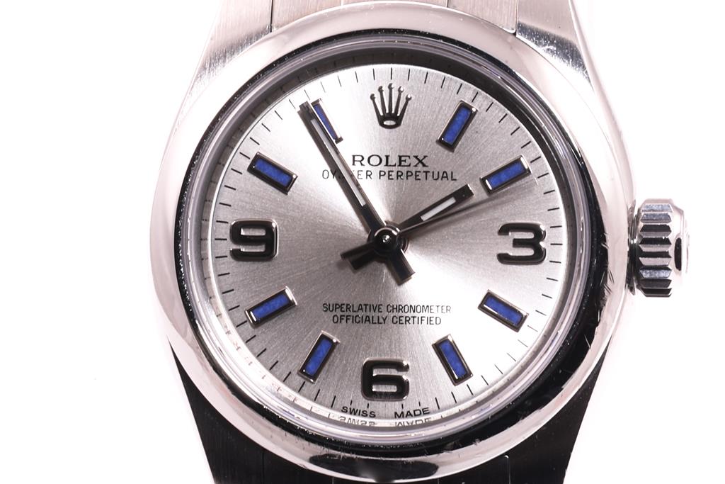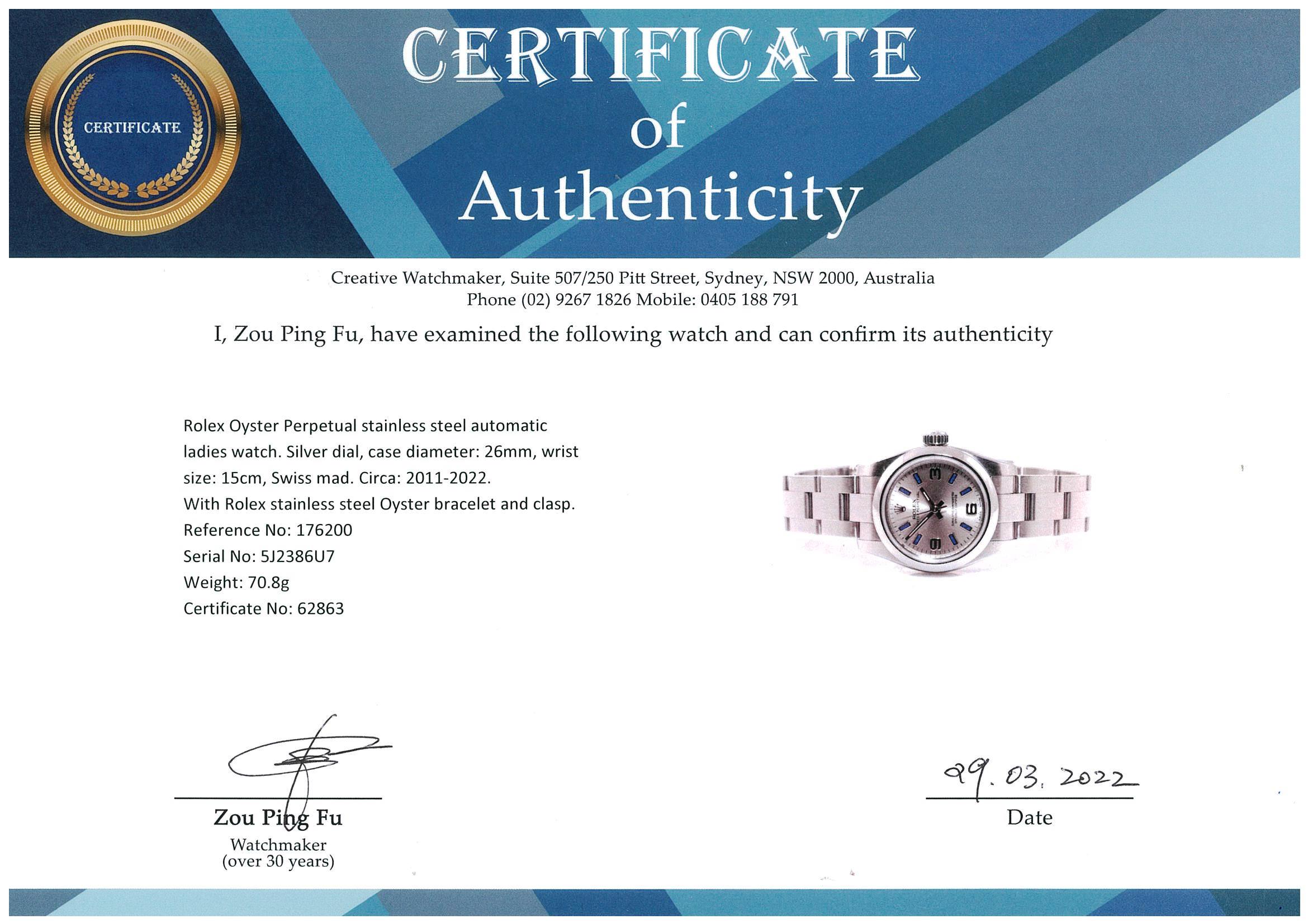 Rolex Oyster Perpetual stainless steel automatic ladies watch. Silver dial, case diameter: 26mm, wrist size: 15cm, Swiss made. Ref# 176200, Circa: 2011-2022. With Rolex stainless steel Oyster bracelet and clasp. With Certificate of Authenticity, Rolex International Guarantee Card dated 06/03/2018 and Rolex box. 3 month FSA warranty. (Pre-owned)