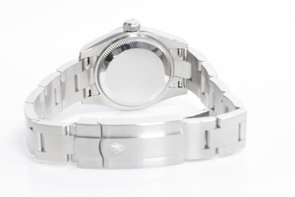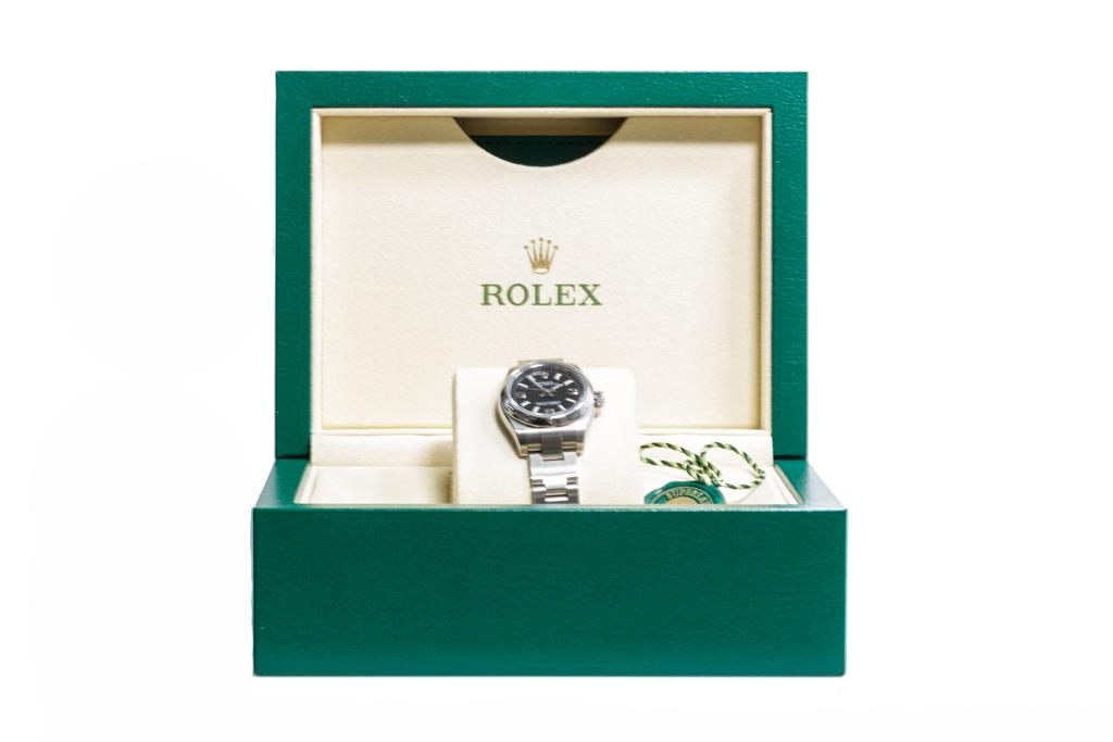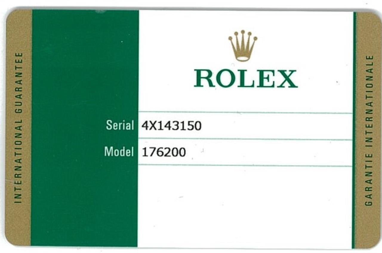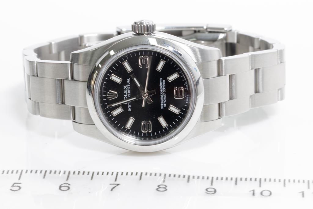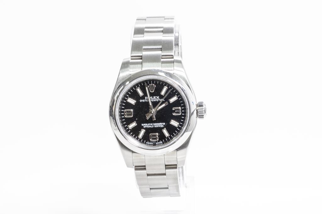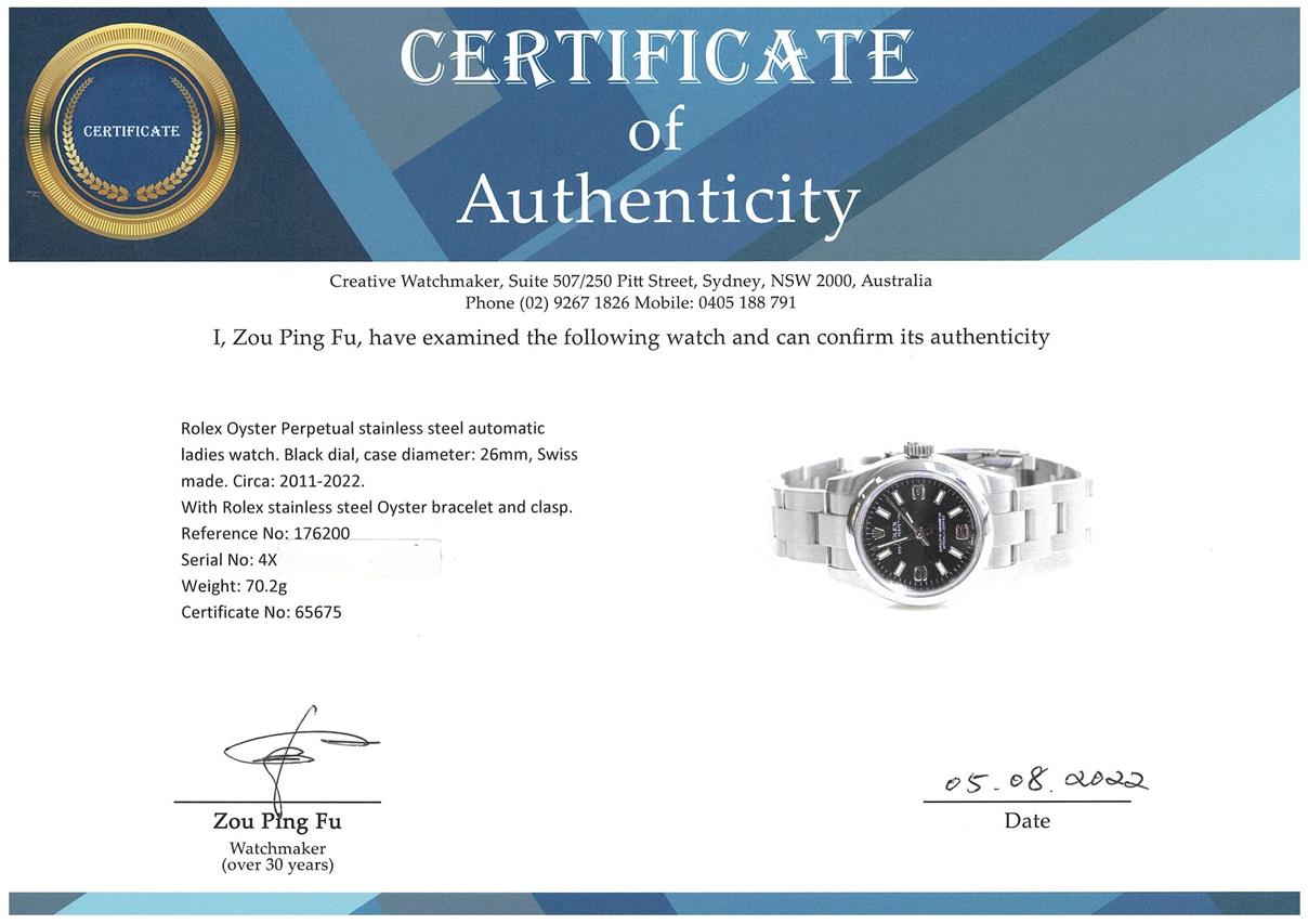 Rolex Oyster Perpetual stainless steel automatic ladies watch. Black dial, case diameter: 26mm, wrist size: 15.5cm, Swiss made. Ref# 176200, Circa: 2011-2022. With Rolex stainless steel Oyster bracelet and clasp. With Certificate of Authenticity, Rolex International Guarantee Card date 10/11/2016 and Rolex box. 3 month FSA warranty. (Pre-owned)