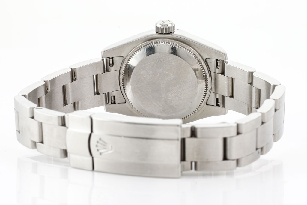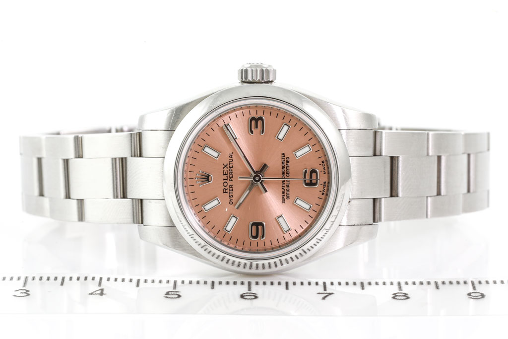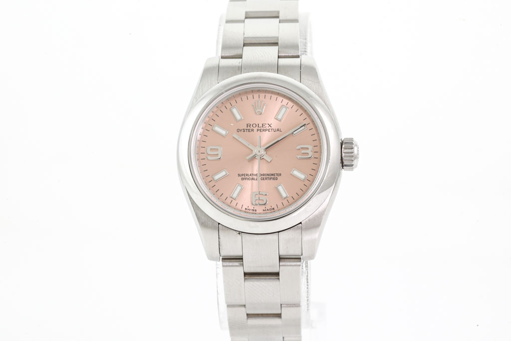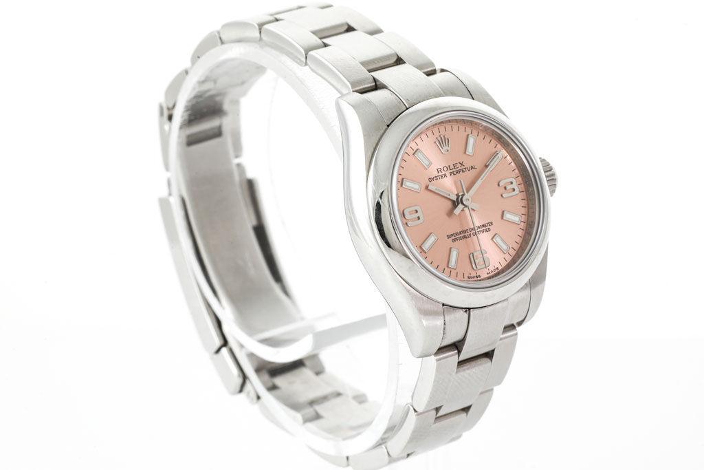 Rolex Oyster Perpetual stainless steel automatic ladies watch. Pink dial, case diameter: 26mm, wrist size: 15cm, Swiss made. Ref# 176200, Circa: 2010. With Rolex stainless steel Oyster bracelet and clasp. With Certificate of Authenticity, Rolex International Guarantee Card dated 23/08/2010 and Rolex box. 3 month FSA warranty. (Pre-owned)
