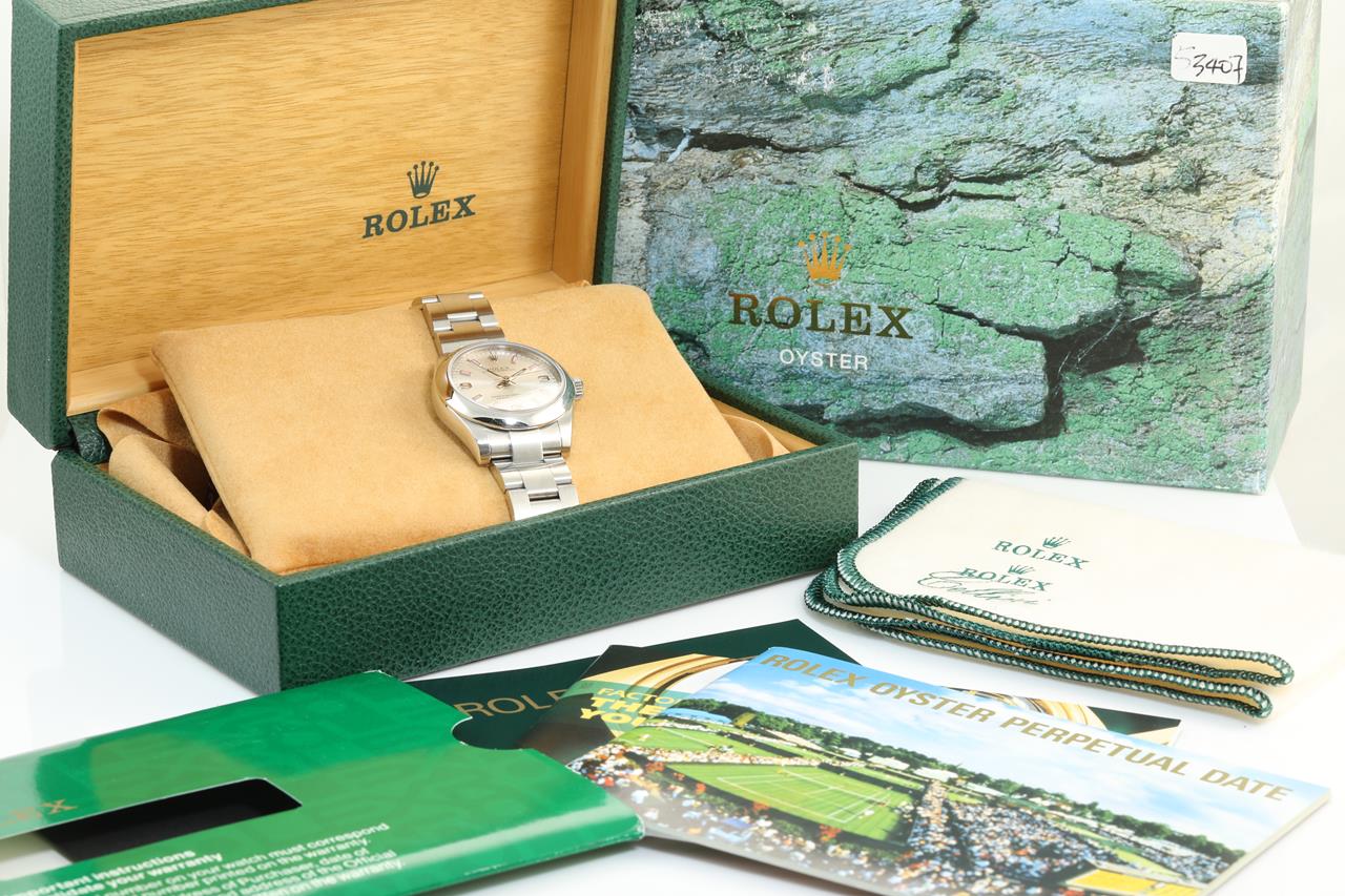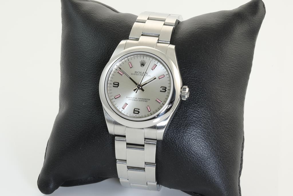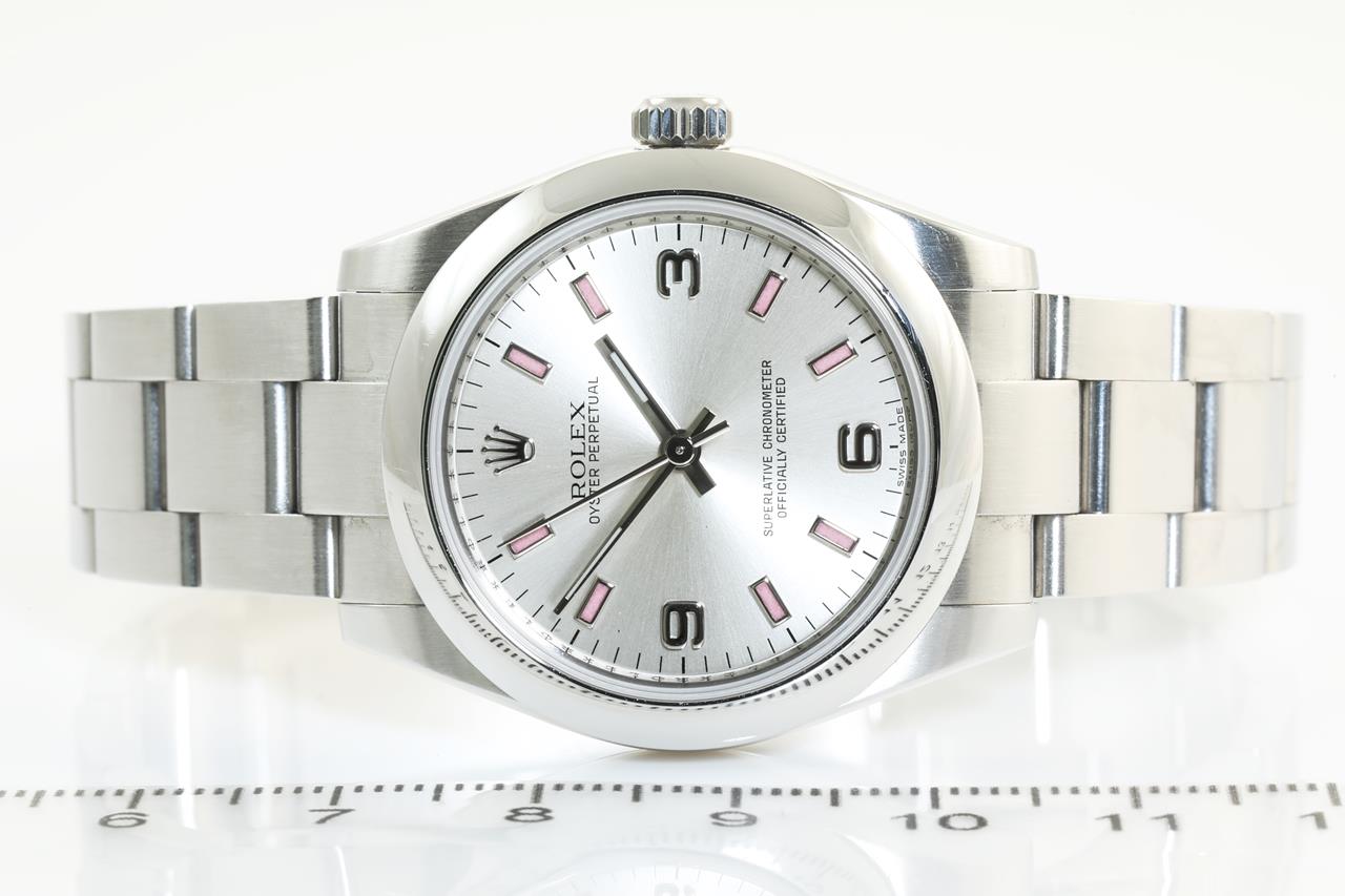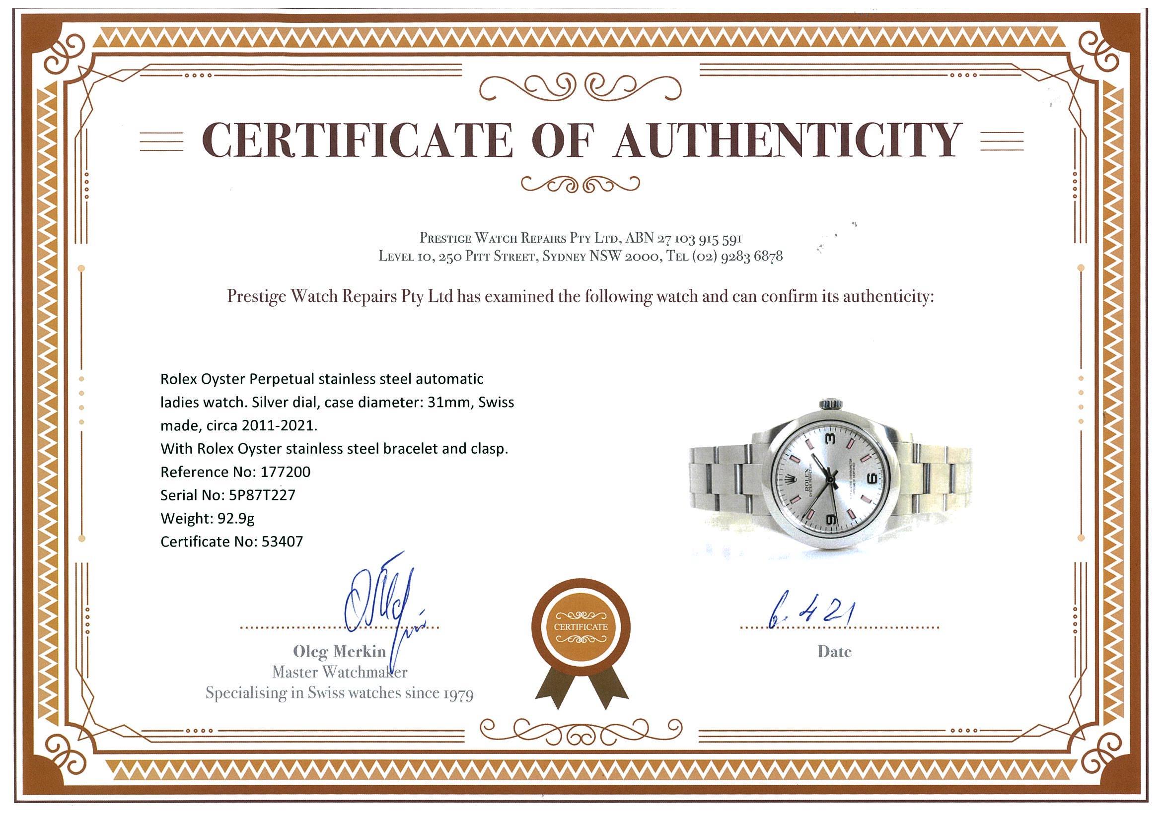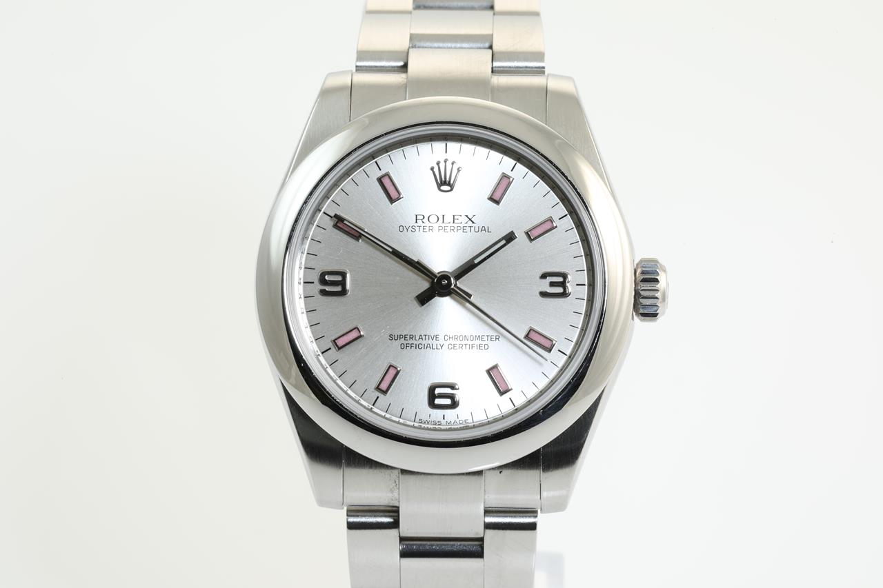 Rolex Oyster Perpetual stainless steel automatic ladies watch. Silver dial, case diameter: 31mm, wrist size:17cm, circa 2011-2021, Ref# 177200, Swiss made. With Rolex Oyster stainless steel bracelet and clasp. With Certificate of Authenticity and Rolex box. 3 month FSA warranty. (Pre-owned)