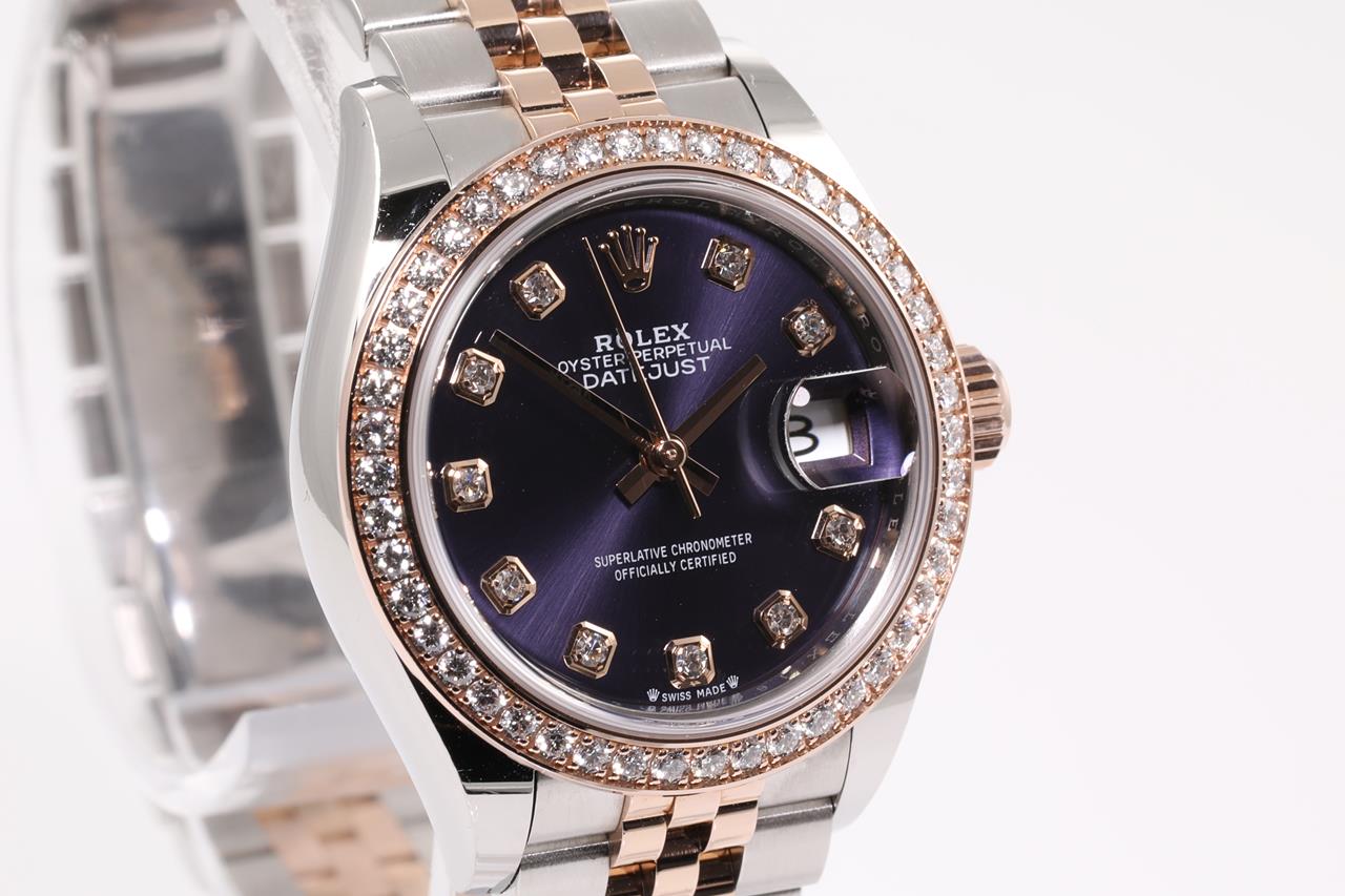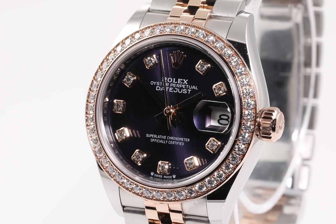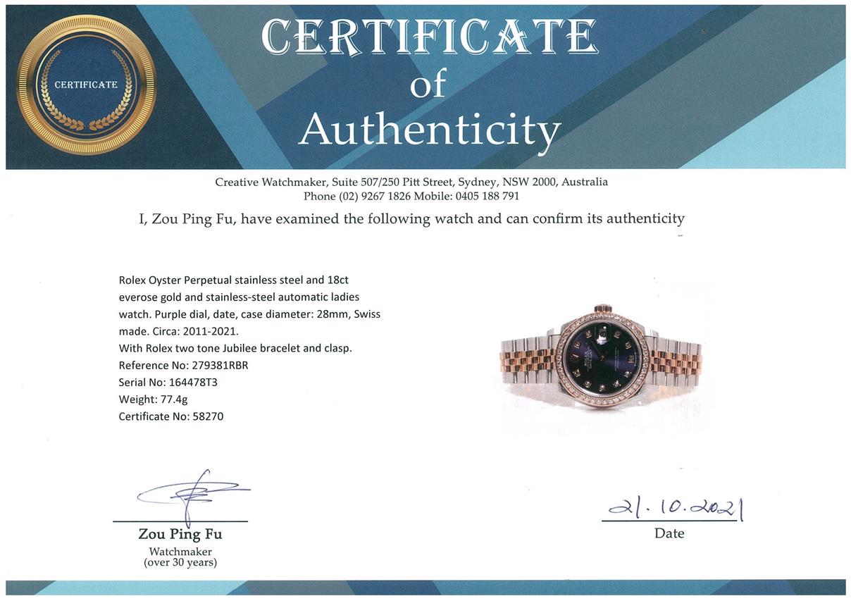 Rolex Oyster Perpetual stainless steel and 18ct everose gold and stainless steel automatic ladies watch. Diamond set bezel, purple Diamond set dial, date, case diameter: 28mm, wrist size: 16cm, Swiss made. Ref# 279381RBR. Circa: 2011-2021. With Rolex two tone Jubilee bracelet and clasp. With Certificate of Authenticity, Rolex International Guarantee card dated 30/05/2020 and Rolex box. 3 month FSA warranty. (Pre-owned)