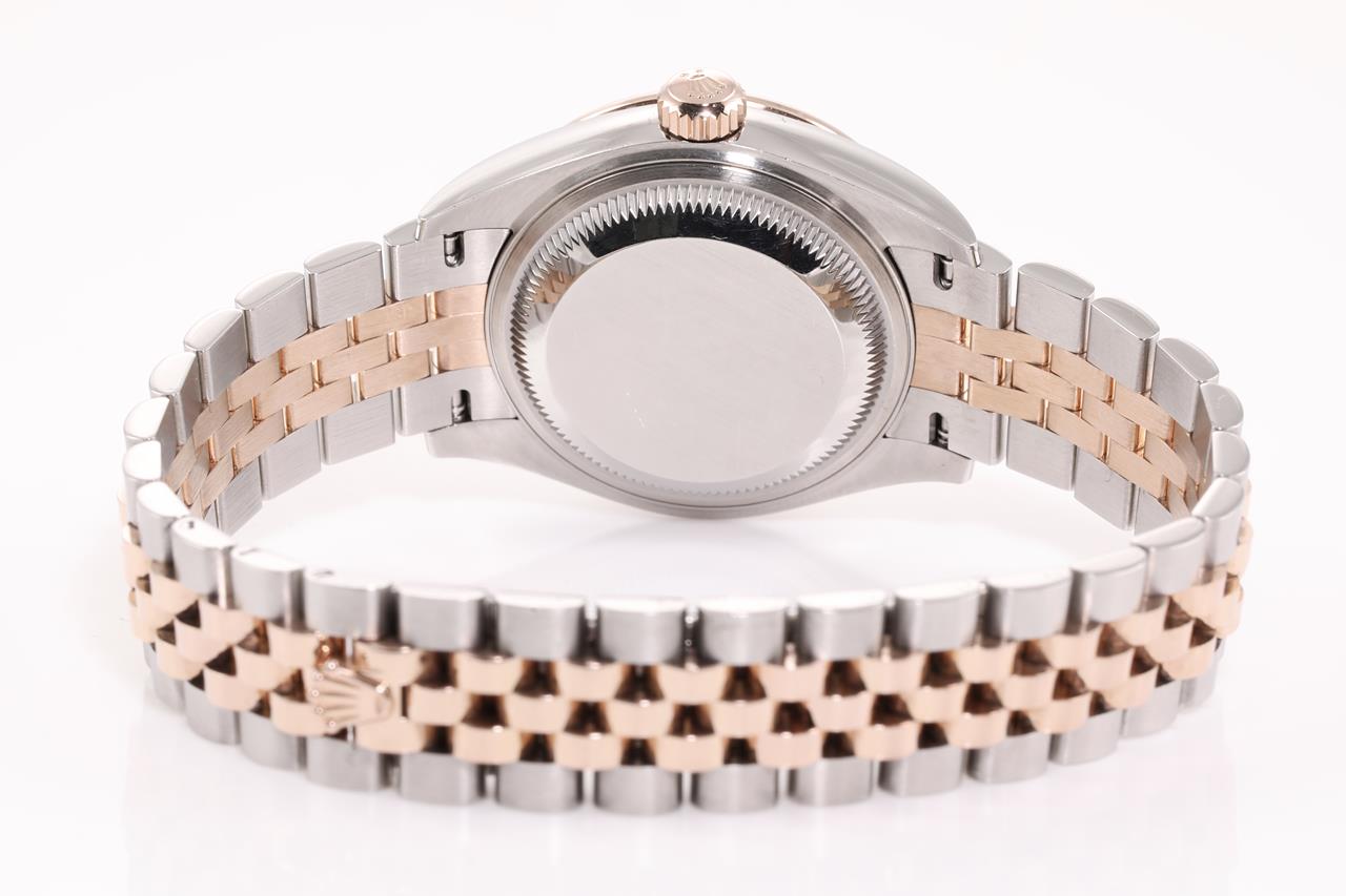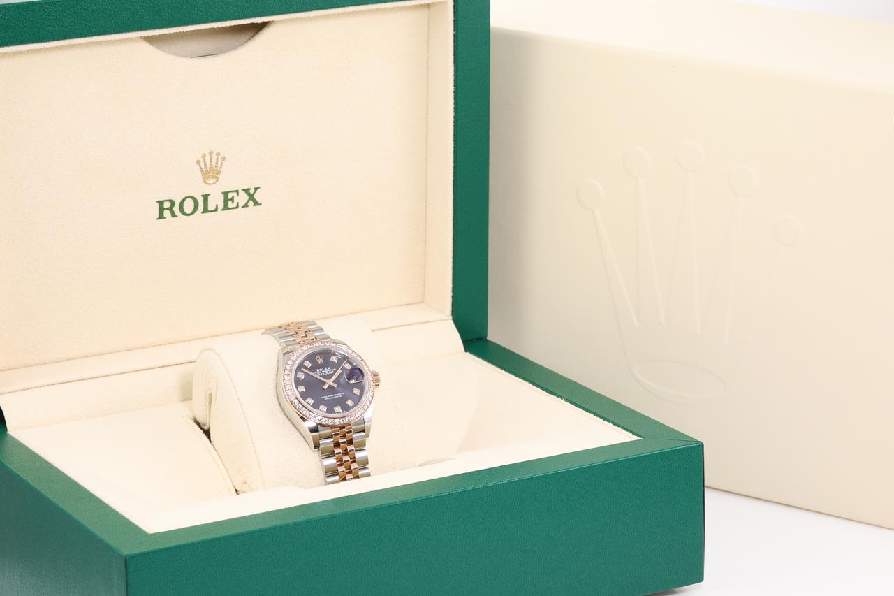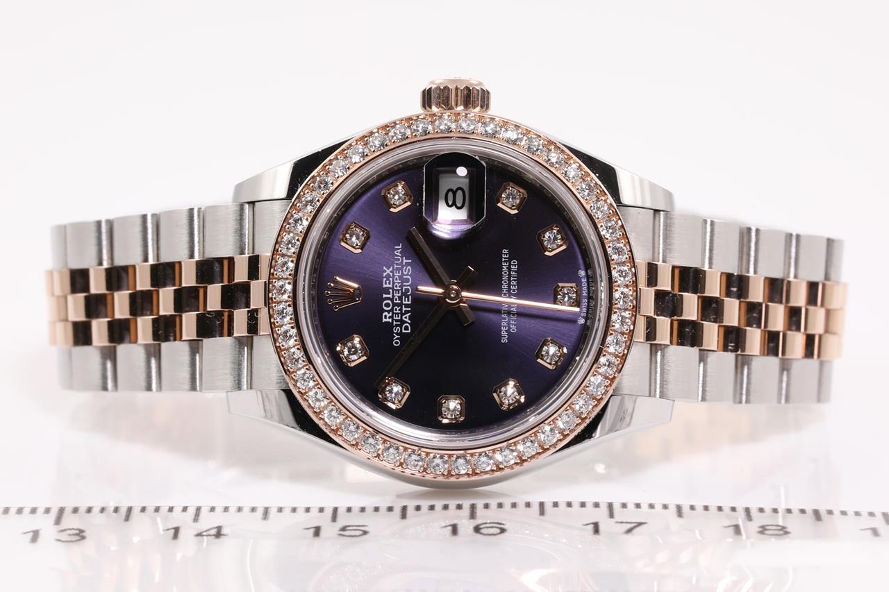 Rolex Oyster Perpetual stainless steel and 18ct everose gold and stainless steel automatic ladies watch. Diamond set bezel, purple Diamond set dial, date, case diameter: 28mm, wrist size: 16cm, Swiss made. Ref# 279381RBR. Circa: 2011-2021. With Rolex two tone Jubilee bracelet and clasp. With Certificate of Authenticity, Rolex International Guarantee card dated 30/05/2020 and Rolex box. 3 month FSA warranty. (Pre-owned)