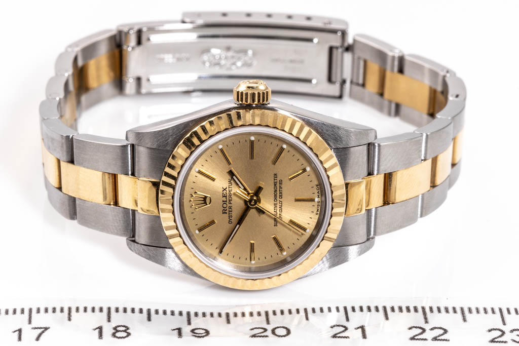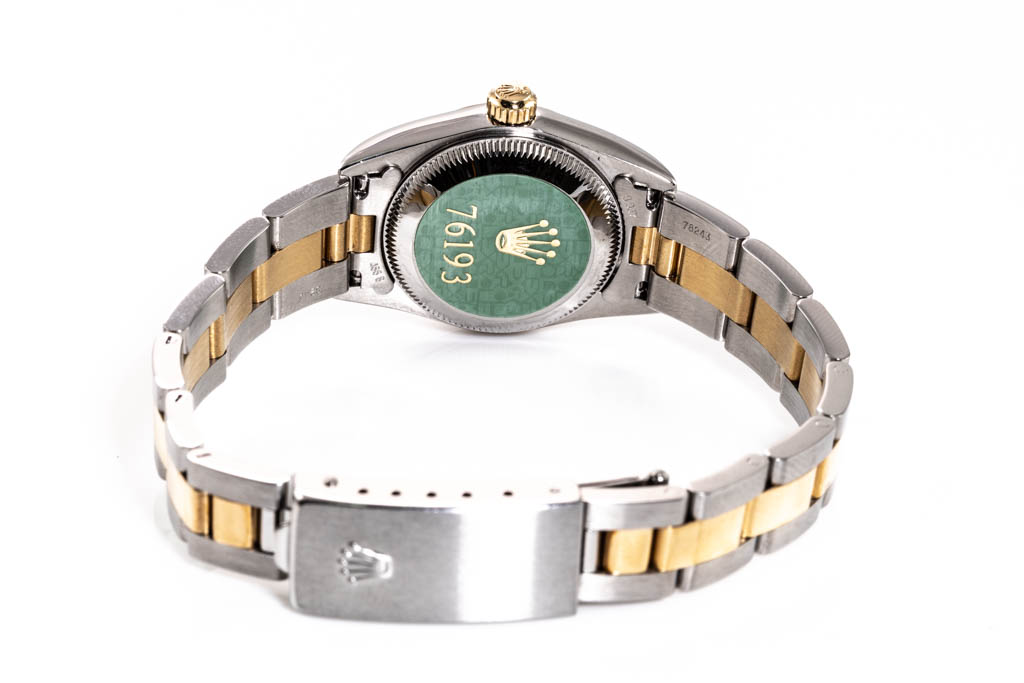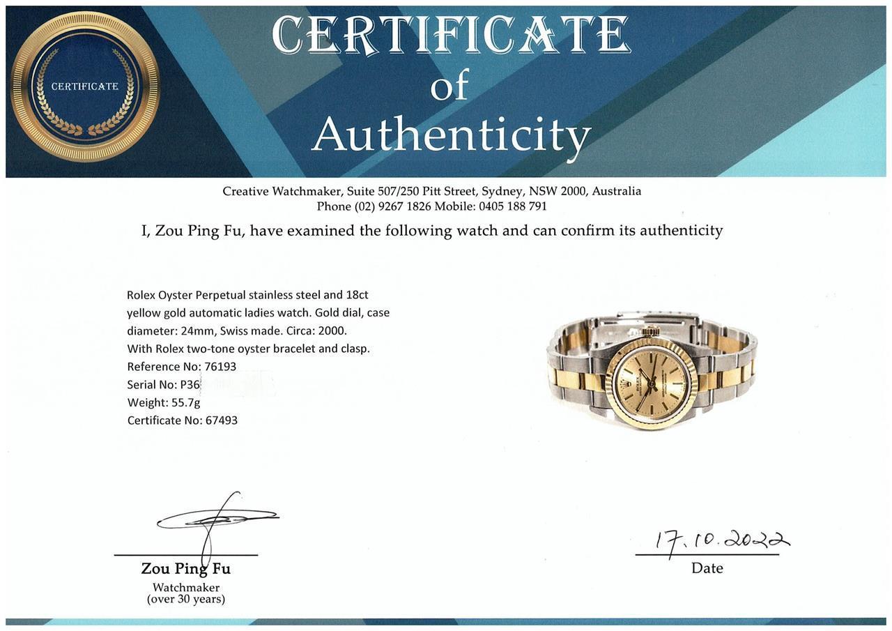Rolex Oyster Perpetual stainless steel and 18ct yellow gold automatic ladies watch. Gold dial, case diameter: 24mm, wrist size: 17cm, Swiss made. Ref# 76193. Circa: 2000. With Rolex two-tone oyster bracelet and clasp. With Certificate of Authenticity, Rolex Guarantee Certificate and Rolex box. 3 month FSA warranty. (Pre-owned)