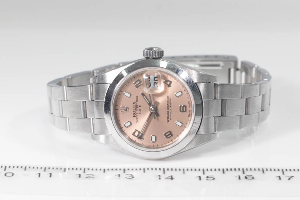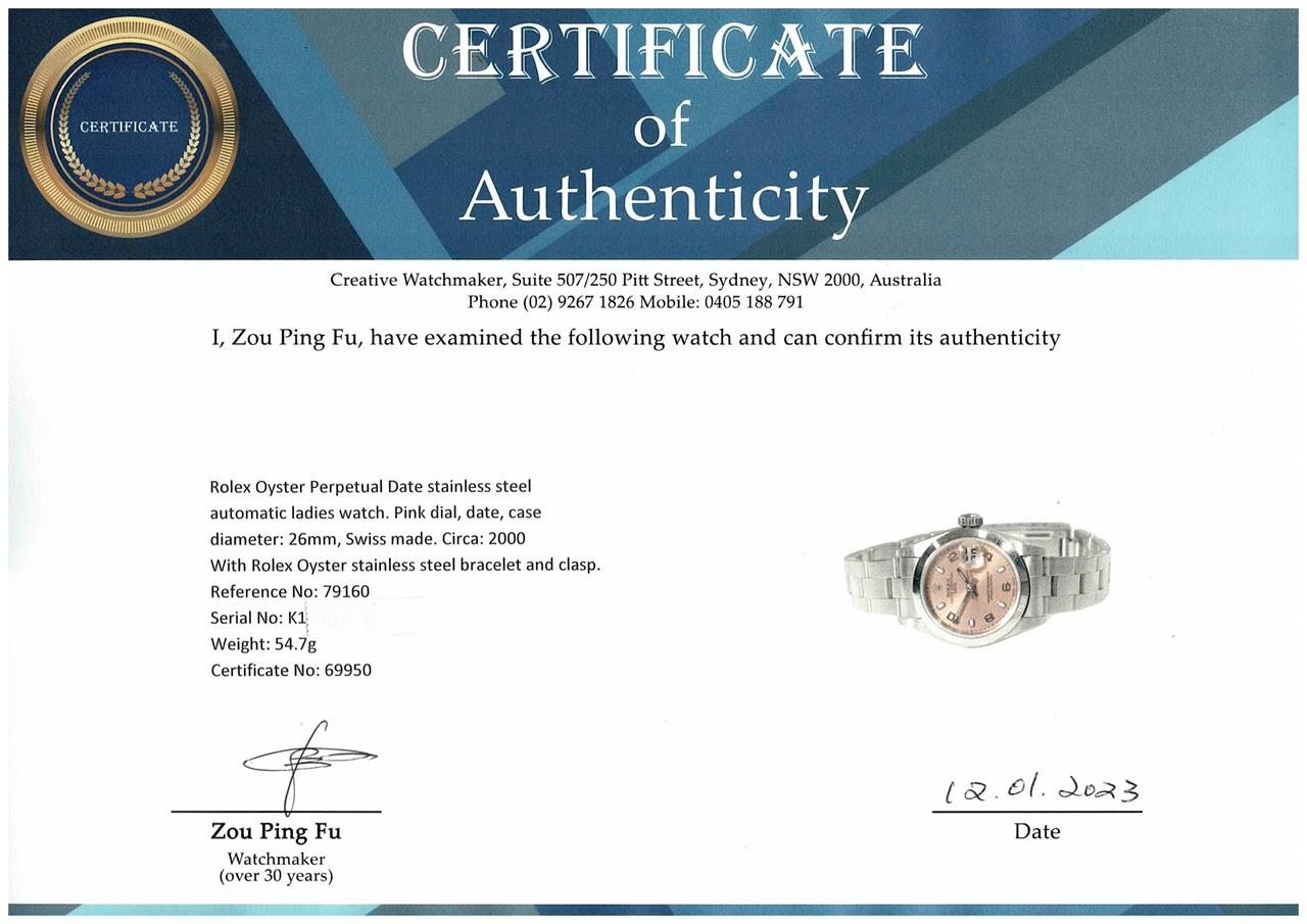 Rolex Oyster Perpetual Date stainless steel automatic ladies watch. Pink dial, date, case diameter: 26mm, wrist size: 16.5cm, Swiss made. Ref# 79160, Circa: 2000. With Rolex Oyster stainless steel bracelet and clasp. With Certificate of Authenticity, Rolex Guarantee Certificate dated 09/2001 and Rolex box. 3 month FSA warranty (Pre-owned)