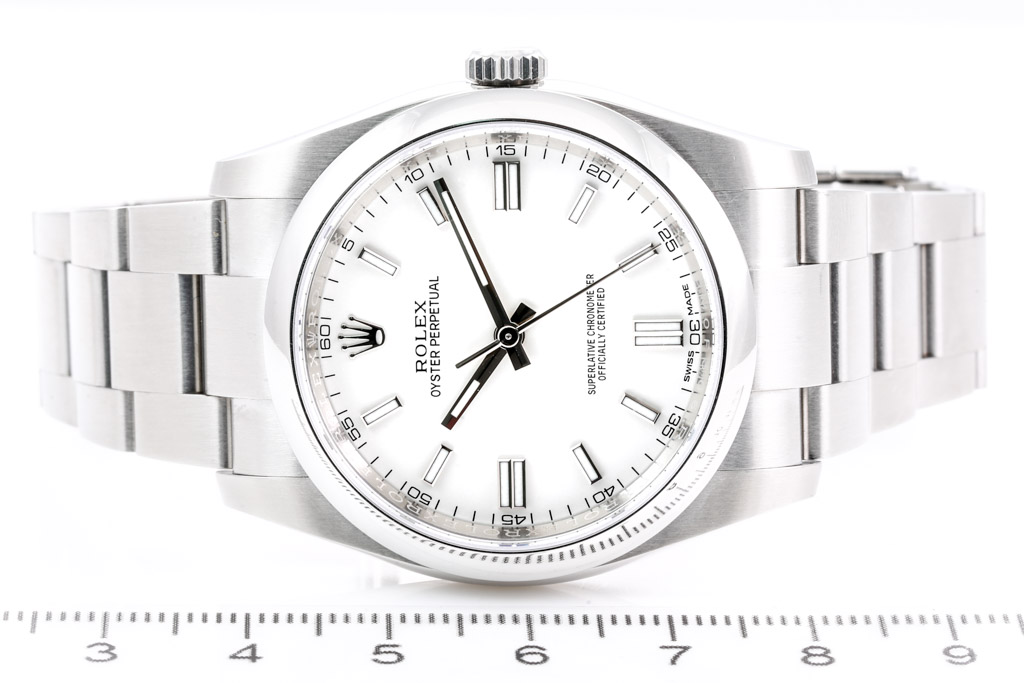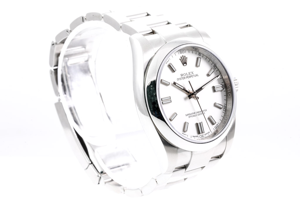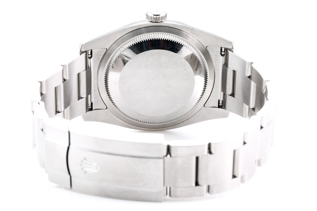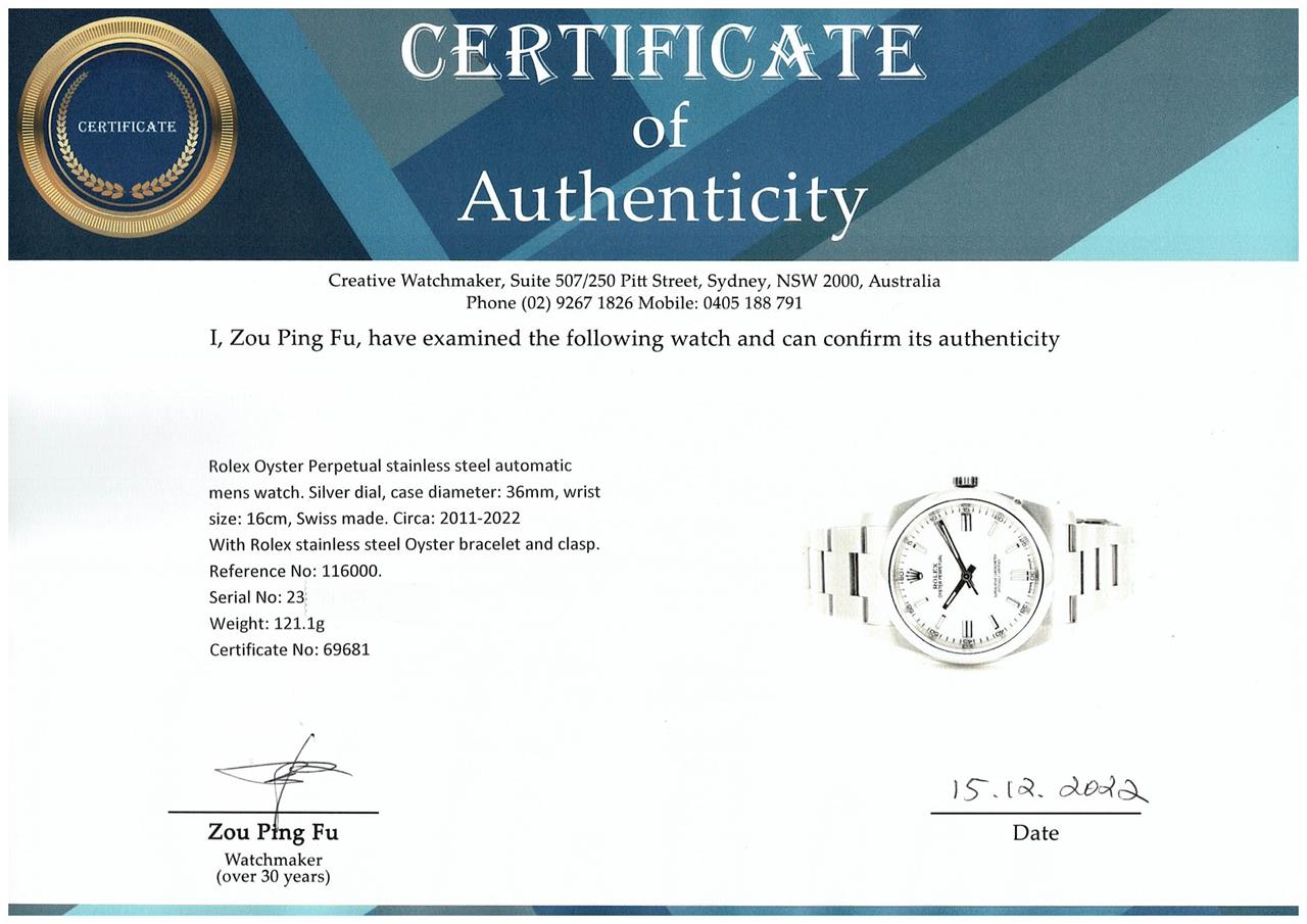 Rolex Oyster Perpetual stainless steel automatic mens watch. Silver dial, case diameter: 36mm, wrist size: 16cm, Swiss made. Ref# 116000. Circa: 2011-2022. With Rolex stainless steel Oyster bracelet and clasp. With Certificate of Authenticity and Rolex box. 3 month FSA warranty. (Pre-owned)