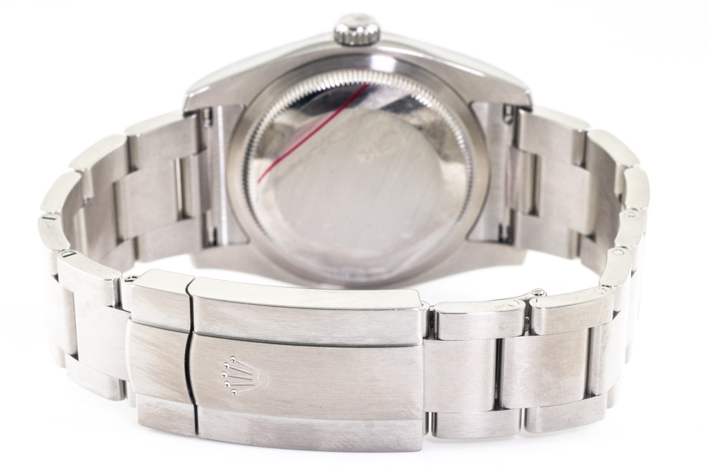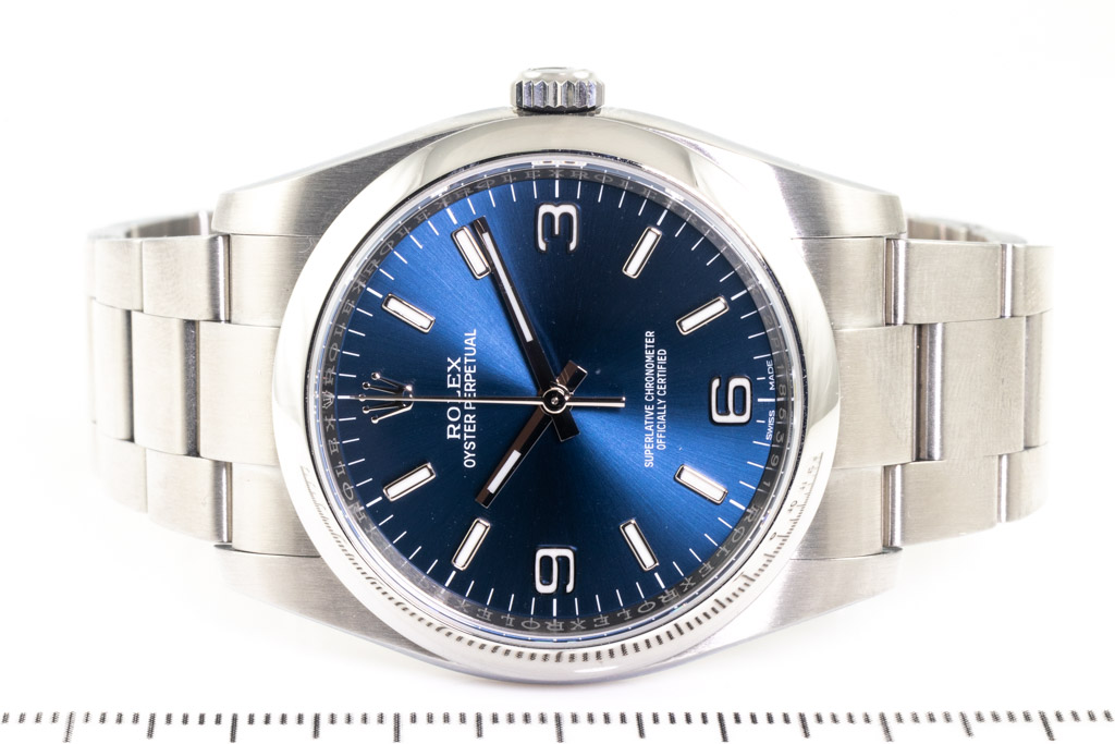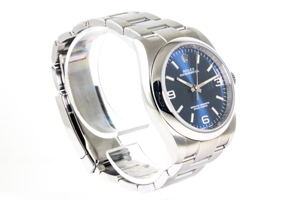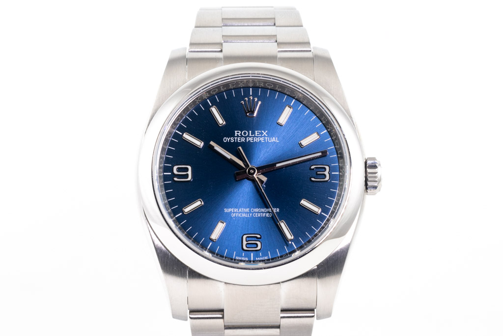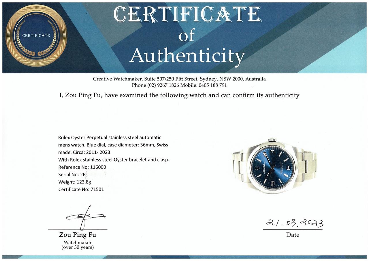 Rolex Oyster Perpetual stainless steel automatic mens watch. Blue dial, case diameter: 36mm, wrist size: 18cm, Swiss made. Ref# 116000, Circa: 2011- 2023. With Rolex stainless steel Oyster bracelet and clasp. With Certificate of Authenticity, Rolex International Warranty Card dated 12/09/2019 and Rolex box . 3 month FSA warranty (Pre-owned)
