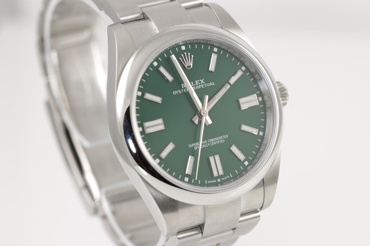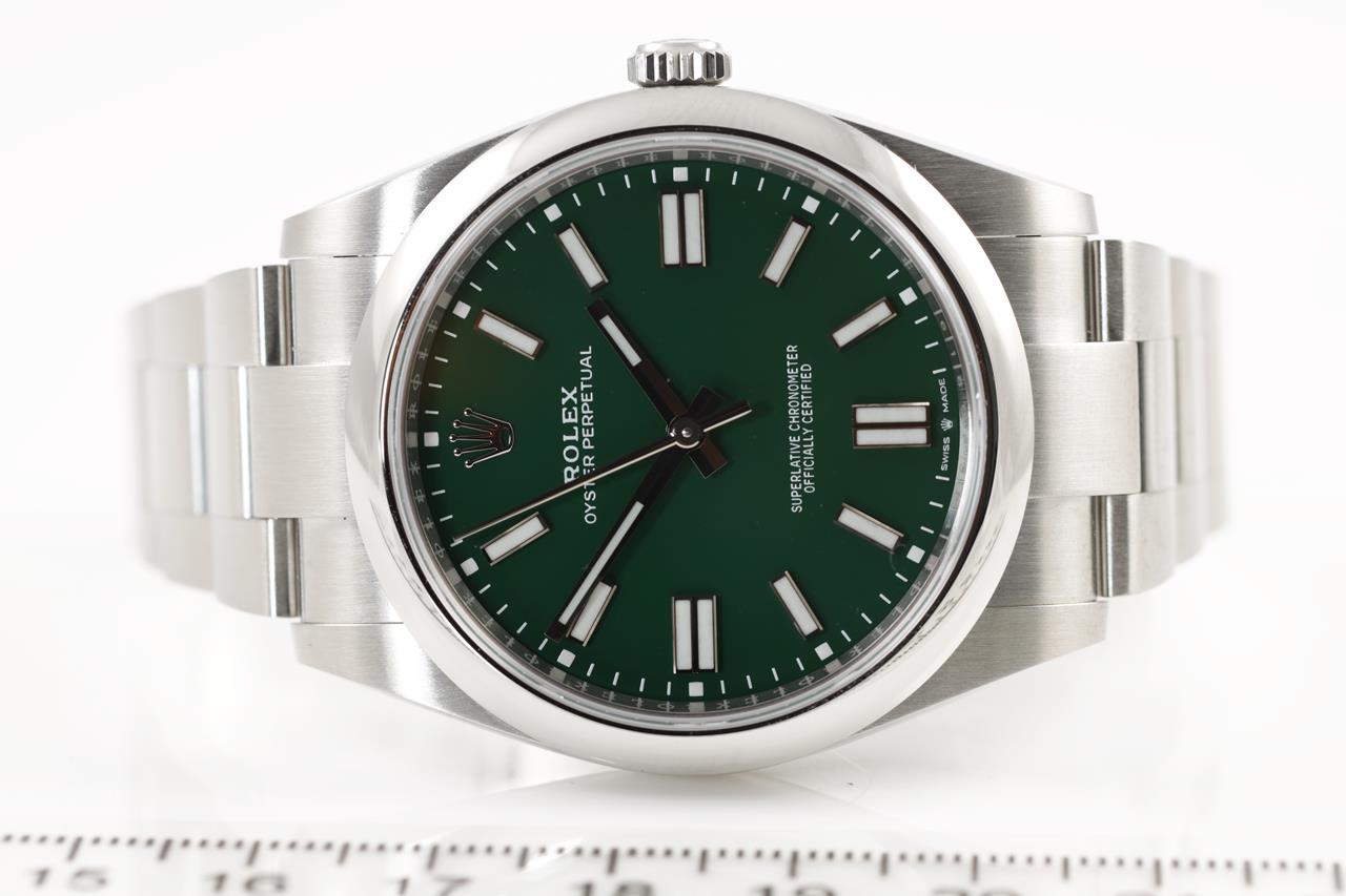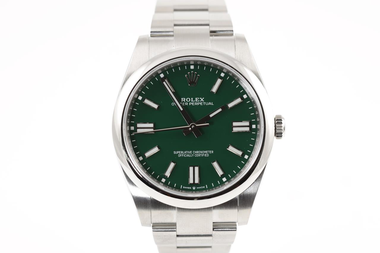 Rolex Oyster Perpetual stainless steel automatic watch. Green dial, case diameter: 41mm, wrist size: 18cm, Swiss made, Swiss made. Ref# 124300, Circa: 2011-2021. With Rolex stainless steel Oyster bracelet and clasp. With certificate of authenticity, Rolex international guarantee card dated 12/08/2021 and Rolex box. 3 month FSA warranty. (Pre-owned)