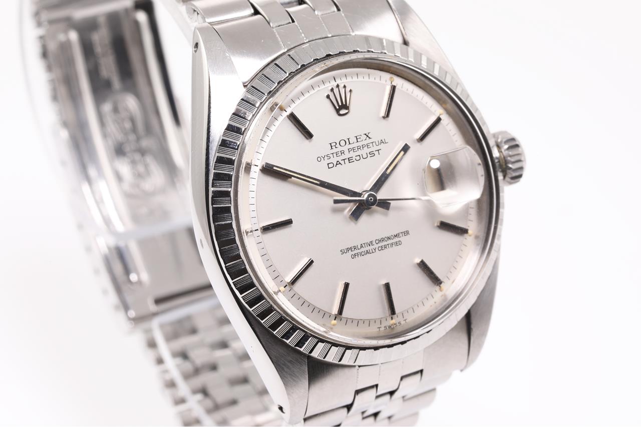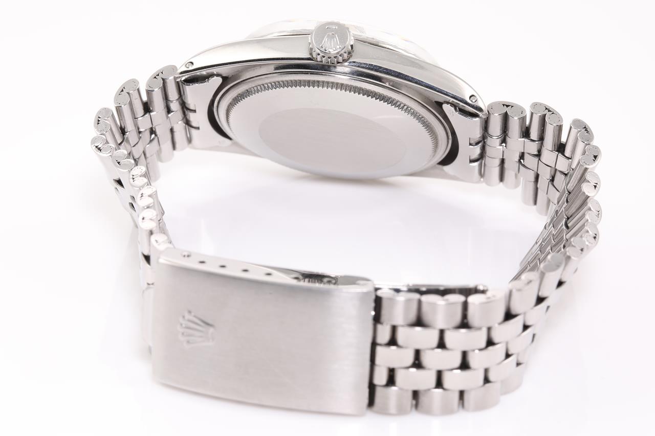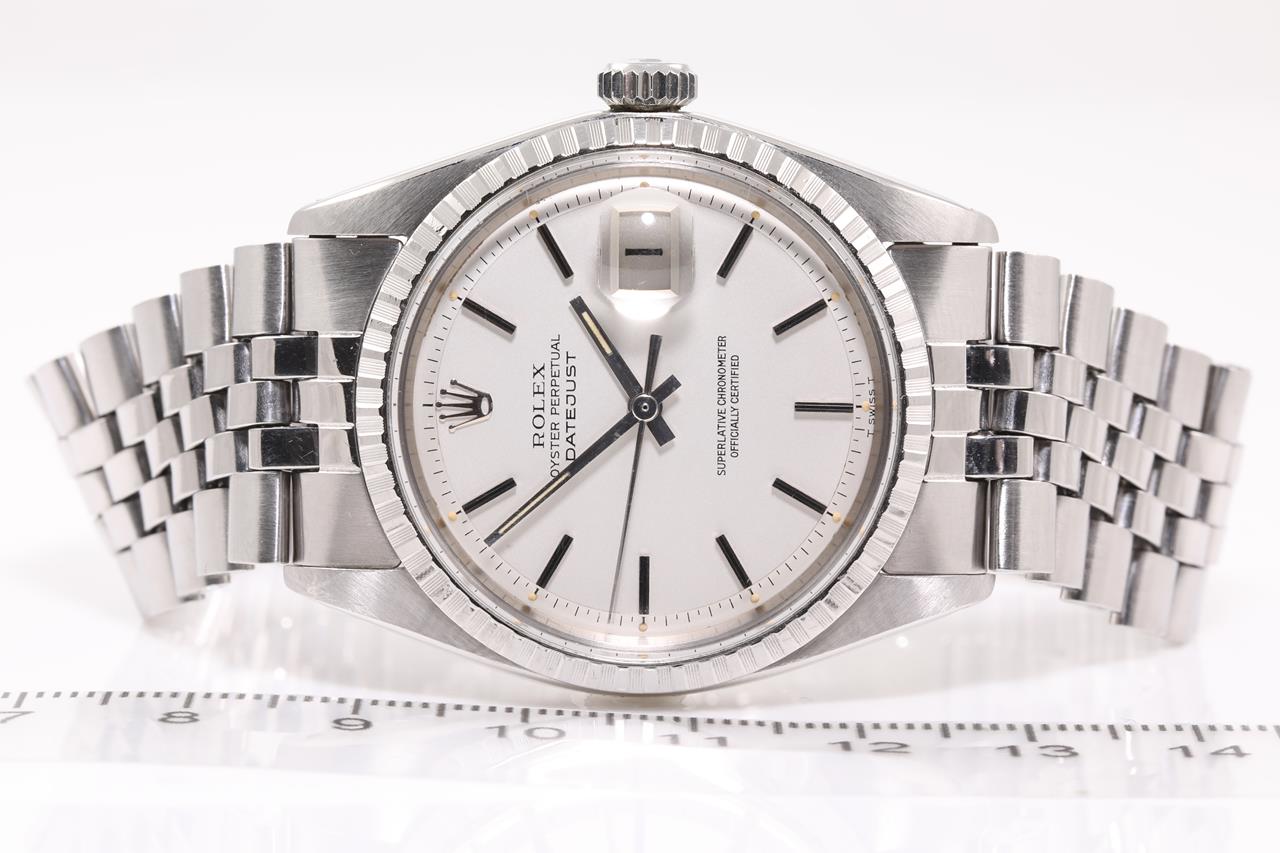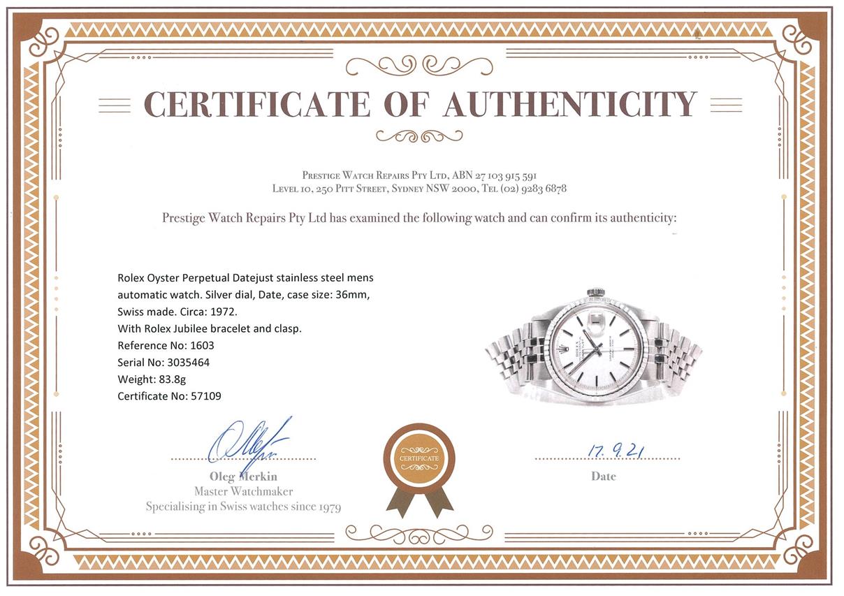 Rolex Oyster Perpetual Datejust stainless steel mens automatic watch. Silver dial, Date, case size: 36mm, wrist size: 18.5cm, Swiss made. Circa: 1972. Ref: #1603. With Rolex Jubilee bracelet and clasp. With certificate of authenticity and Rolex box. 3 months FSA warranty. (Pre-owned)