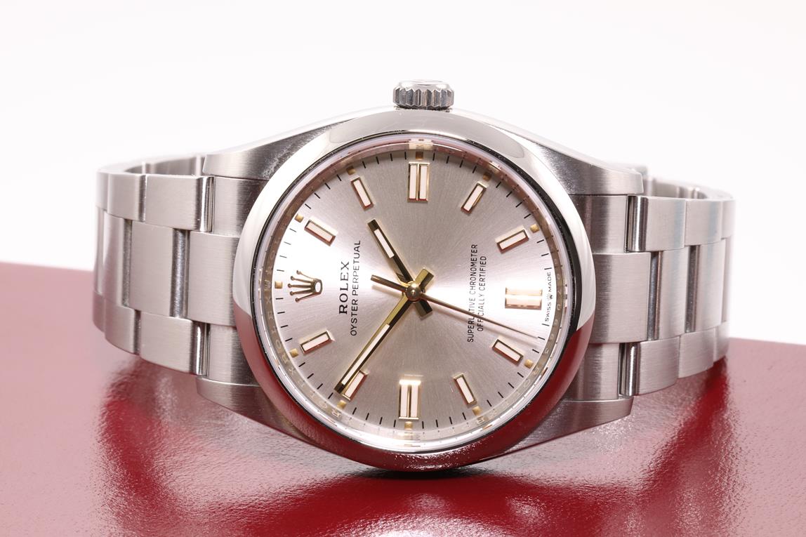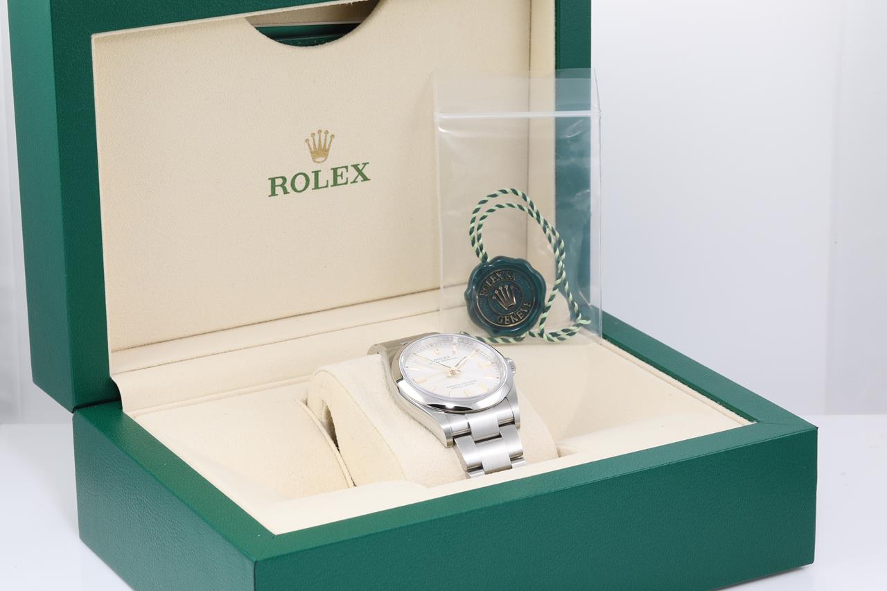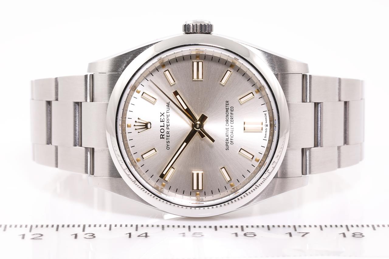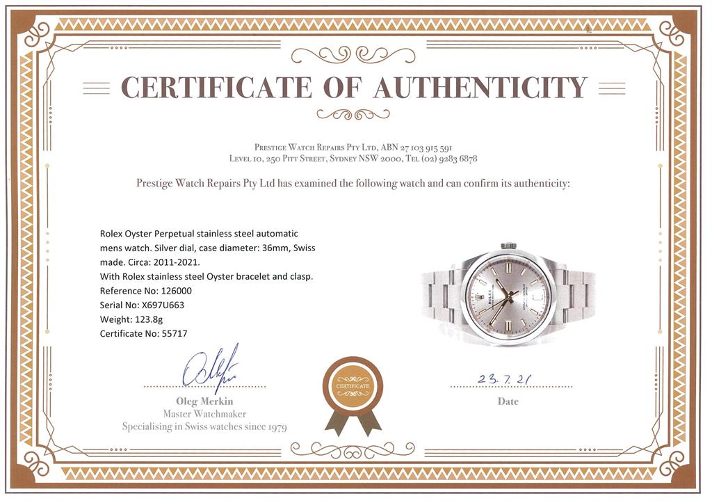 Rolex Oyster Perpetual stainless steel automatic mens watch. Silver dial, case diameter: 36mm, wrist size: 17.5cm, Swiss made. Ref# 126000. Circa: 2011-2021. With Rolex stainless steel Oyster bracelet and clasp. With certificate of authenticity, Rolex international guarantee certificate card and Rolex box. 3 month FSA warranty. (Pre-owned)