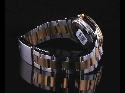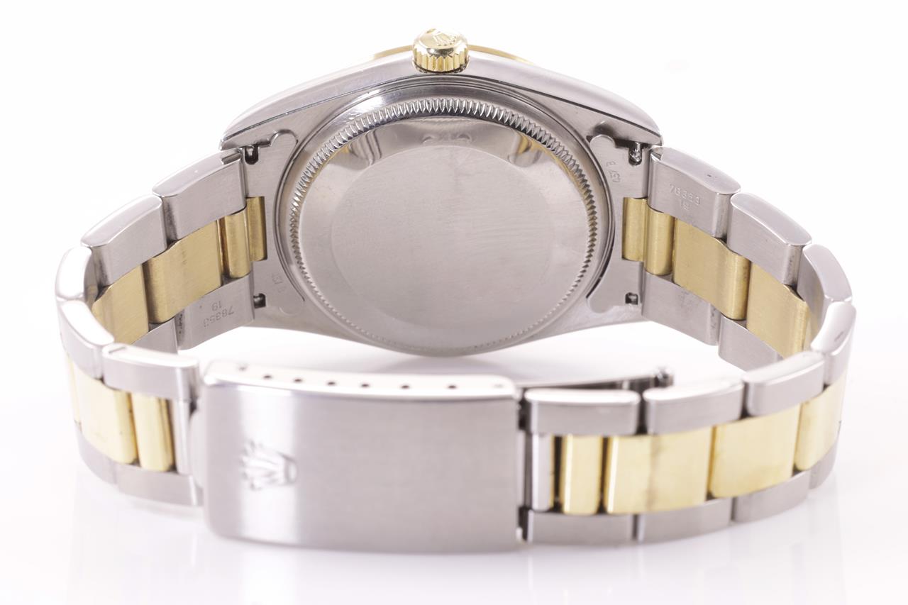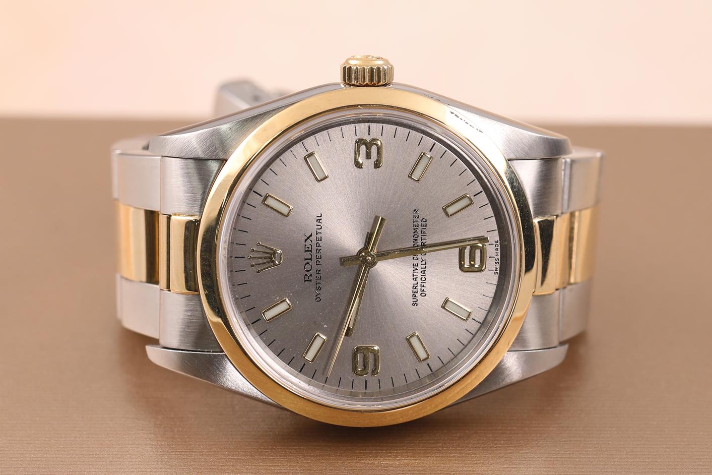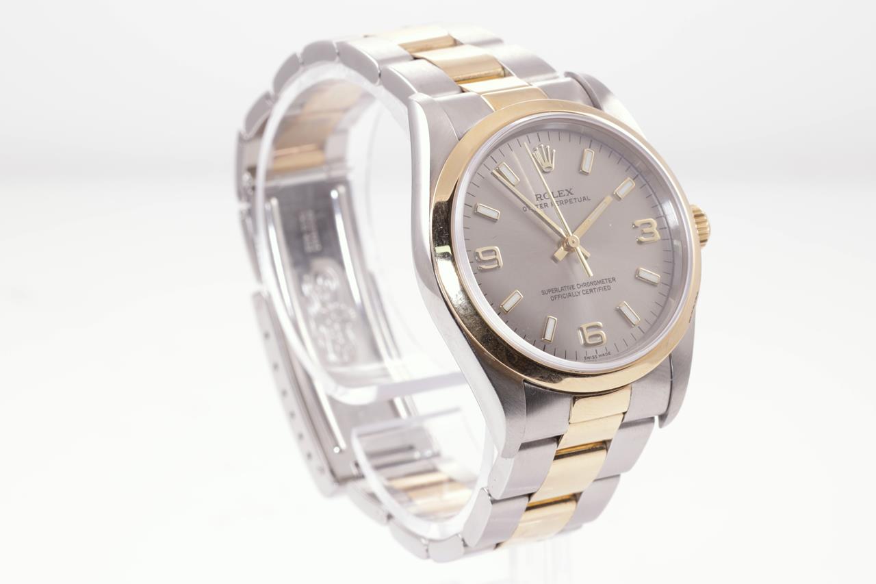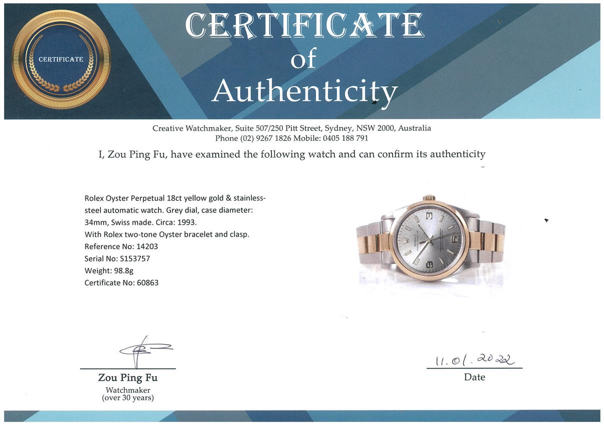 Rolex Oyster Perpetual 18ct yellow gold & stainless steel automatic watch. Grey dial, case diameter: 34mm, wrist size: 17.5cm, Swiss made. Ref# 14203, Circa: 1993. With Rolex two-tone Oyster bracelet and clasp. With Certificate of Authenticity & Rolex box with Rolex gift bag. 3 month FSA warranty. (Pre-owned)