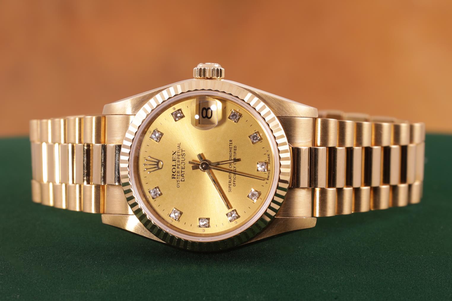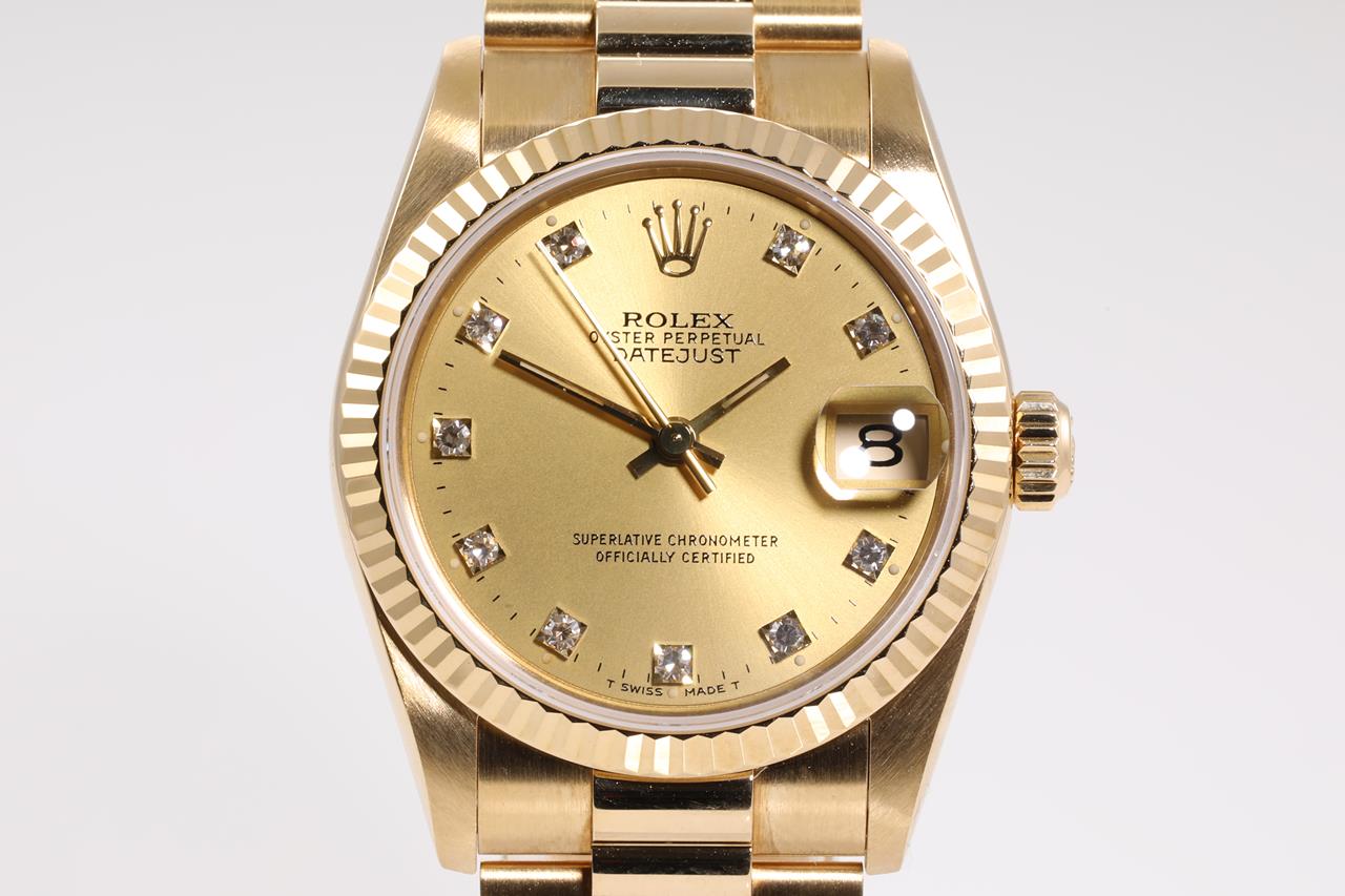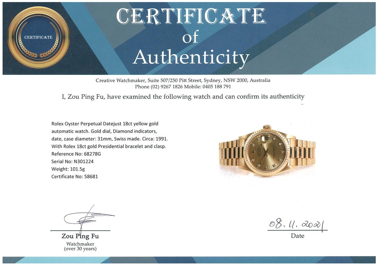 Rolex Oyster Perpetual Datejust 18ct yellow gold automatic watch. Gold dial, Diamond indicators, date, case diameter: 31mm, wrist size: 16cm, Swiss made. Ref# 68278G, Circa: 1991. With Rolex 18ct gold Presidential bracelet and clasp. With Certificate of Authenticity and Rolex box with Rolex gift bag. 3 month FSA warranty. (Pre-owned)