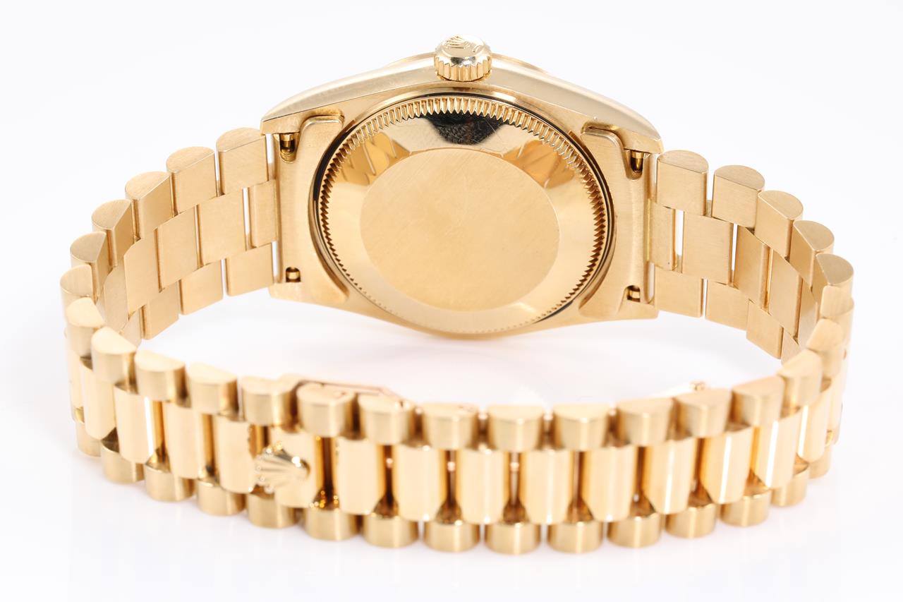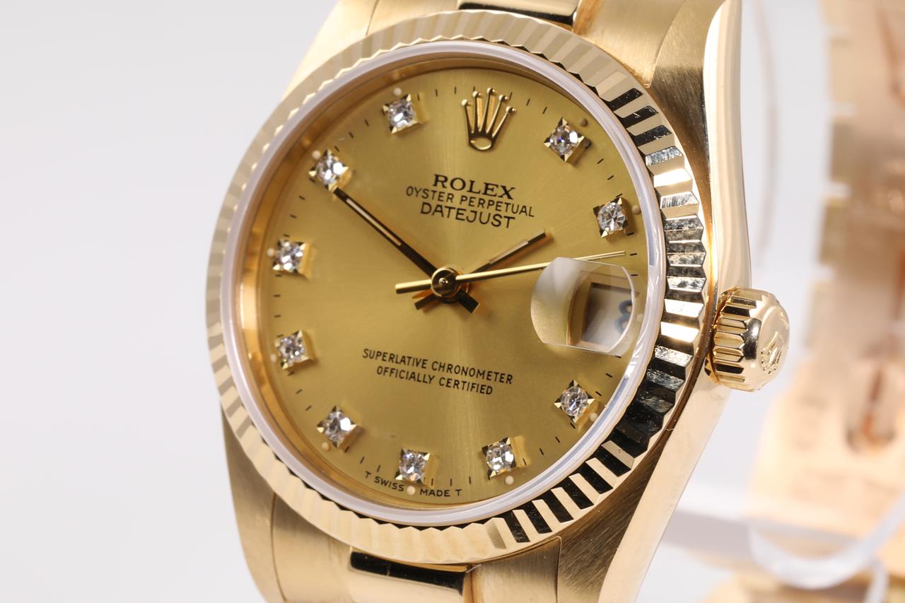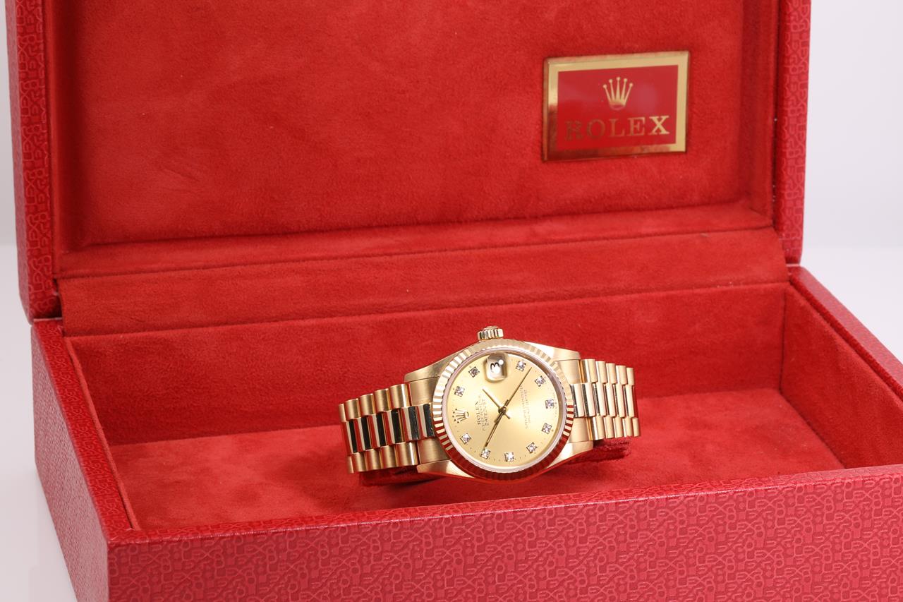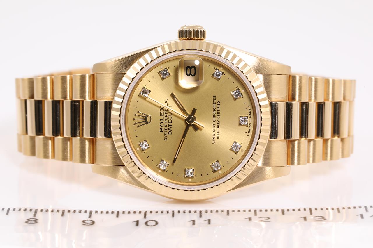 Rolex Oyster Perpetual Datejust 18ct yellow gold automatic watch. Gold dial, Diamond indicators, date, case diameter: 31mm, wrist size: 16cm, Swiss made. Ref# 68278G, Circa: 1991. With Rolex 18ct gold Presidential bracelet and clasp. With Certificate of Authenticity and Rolex box with Rolex gift bag. 3 month FSA warranty. (Pre-owned)