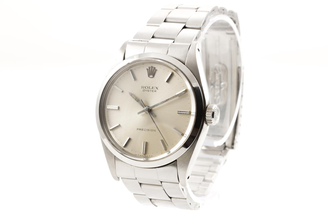 Rolex Oyster Precision Datejust stainless steel manual winding watch. White dial, wrist size: 18cm, case diameter: 34mm, Swiss Made. Ref# 6426, Circa: 1971. With Rolex stainless steel Oyster bracelet and clasp. With certificate of authenticity and Rolex box. 3 month FSA warranty. (Pre-owned)