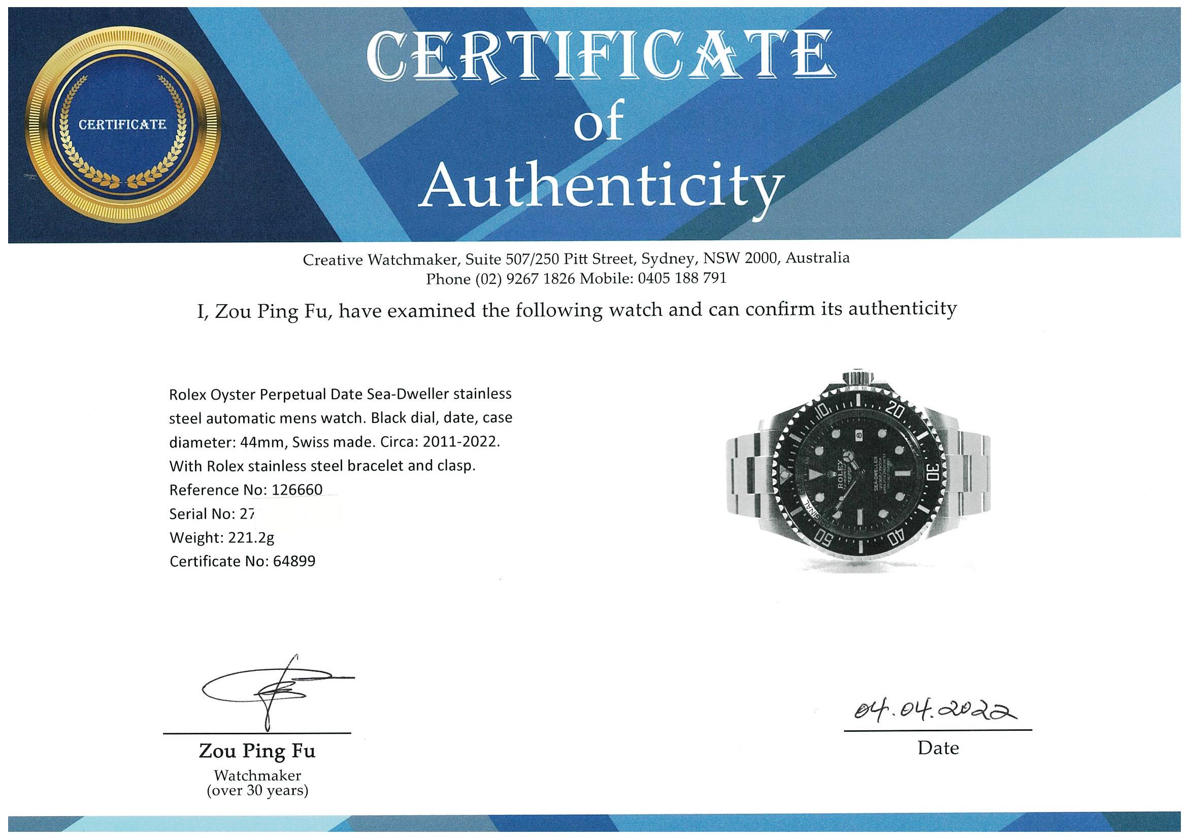 Rolex Oyster Perpetual Date Sea-Dweller stainless steel automatic mens watch. Black dial, date, case diameter: 44mm, wrist size: 19.5cm, Swiss made. Ref# 126660. Circa: 2011-2022. With Rolex stainless steel bracelet and clasp. With Certificate of Authenticity, Rolex International Warranty Card dated 31/12/2020 and Rolex box. 3 month FSA warranty. (Pre-owned)