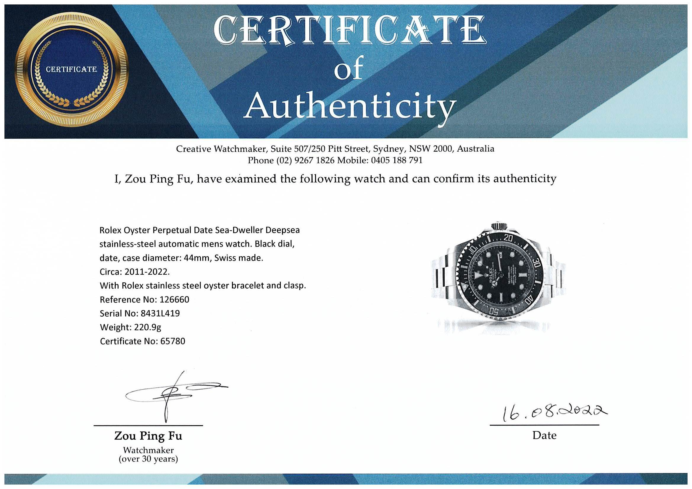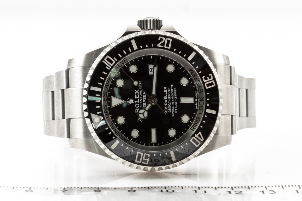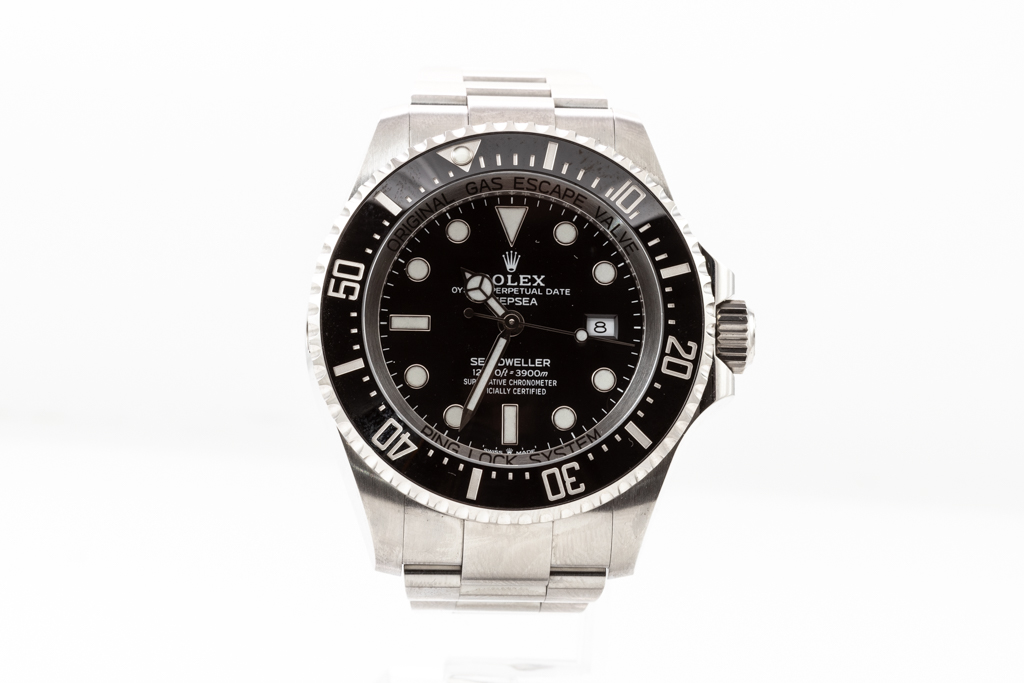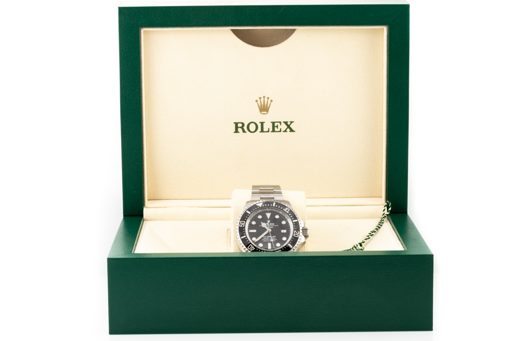 Rolex Oyster Perpetual Date Sea-Dweller Deepsea stainless steel automatic mens watch. Black dial, date, case diameter: 44mm, wrist size: 19cm, Swiss made. Ref# 126660. Circa: 2011-2022. With Rolex stainless steel oyster bracelet and clasp. With Certificate of Authenticity, Rolex International Guarantee Card dated 05/05/2020 and Rolex box. 3 month FSA warranty. (Pre-owned)