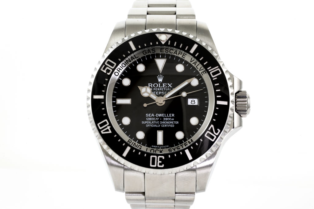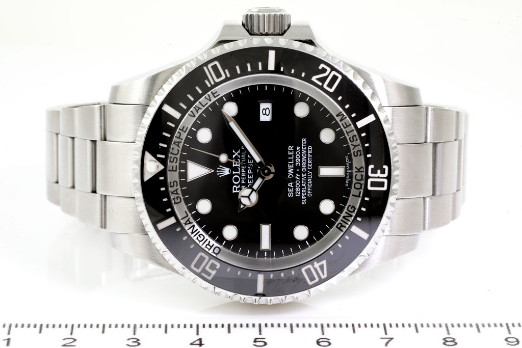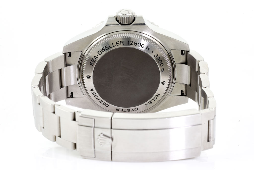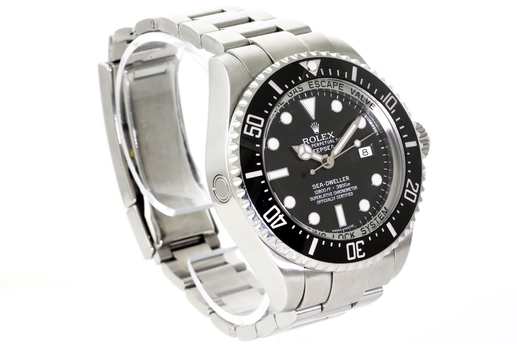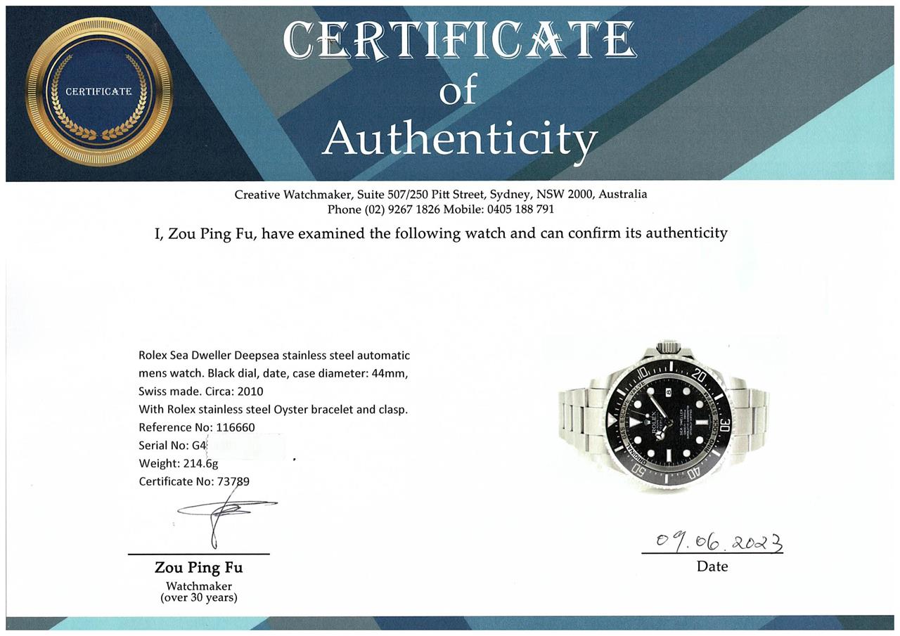 Rolex Sea Dweller Deepsea stainless steel automatic mens watch. Black dial, date, case diameter: 44mm, wrist size: 20cm, Swiss made. Ref# 116660. Circa: 2010. With Rolex stainless steel Oyster bracelet and clasp. With Certificate of Authenticity, Rolex International Guarantee Card dated 25/08/2012 and Rolex box. 3 month FSA warranty (Pre-owned).