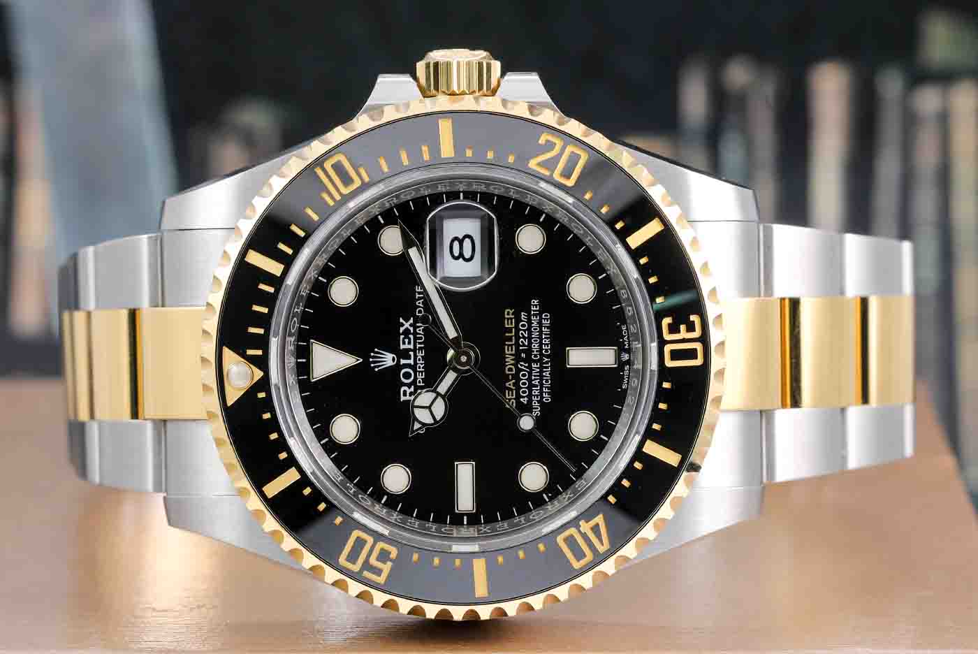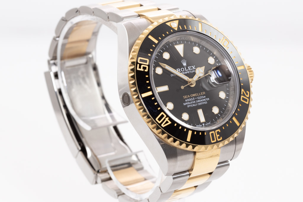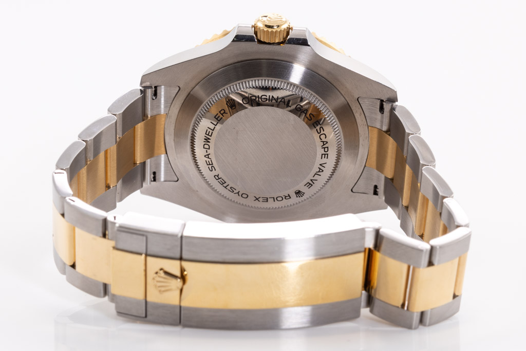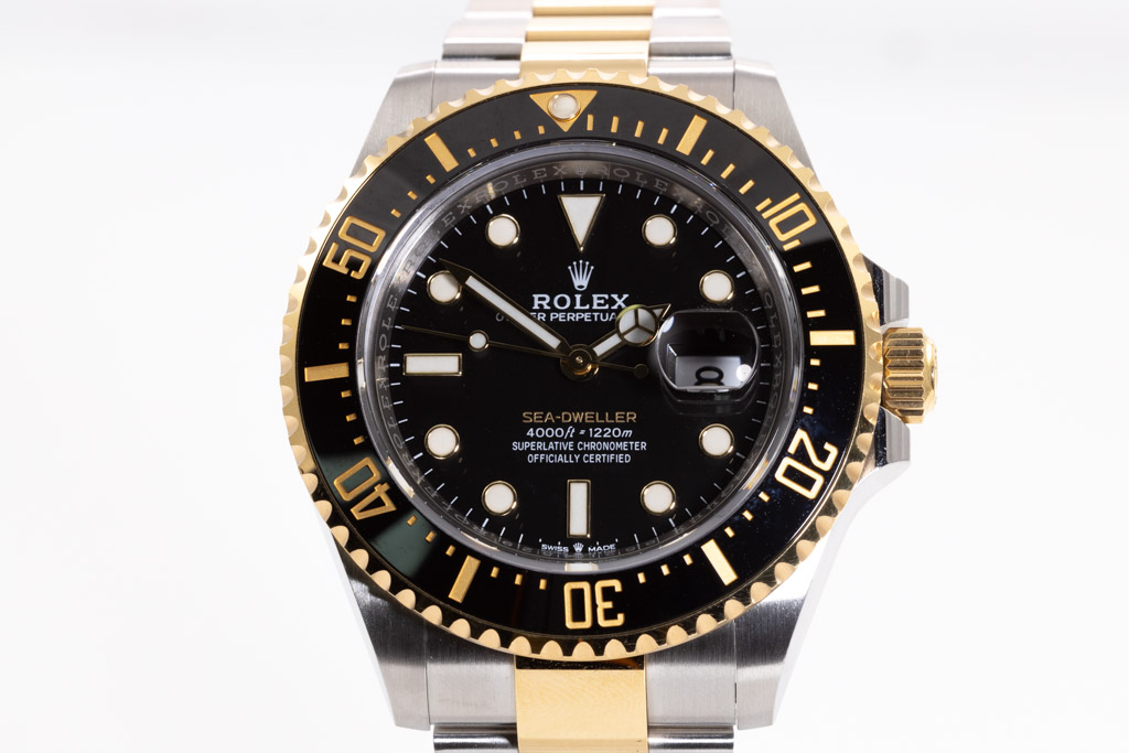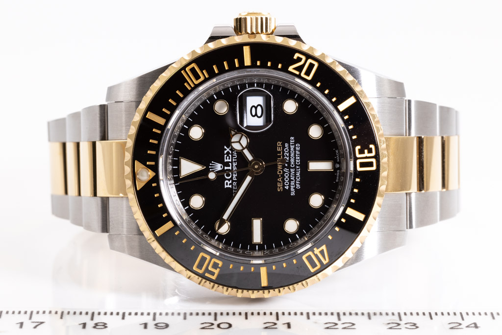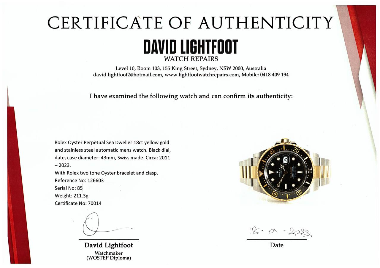 Rolex Oyster Perpetual Sea Dweller 18ct yellow gold and stainless steel automatic mens watch. Black dial, date, case diameter: 43mm, wrist size: 19.5cm, Swiss made. Ref# 126603. Circa: 2011-2023. With Rolex two tone Oyster bracelet and clasp. With Certificate of Authenticity and Rolex box. 3 month FSA warranty (Pre-owned).