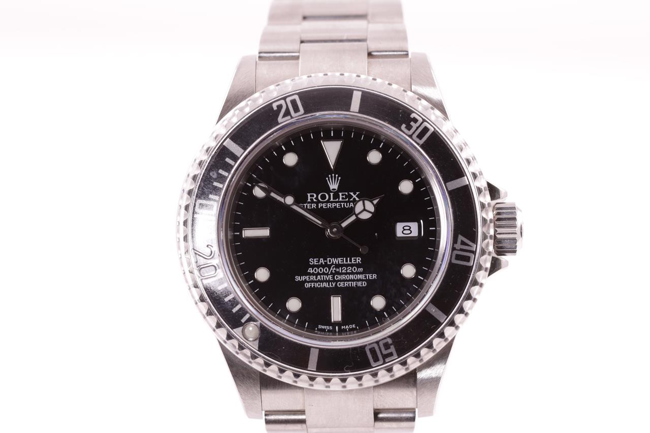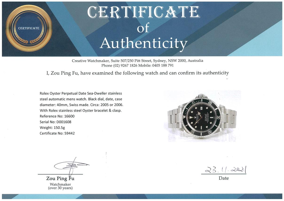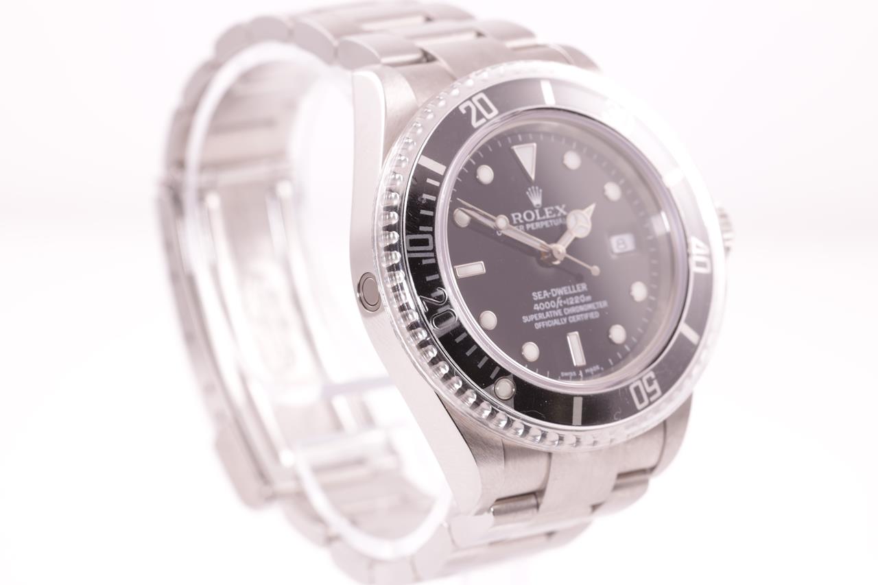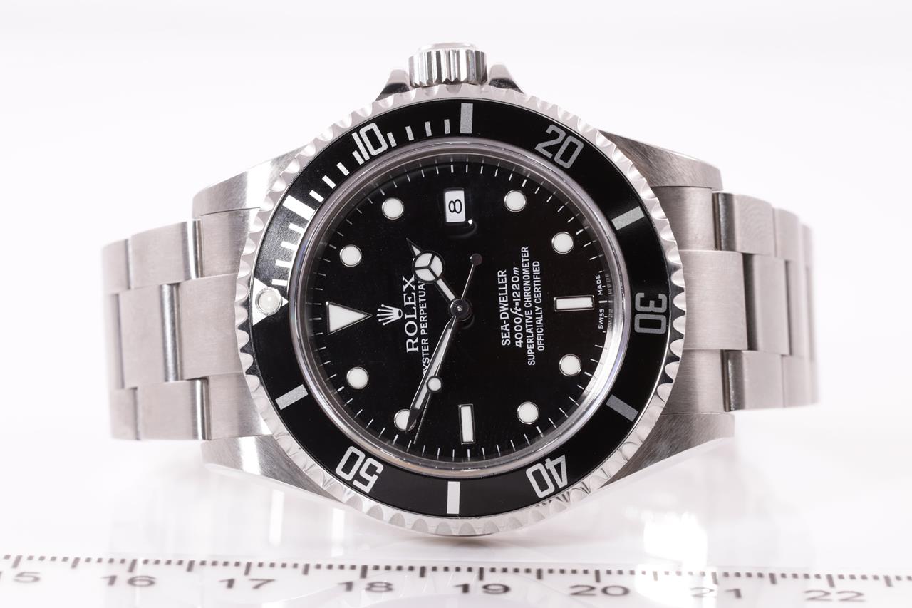 Rolex Oyster Perpetual Date Sea-Dweller stainless steel automatic mens watch. Black dial, date, case diameter: 40mm, wrist size: 18cm, Swiss made. Ref# 16600, Circa: 2005 or 2006. With Rolex stainless steel Oyster bracelet & clasp. With Certificate of Authenticity, Rolex Guarantee Certificate dated 4/7/2007 and Rolex box. 3 month FSA warranty. (Pre-owned)