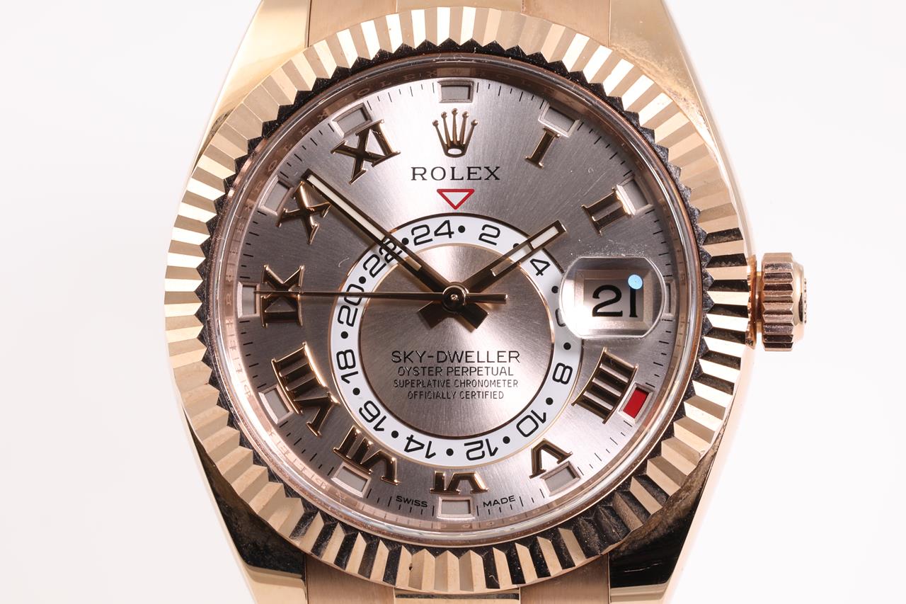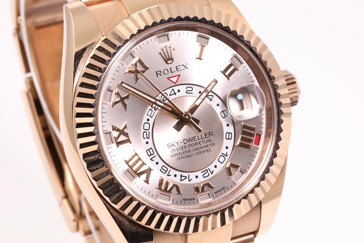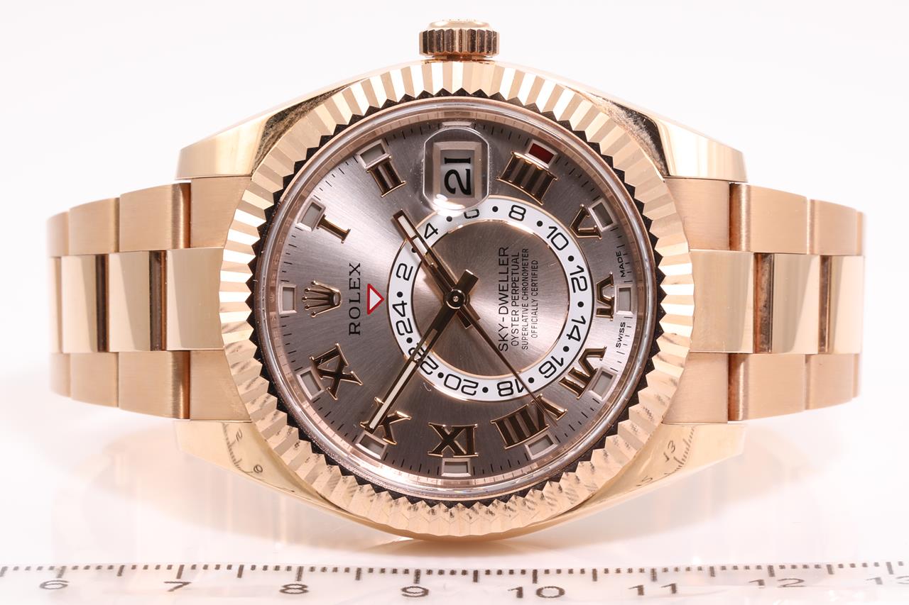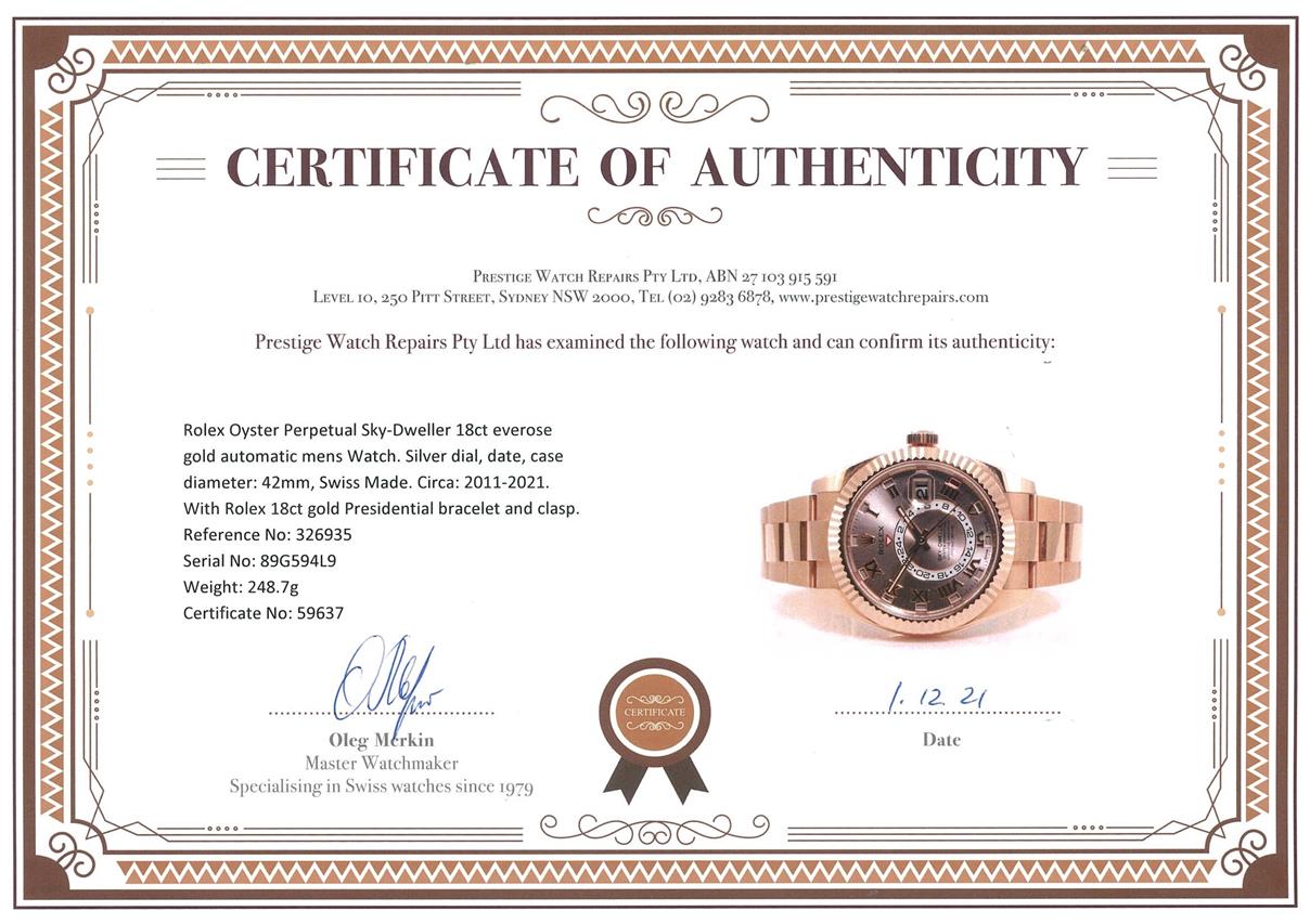Rolex Oyster Perpetual Sky-Dweller 18ct everose gold automatic mens Watch. Silver dial, date, case diameter: 42mm, wrist size: 18cm, Swiss made. Ref# 326935, Circa: 2011-2021. With Rolex 18ct gold Presidential bracelet and clasp. With Certificate of Authenticity. 3 month FSA warranty. (Pre-owned)