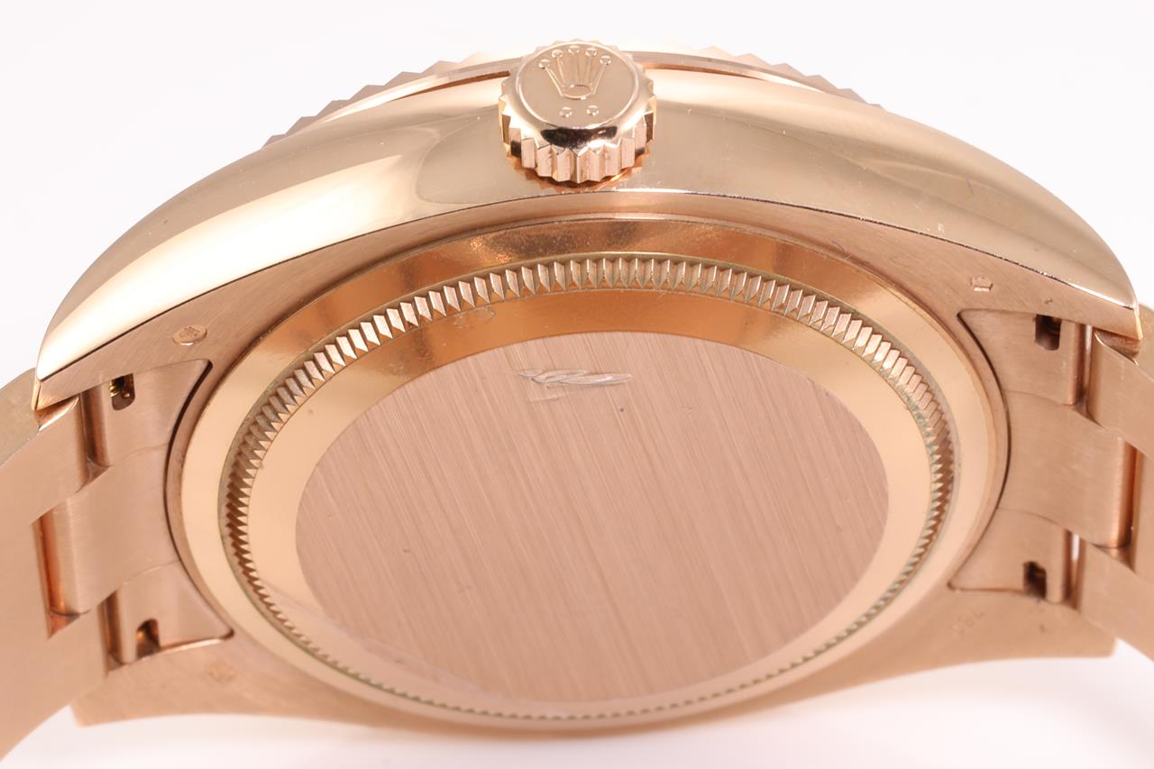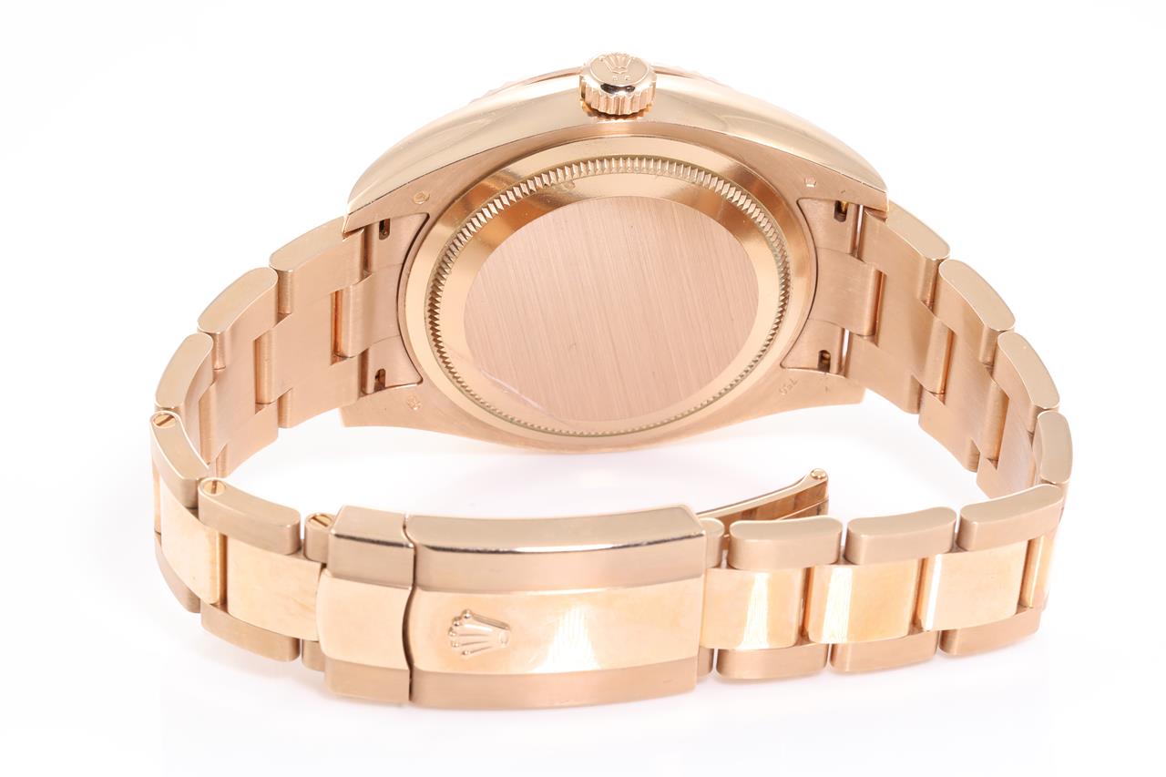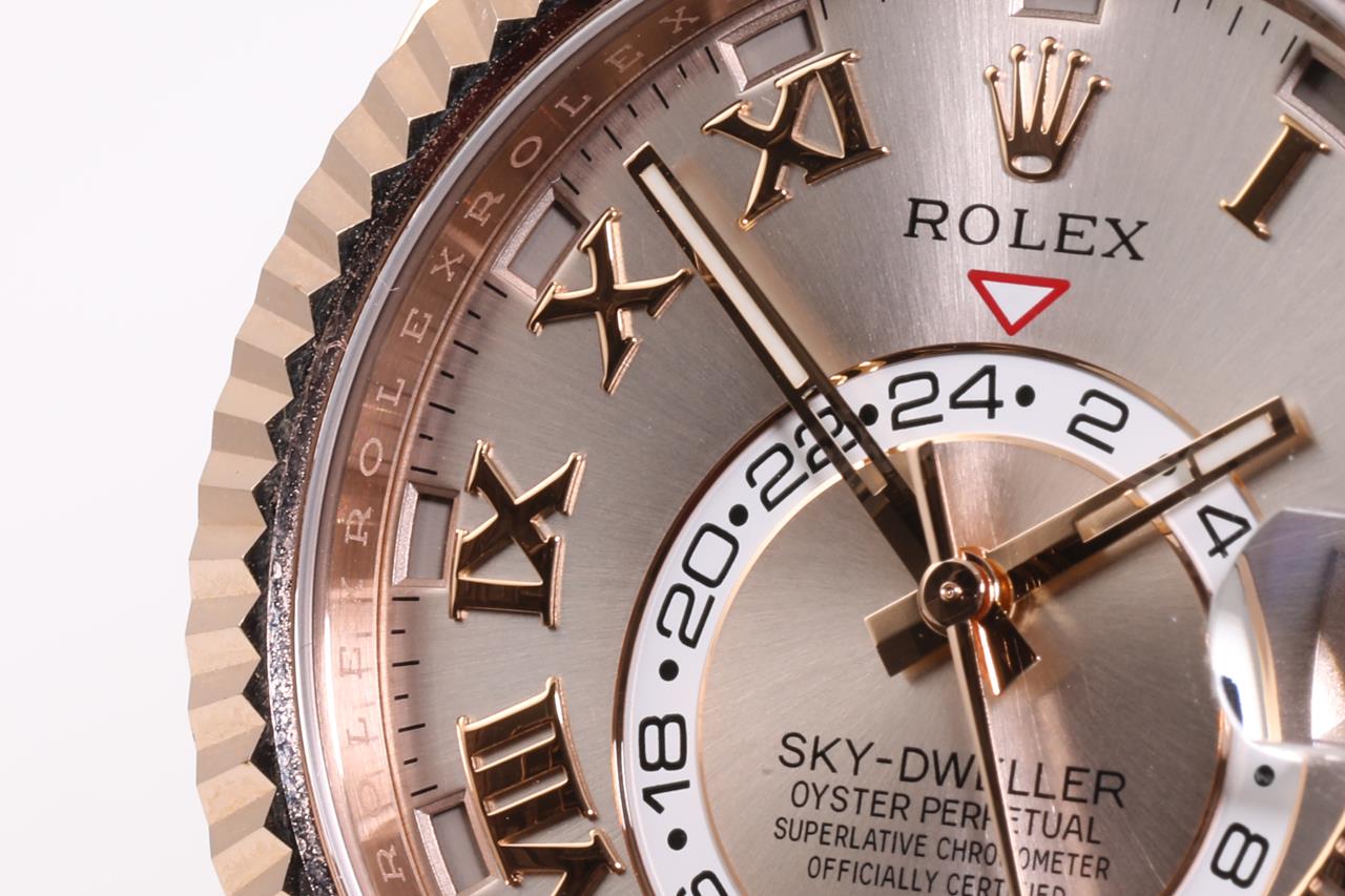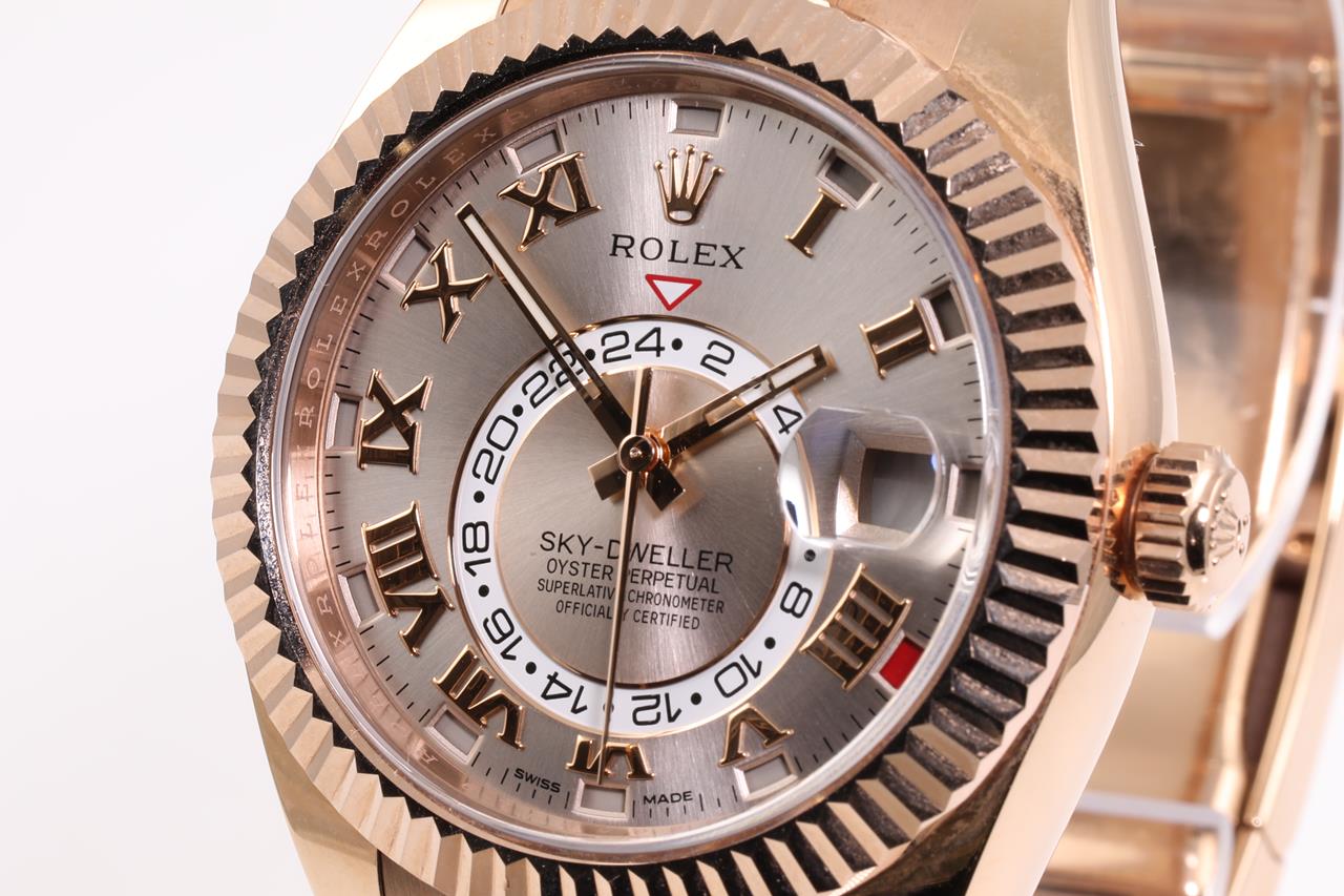 Rolex Oyster Perpetual Sky-Dweller 18ct everose gold automatic mens Watch. Silver dial, date, case diameter: 42mm, wrist size: 18cm, Swiss made. Ref# 326935, Circa: 2011-2021. With Rolex 18ct gold Presidential bracelet and clasp. With Certificate of Authenticity. 3 month FSA warranty. (Pre-owned)